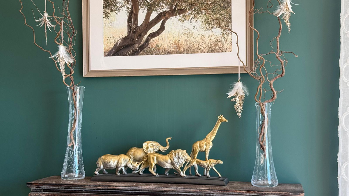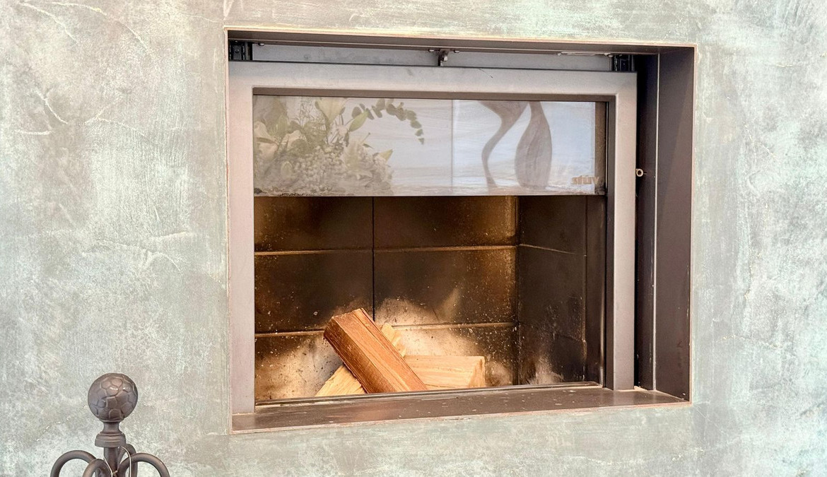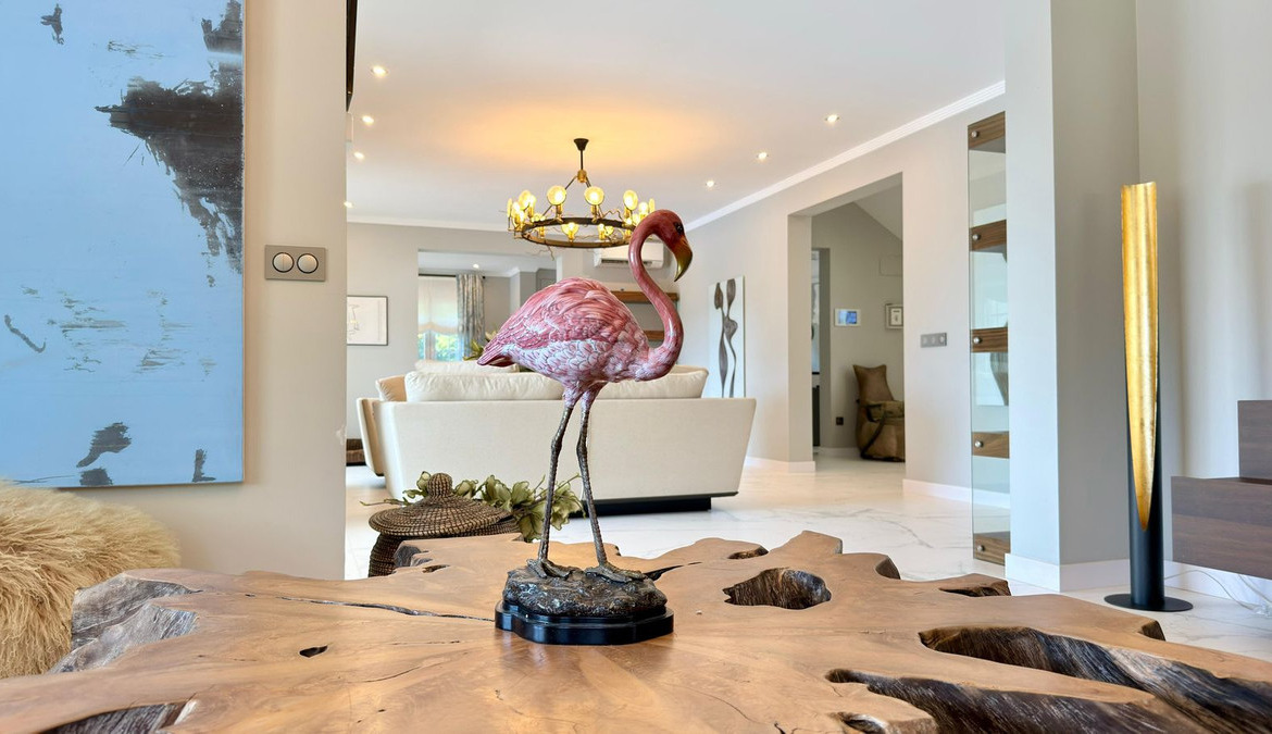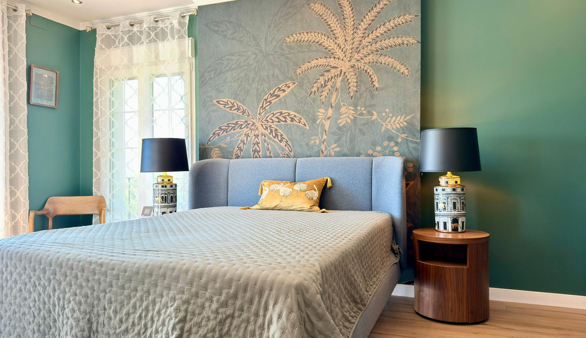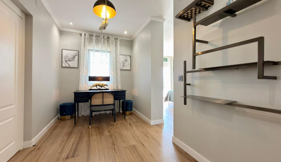 On the ground floor, a spectacular entrance hall with double-height ceilings and stained-glass windows welcomes you with natural light. The main living room includes a working fireplace with hand-painted golden details, while a second lounge area is designed for entertainment, equipped with a large TV and automatic blinds.