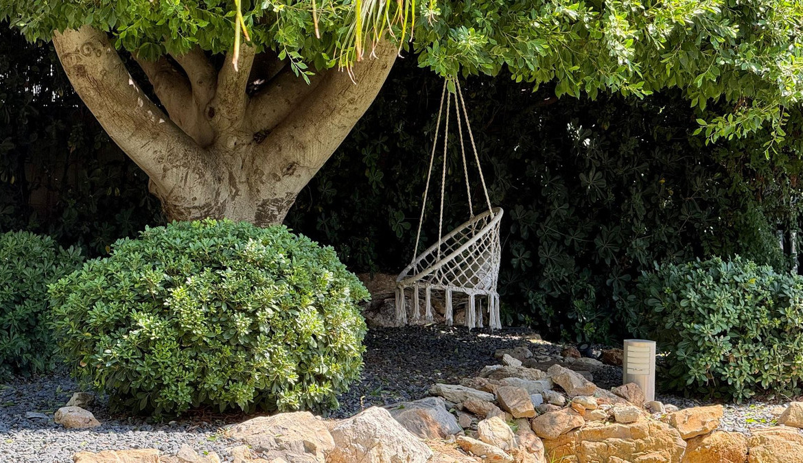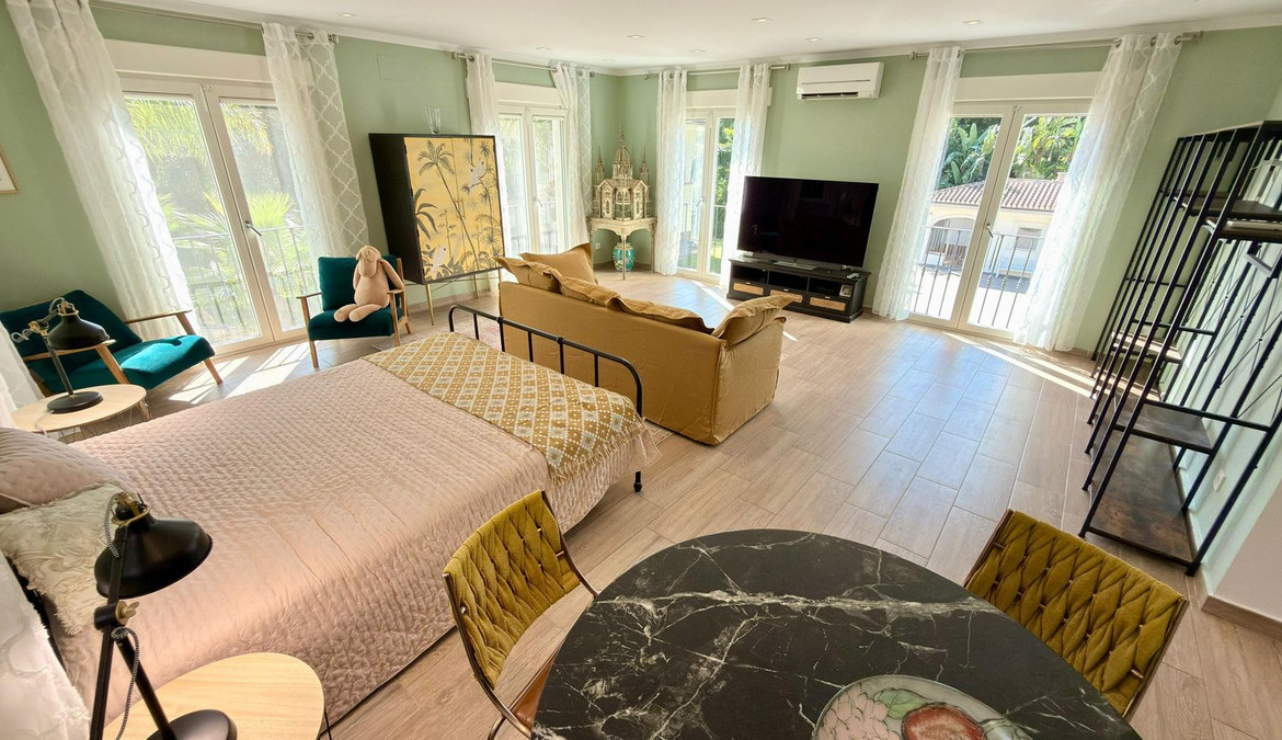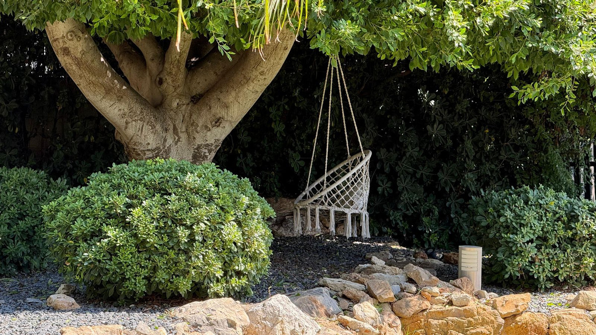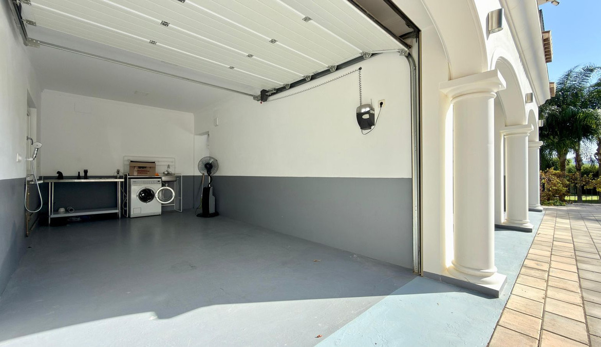 The villa offers multiple outdoor spaces designed for both relaxation and entertainment. A fully equipped summer kitchen with automatic roof and BBQ makes it ideal for dining al fresco. The beautifully landscaped garden features over 60 palm trees and lush Mediterranean plants, all maintained with a domotics-controlled automatic irrigation system.