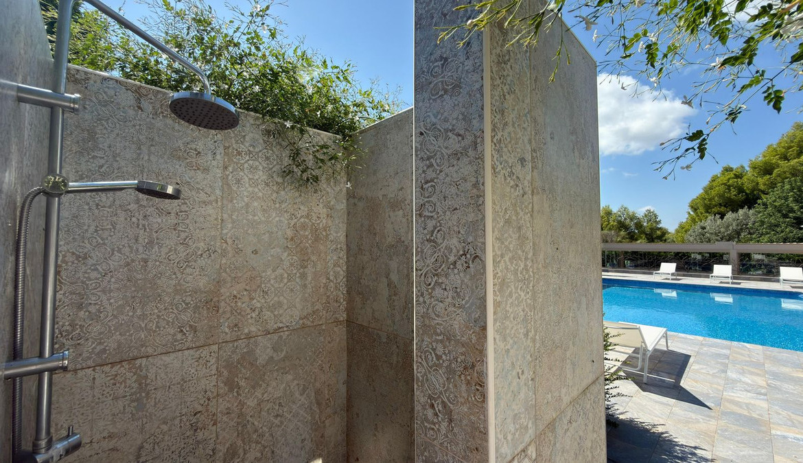 At the heart of the estate lies the saltwater swimming pool with a heating system, perfect for year-round enjoyment. Surrounding the pool, a spacious terrace offers cozy chill-out areas, designed for relaxation and quality time with family and friends.