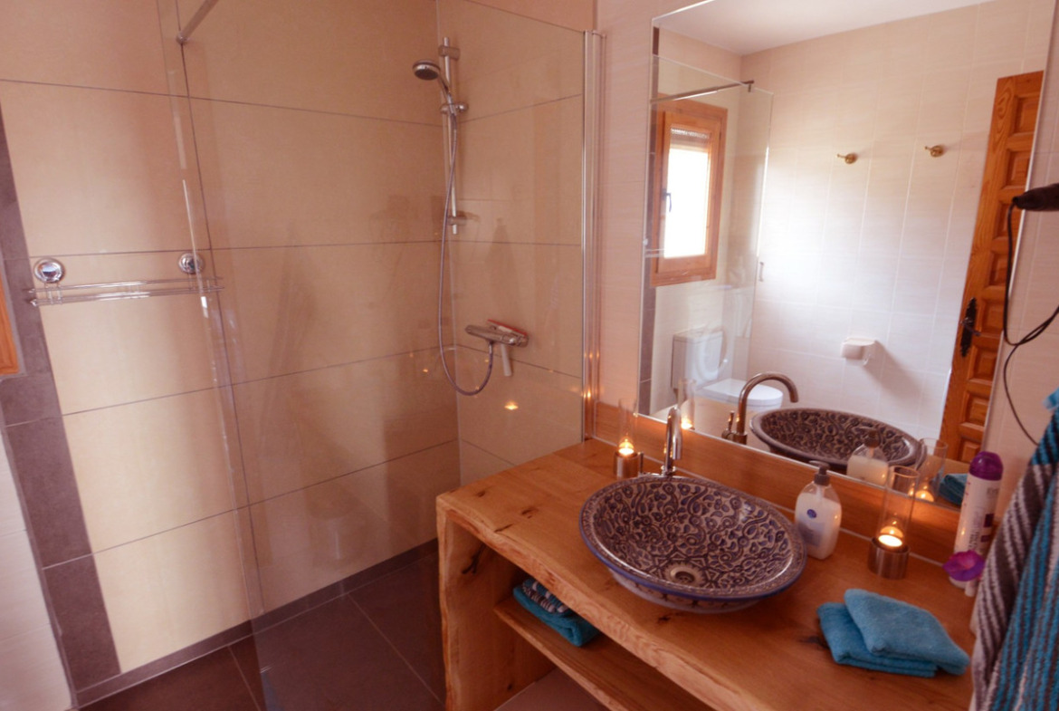 Space DistributionWith a constructed area of 164 m2, it features a total of 3 cozy double bedrooms and 2 bathrooms. This chalet offers enough space for a family or for those who enjoy hosting guests. On the main floor, there are two double bedrooms, a bathroom, the living-dining room, the open-plan kitchen, and a beautiful terrace with panoramic views of the natural park. Below, there is a guest apartment with a large room that has direct access to its spacious terrace and an en-suite bathroom.