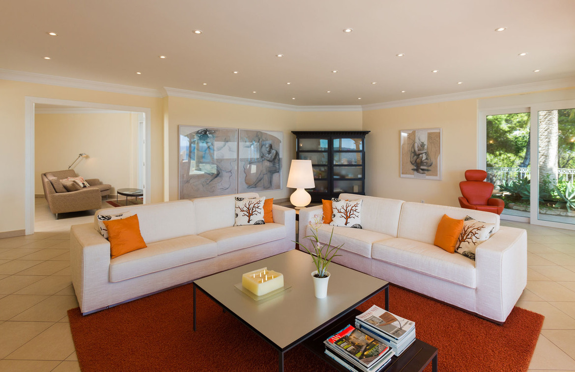 The elegant Levantine-style villa, perched on slender columns and facing south, features large windows that flood the spacious rooms with natural light. The interior, a harmonious blend of timeless furnishings and classic charm, exudes a subtle freshness, reflecting the inherent beauty of the Mediterranean lifestyle.