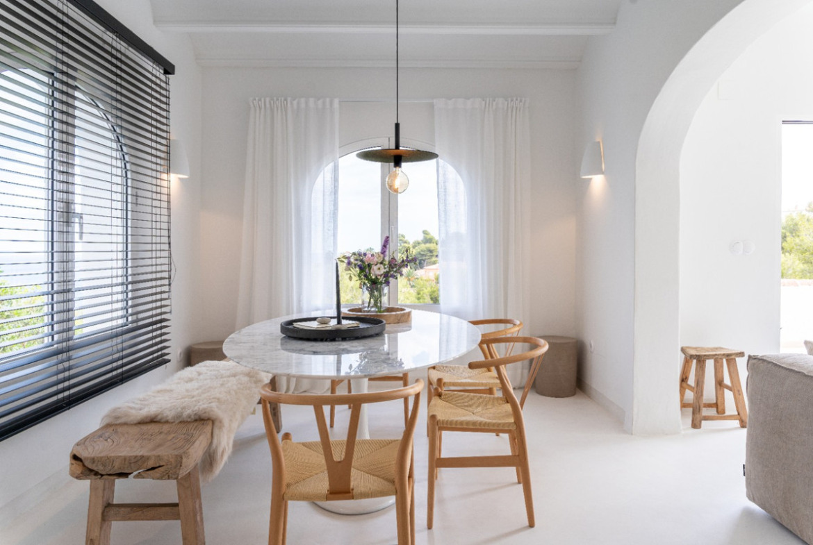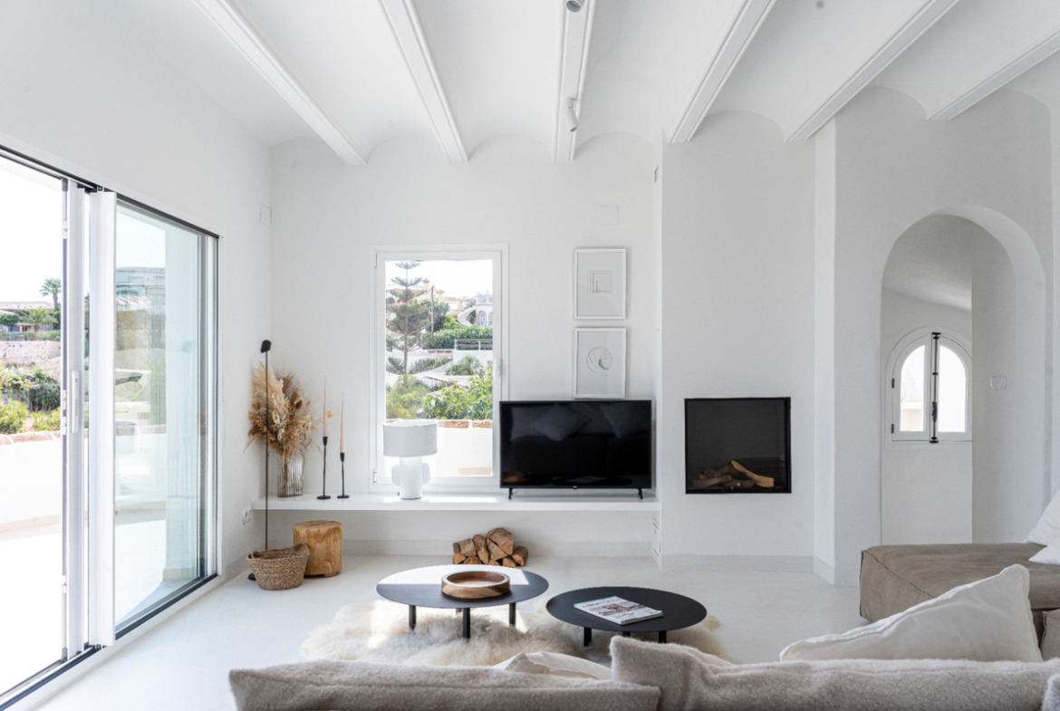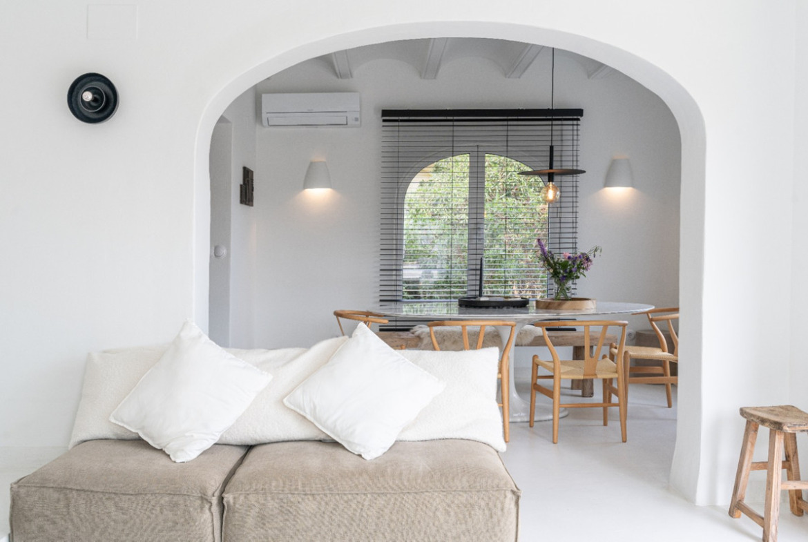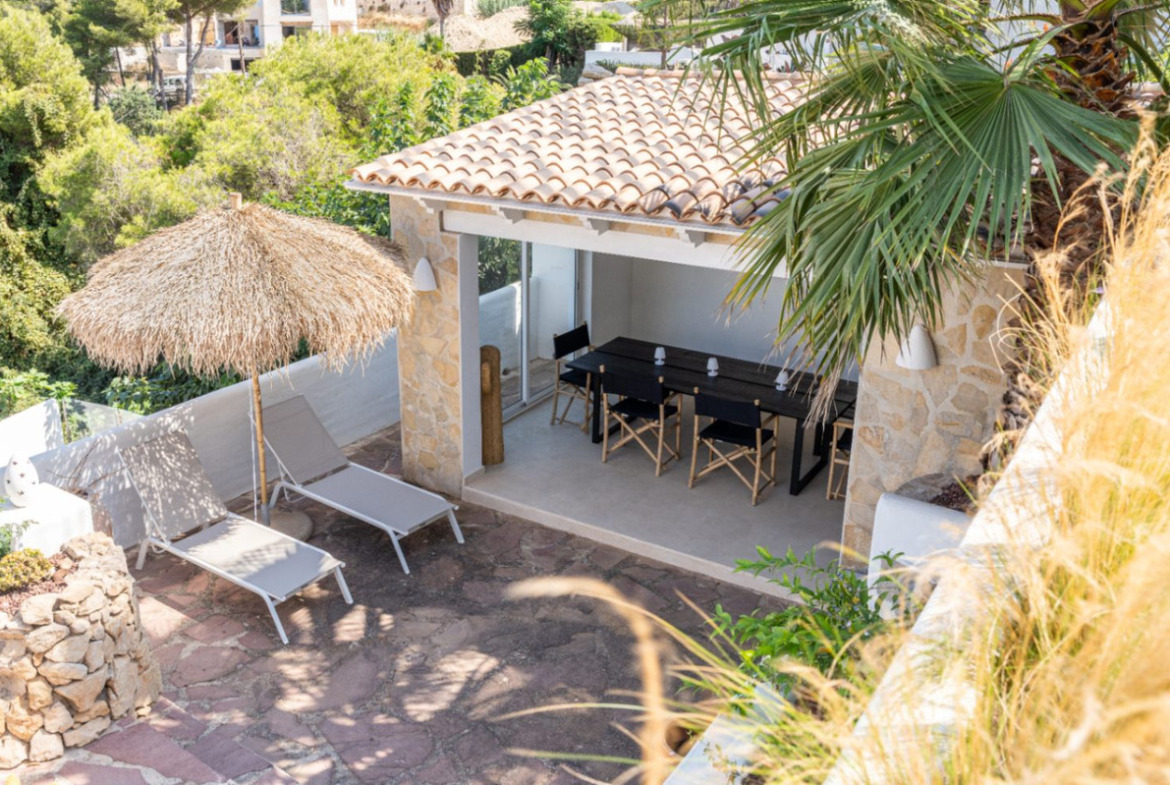 A beautiful, traditional Spanish villa located in Balcon al Mar, which has recently been completely renovated and transformed into a modern oasis in Ibiza style. With its white walls, stylish floors, and a combination of black and wooden accents, the house exudes a refined and luxurious atmosphere. The large windows offer panoramic views over the Mediterranean Sea and the protected island of Portitxol, making you feel like you are on vacation right away.