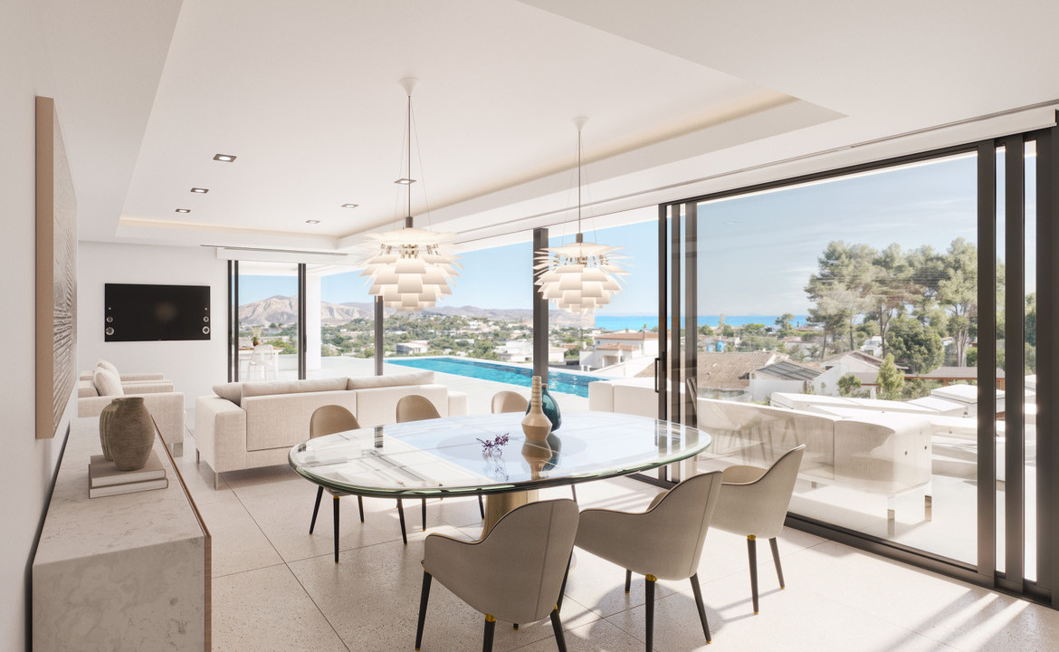 On a slightly sloping 1069m² plot, this modern villa is located in the exclusive area, and provides beautiful views of the Mediterranean sea and mountains.