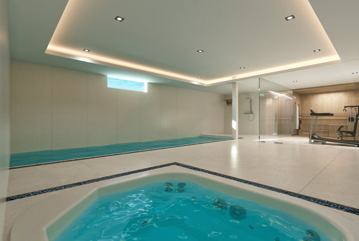 Acquiring light from the outdoor pool, the basement presents a heated indoor swimming pool, Jacuzzi and open showers.
