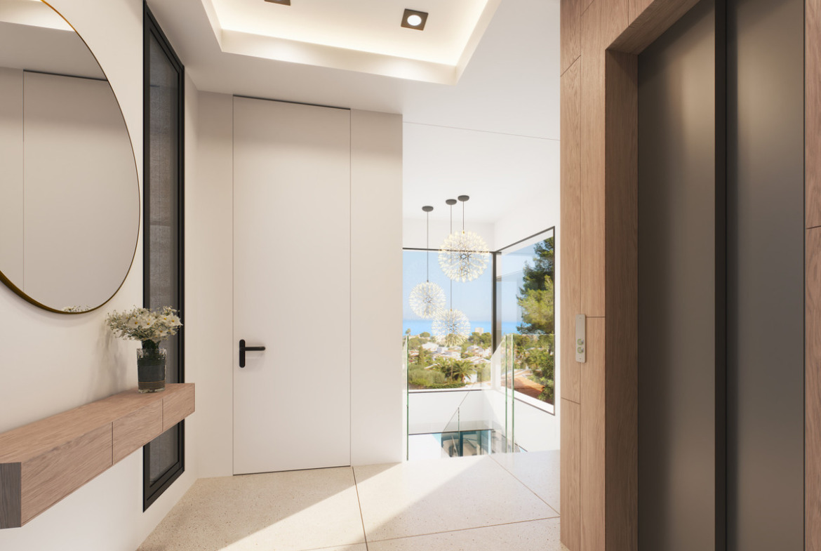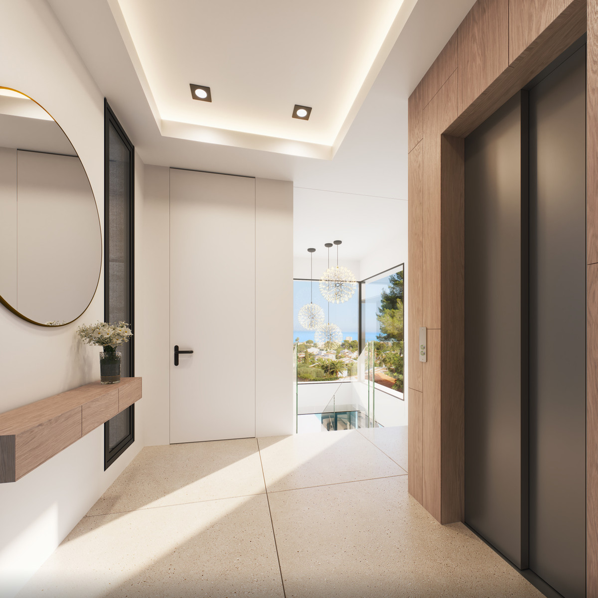 The main entrance to the villa gives immediate access to the first floor and the four-person elevator connects all three levels.