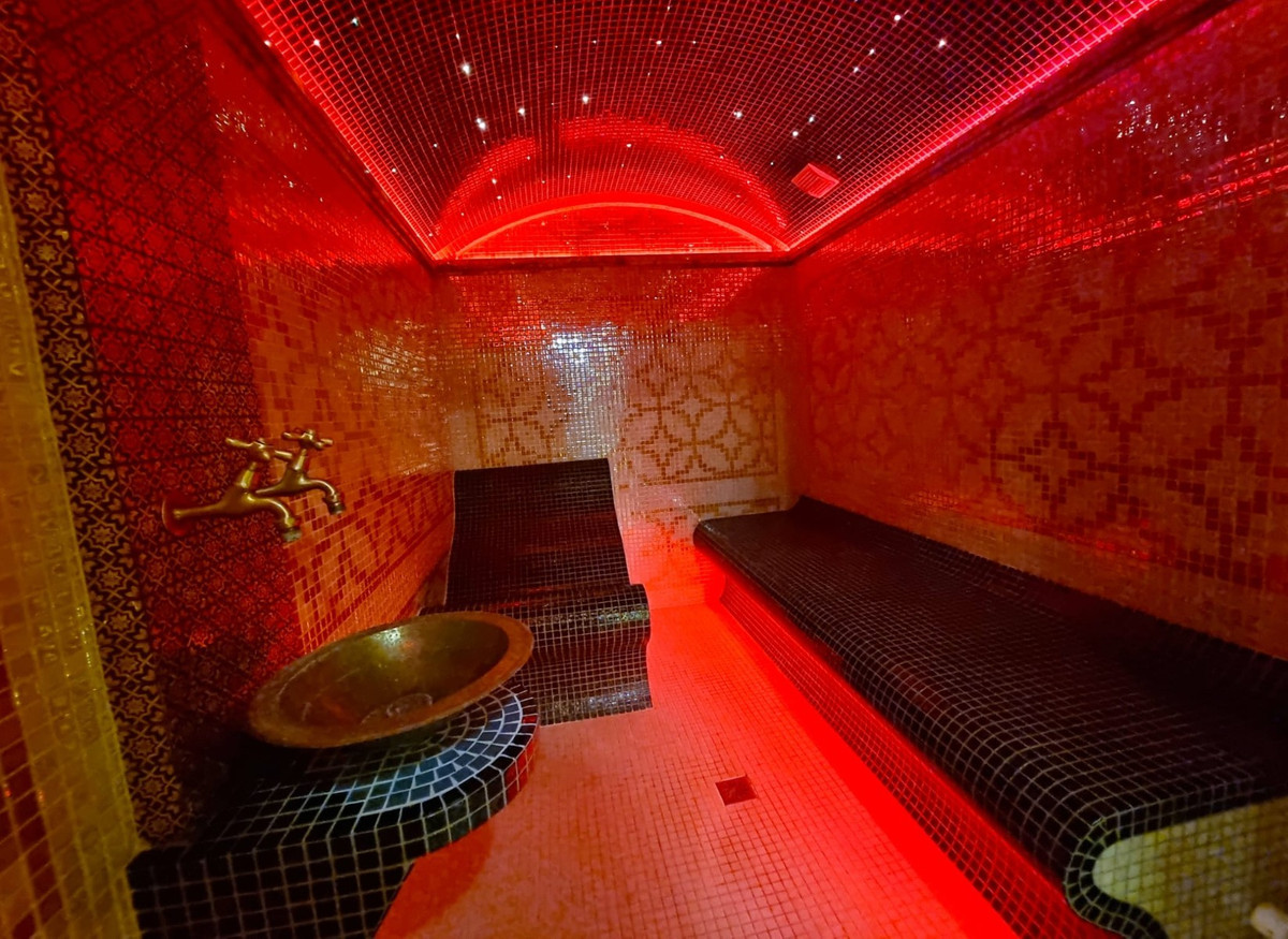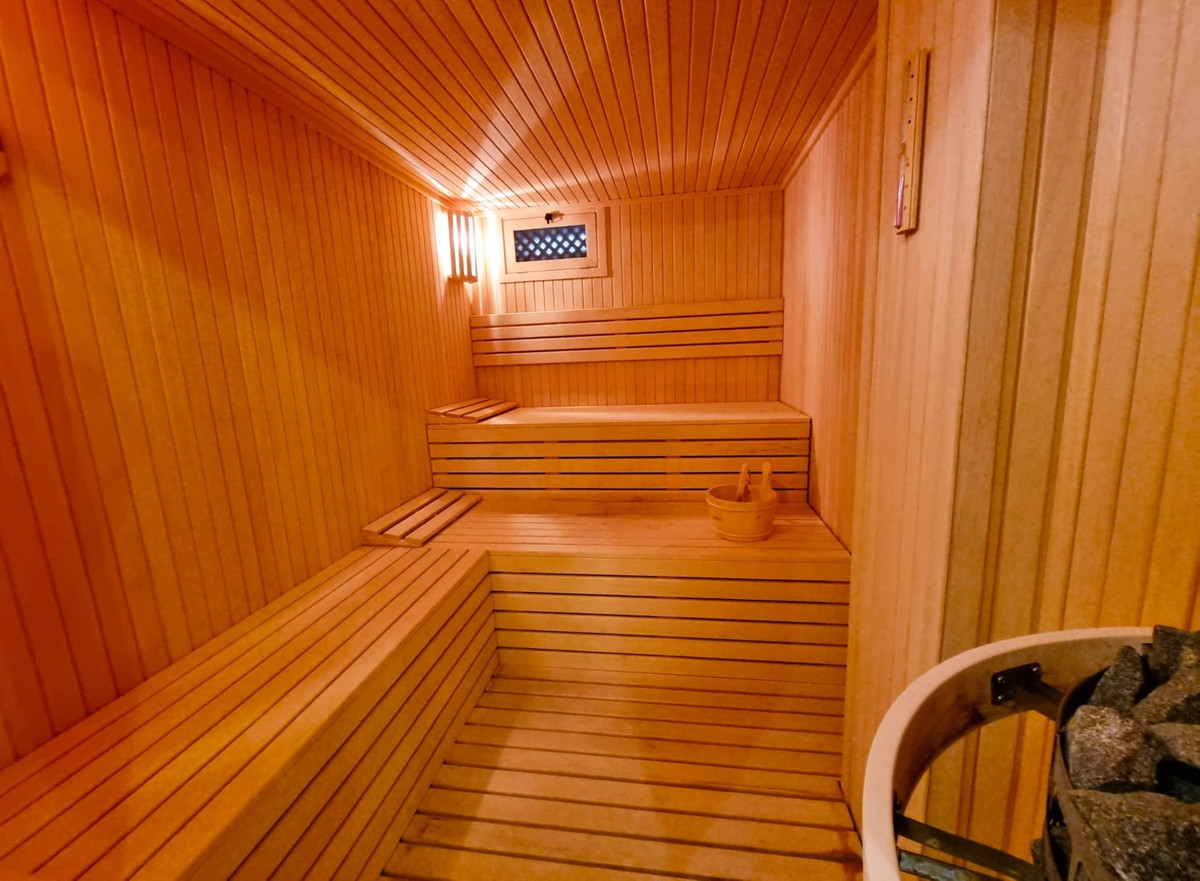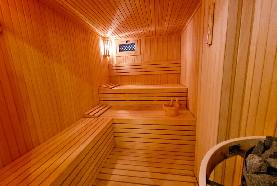 The lower floor houses a spacious common room, a walk-in closet (which can be converted into an extra bedroom), a laundry area, and a luxurious private spa zone. This includes a Finnish sauna, Turkish steam room, and modern shower facilities.