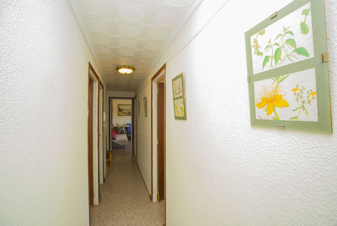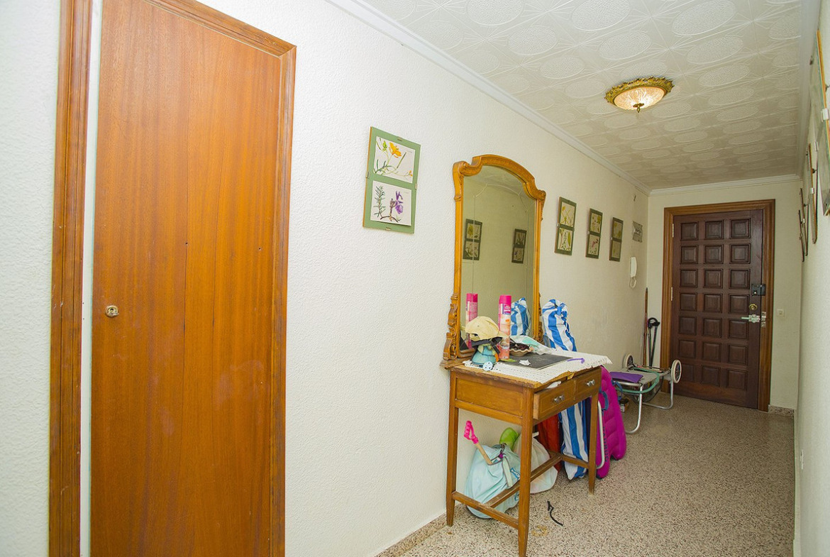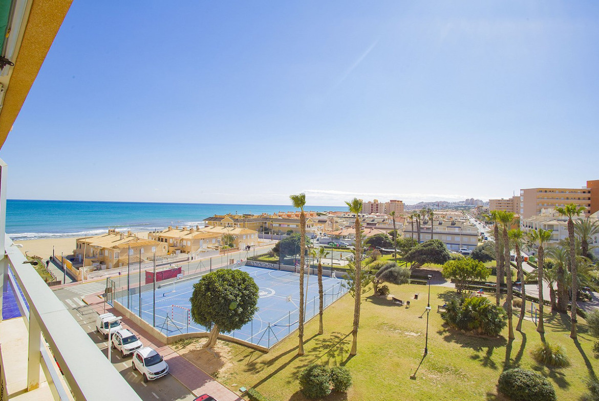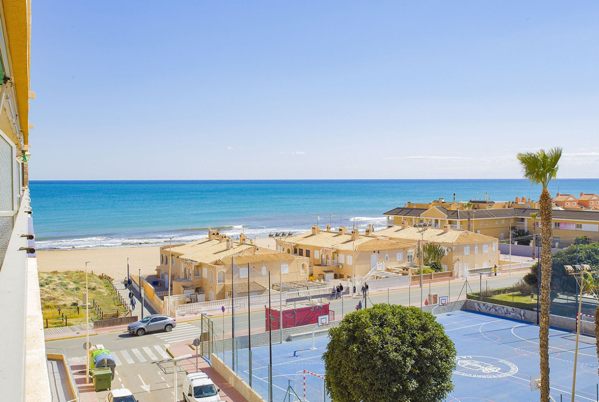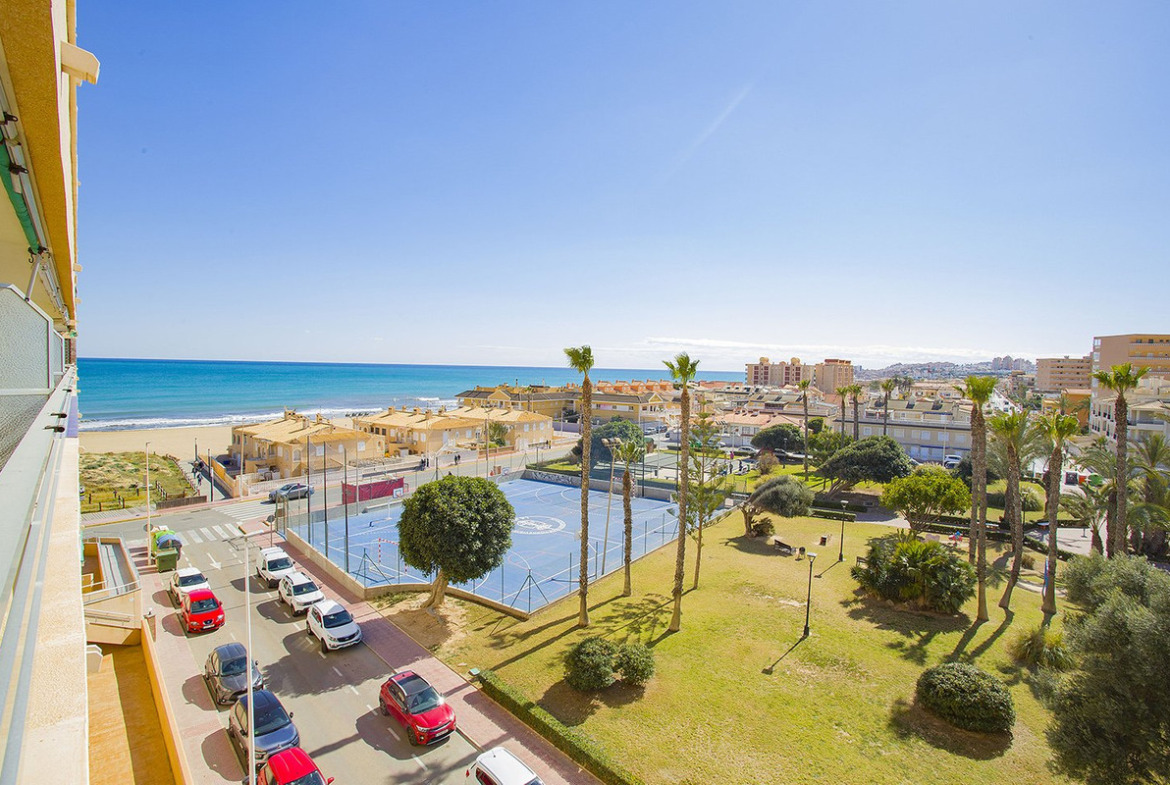 A very spacious apartment is offered for sale on the seafront in the center of La Mata, Torrevieja. The apartment is located in the heart of the town and has beautiful frontal and side views of the sea from the outside. It is located on the fourth floor of a building with two elevators and a ramp for people with reduced mobility. The apartment is distributed as follows: it has a spacious living-dining room with access to the terrace, which is approximately 19 m2 with southeast orientation and beautiful views of the sea, three bedrooms with all exterior windows and fitted wardrobes, a kitchen independent with all appliances and two full bathrooms. The property has an excellent location, one step away from the beach and only 2 minutes from the center of La Mata, with all the nearby services such as supermarkets, neighborhood stores, both food and other services, and restaurants.