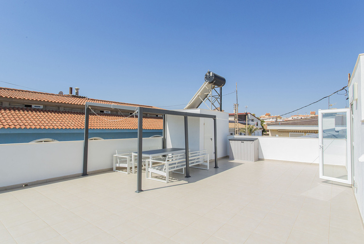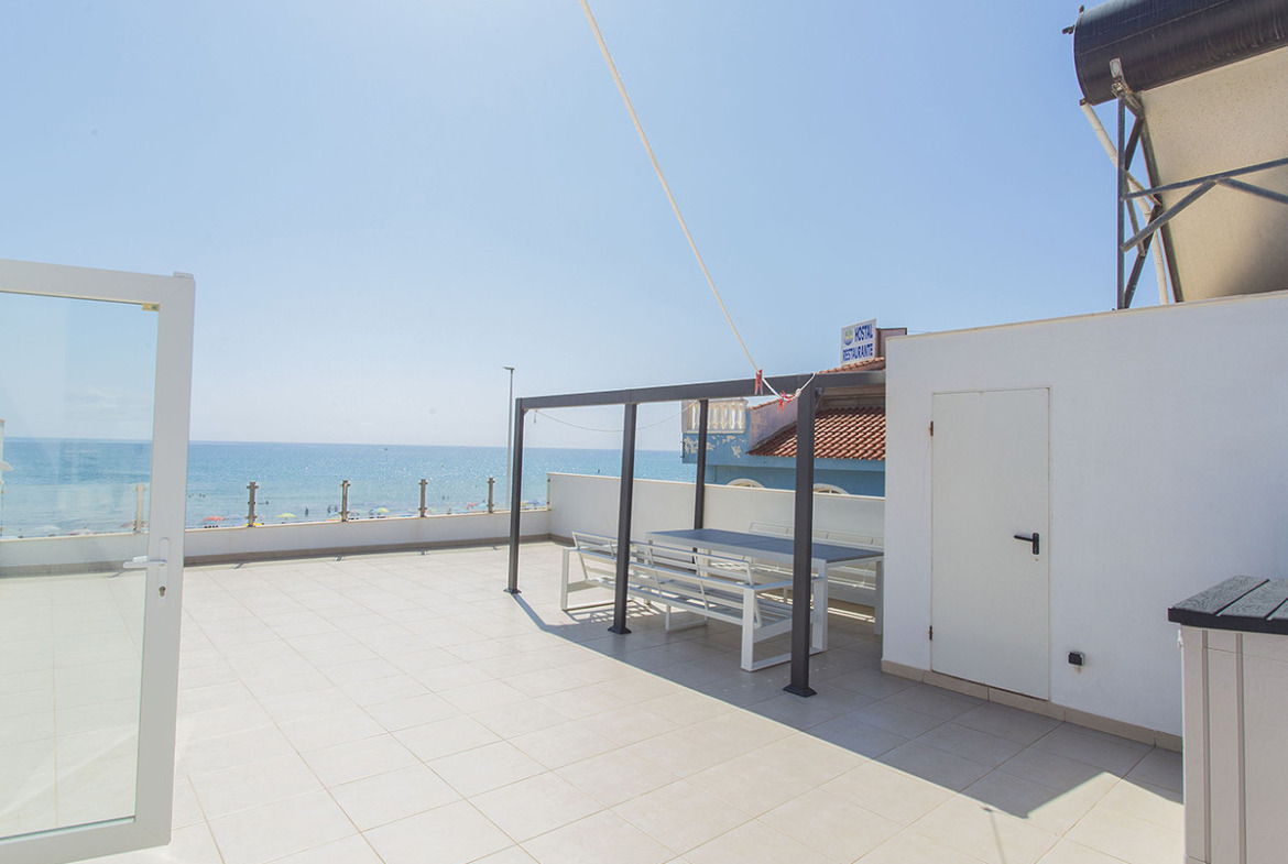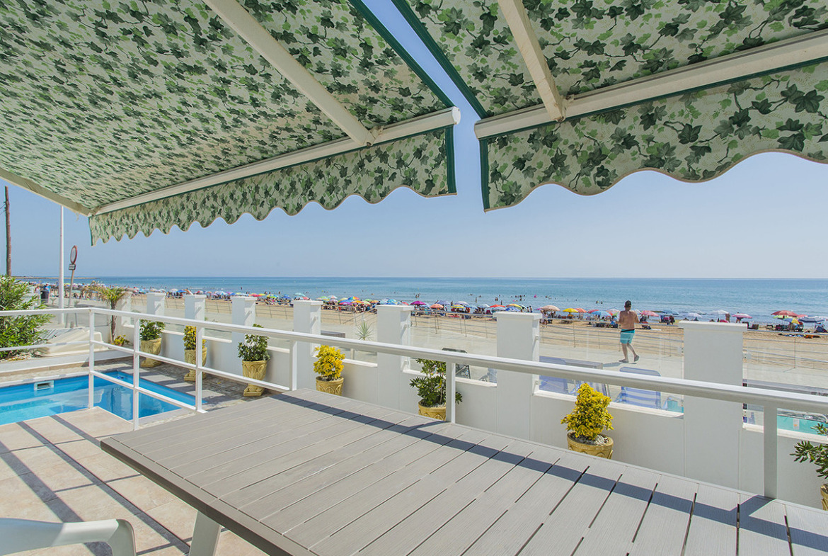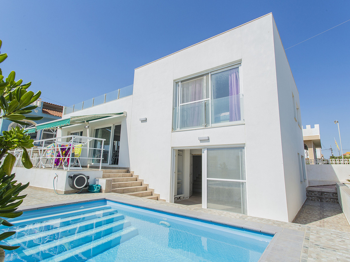 Renovated villa on the beachfront in La Mata, Torrevieja. Solar surface in total 330 m2, in which, within its perimeter, there is a completely renovated villa that has about 167 m2. The house is distributed on three levels. On the ground floor we have a bright and spacious living room with a modern fully equipped open kitchen. From the living room you can walk to the terrace where you also have access to a pool of about 19 m2 with spectacular views of the sea, a bathroom with a shower. On the same floor we have two spacious bedrooms with fitted wardrobes, a complete bathroom with a shower. On the second floor we have: a bedroom with sea views and a full bathroom, a toilet and another bedroom. On the third floor we have a private solarium of about 70 m2. They also grabbed a semi-basement that gives direct access to the pool. Which is distributed in two spacious bedrooms and a full bathroom with a bathtub. The renovation of the house was completed last year, 2022. All bedrooms have fitted wardrobes, air conditioning, windows with electric shutters, underfloor heating. It has a very good reconstruction, few stairs and can be accessed from any floor from inside the house. There is no need to go outside. On the other side of the house, we have an entrance to the garage, which is sequestered in the semi-basement and has about 20 m2. It is sold as seen in the photos, with everything. It has a very good location, one step away from the La Mata promenade with all the services, just 5 minutes from the center of La Mata.
