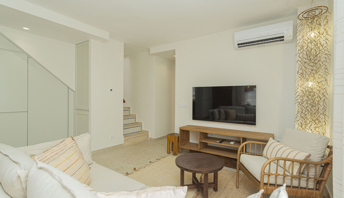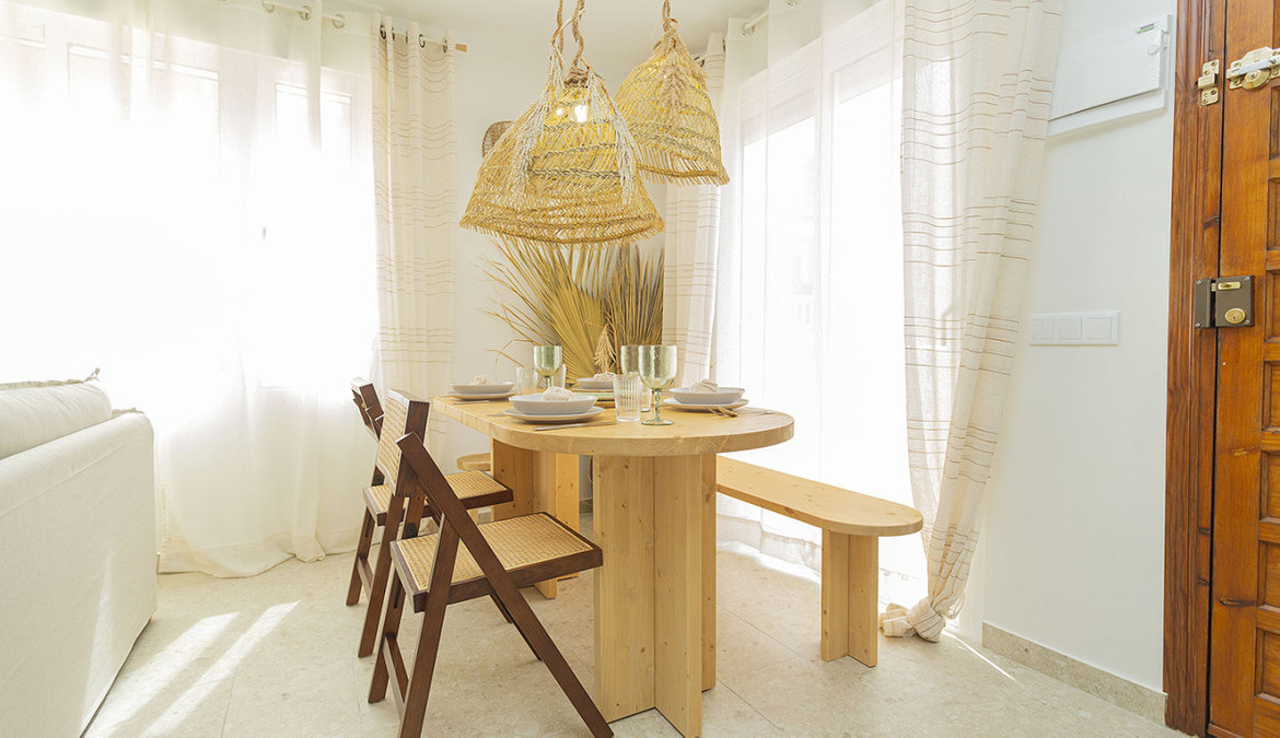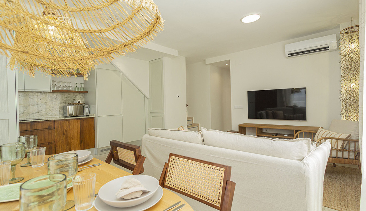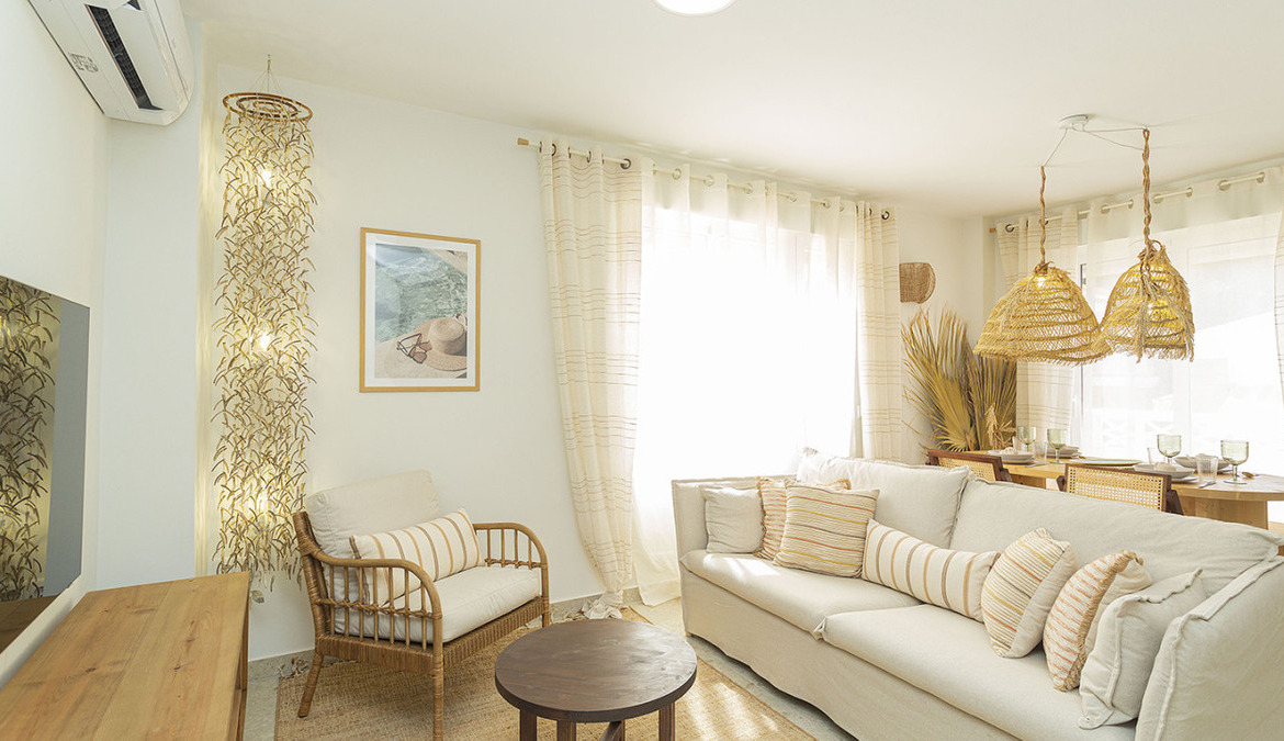 Distribution and details of the house: The entrance is through a charming terrace. This gives access to the living room: Spacious and bright living room, with large windows that provide plenty of natural light. It includes a dining area and a cozy lounge with a high-quality comfortable sofa and television for relaxing with the family. It has several practical pieces of furniture for storage that also add unique style to the room.