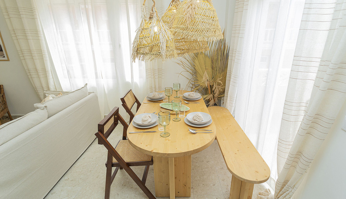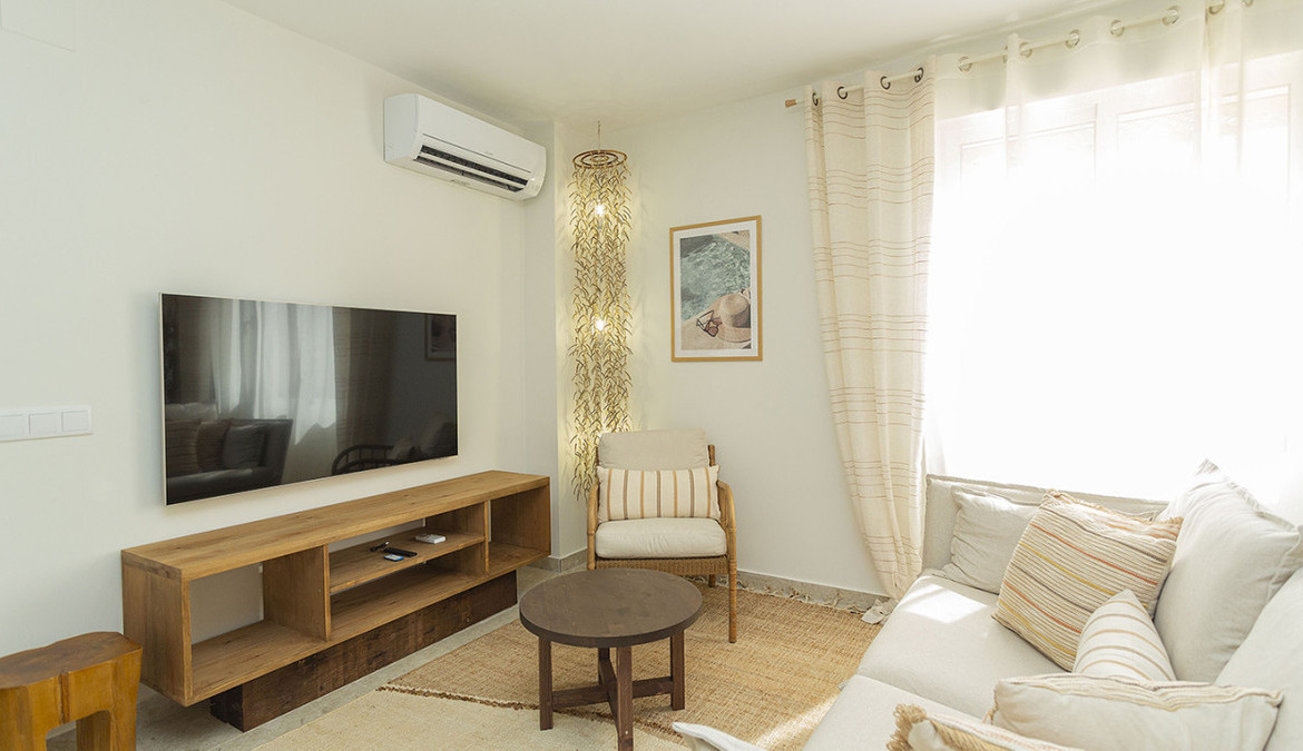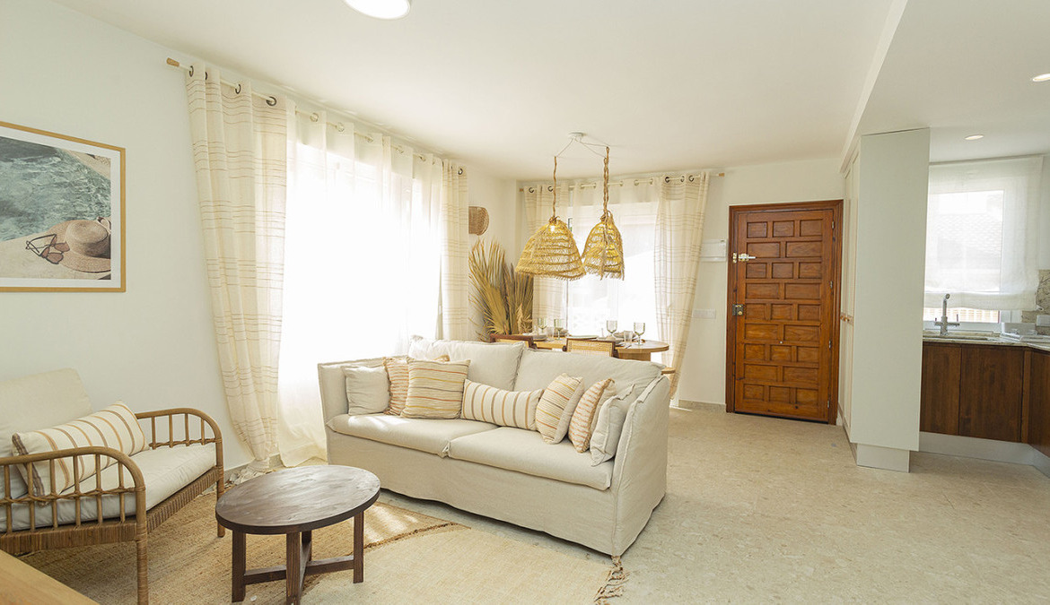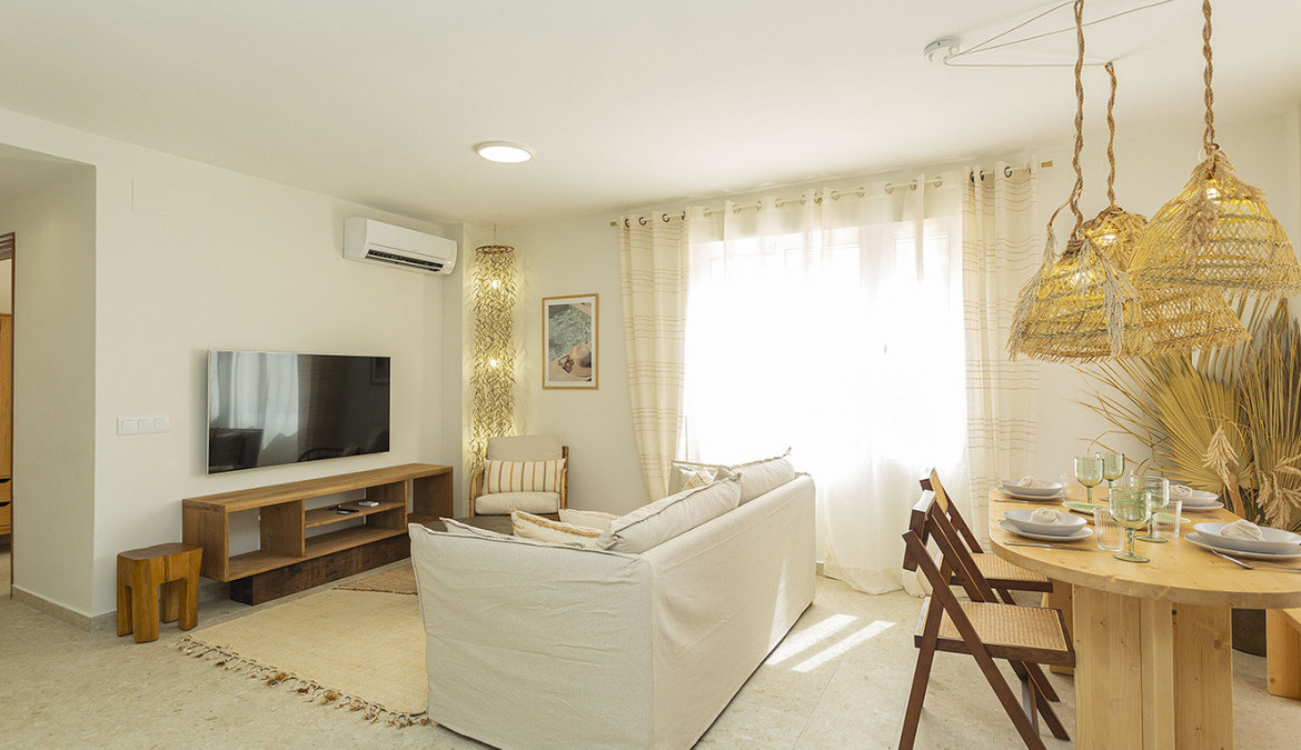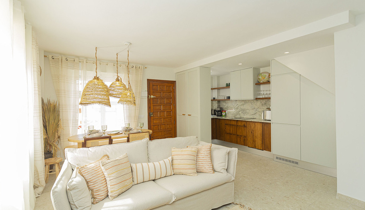 Distribution and details of the house: The entrance is through a charming terrace. This gives access to the living room: Spacious and bright living room, with large windows that provide plenty of natural light. It includes a dining area and a cozy lounge with a high-quality comfortable sofa and television for relaxing with the family. It has several practical pieces of furniture for storage that also add unique style to the room.