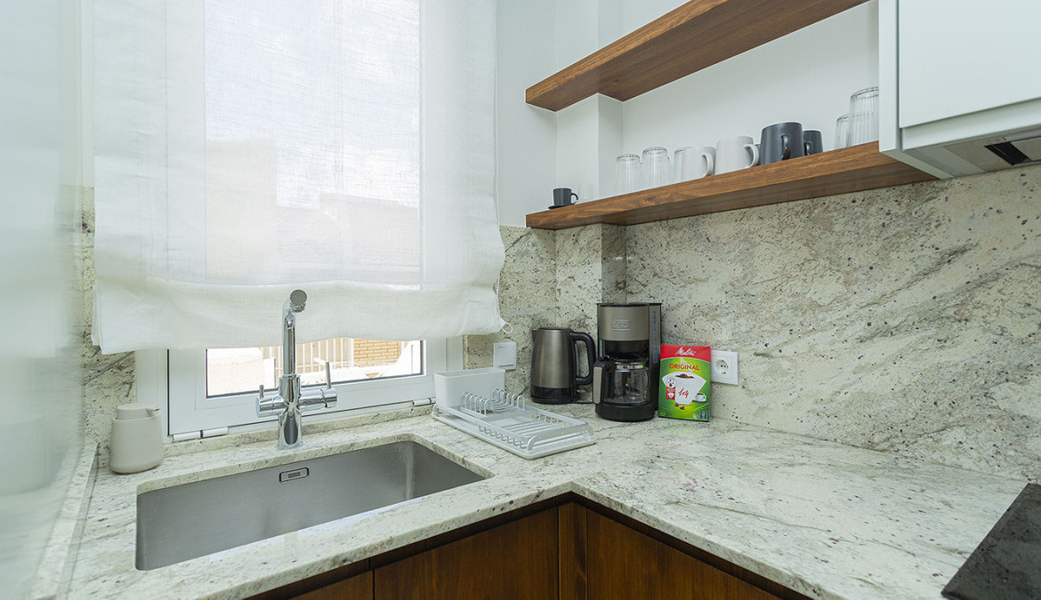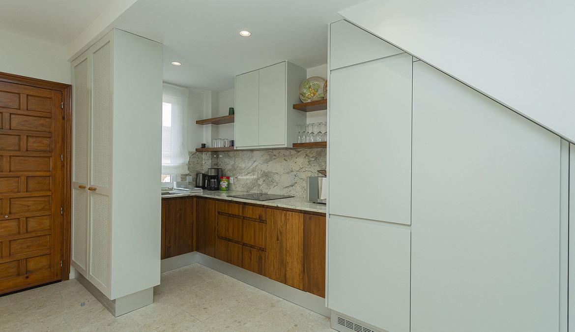 Open kitchen: uniquely designed and fully equipped with rock countertops and oak furniture. High-end equipment from the Balay brand, with plenty of storage space and a functional layout.
