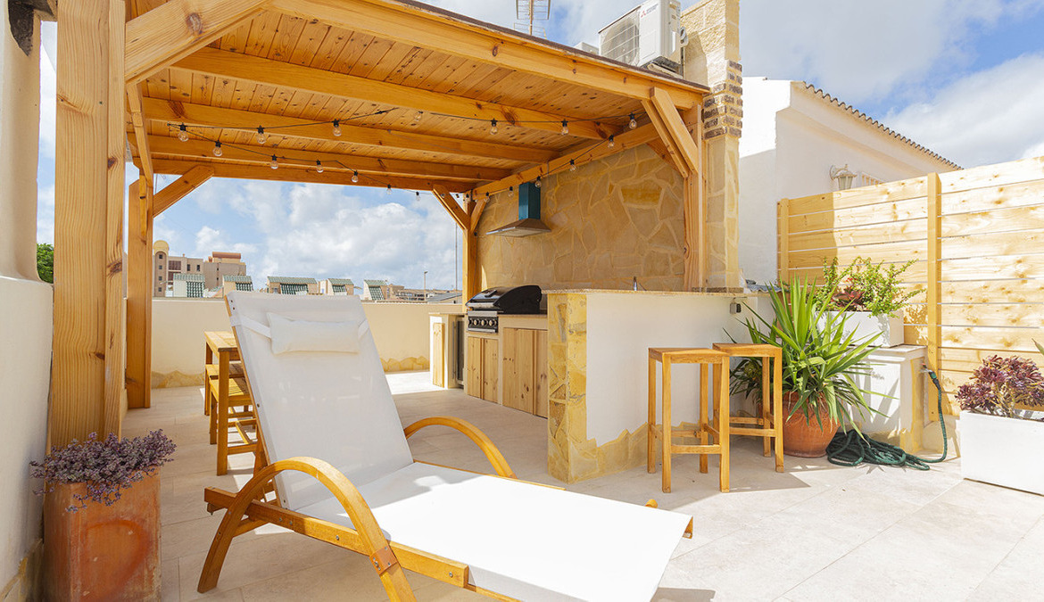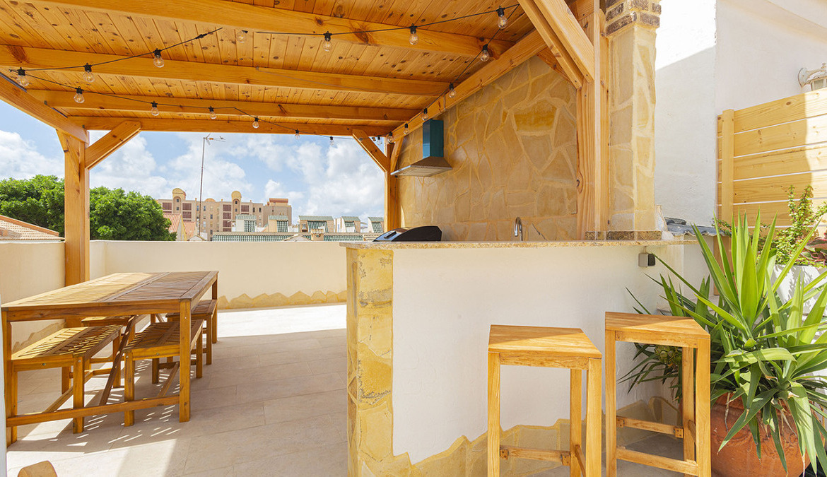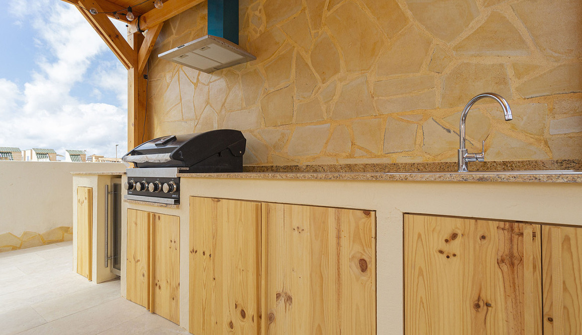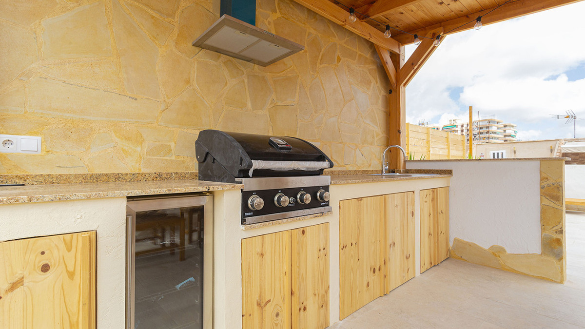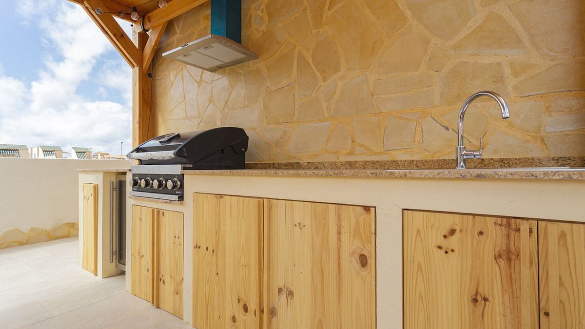 The size of the house is also impressive: 109 useful square meters and a further 45 square meters of solarium, apart from the spacious entrance terrace. The very spacious solarium is divided into a covered barbecue area, with solid wood pillars and roof, and a lounge area perfect for enjoying the sun.
