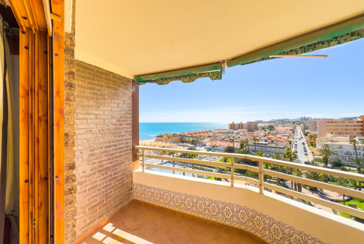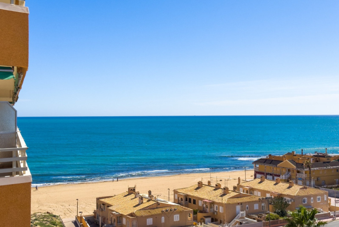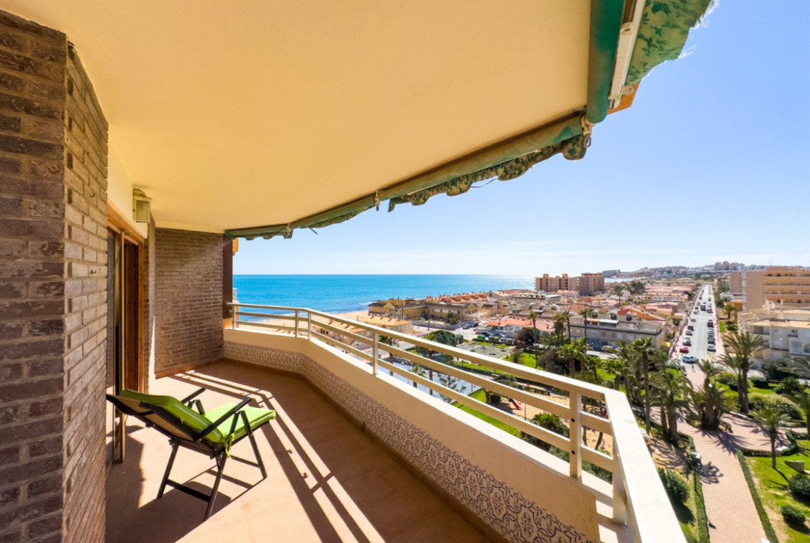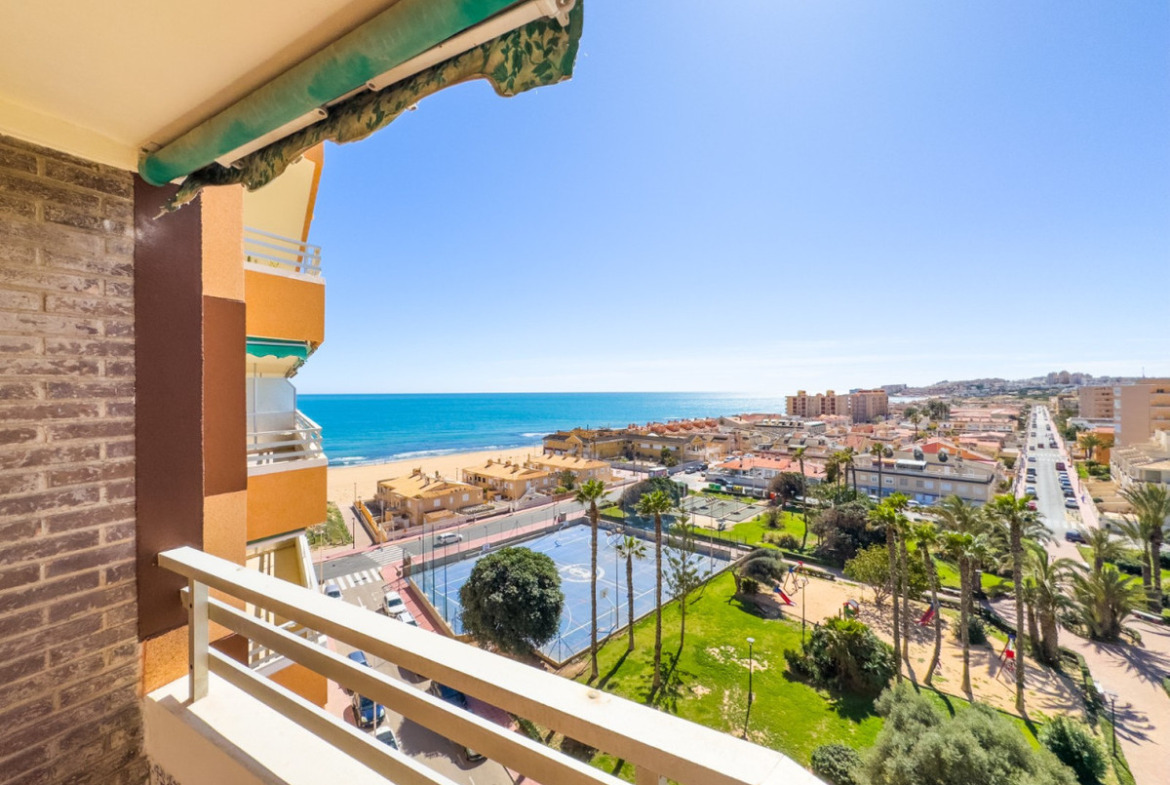 A very spacious beachfront apartment is for sale in the center of La Mata, Torrevieja. The apartment is located in the heart of the town and boasts beautiful lateral sea views from the exterior. It is located on the seventh floor of a building with two elevators and a ramp for people with reduced mobility. The apartment is distributed as follows: a spacious living-dining room with access to the terrace, which is approximately 23 m2 southeast-facing and offers beautiful sea views, three bedrooms with all exterior windows and built-in wardrobes, a separate kitchen with all appliances and access to the utility room, and two full bathrooms with showers. In the basement of the same building, there is a parking space, which is included in the price. The property has an excellent location, a stone's throw from the beach and just 2 minutes from the center of La Mata, with all amenities nearby, such as supermarkets, local shops (food and other services), and restaurants.