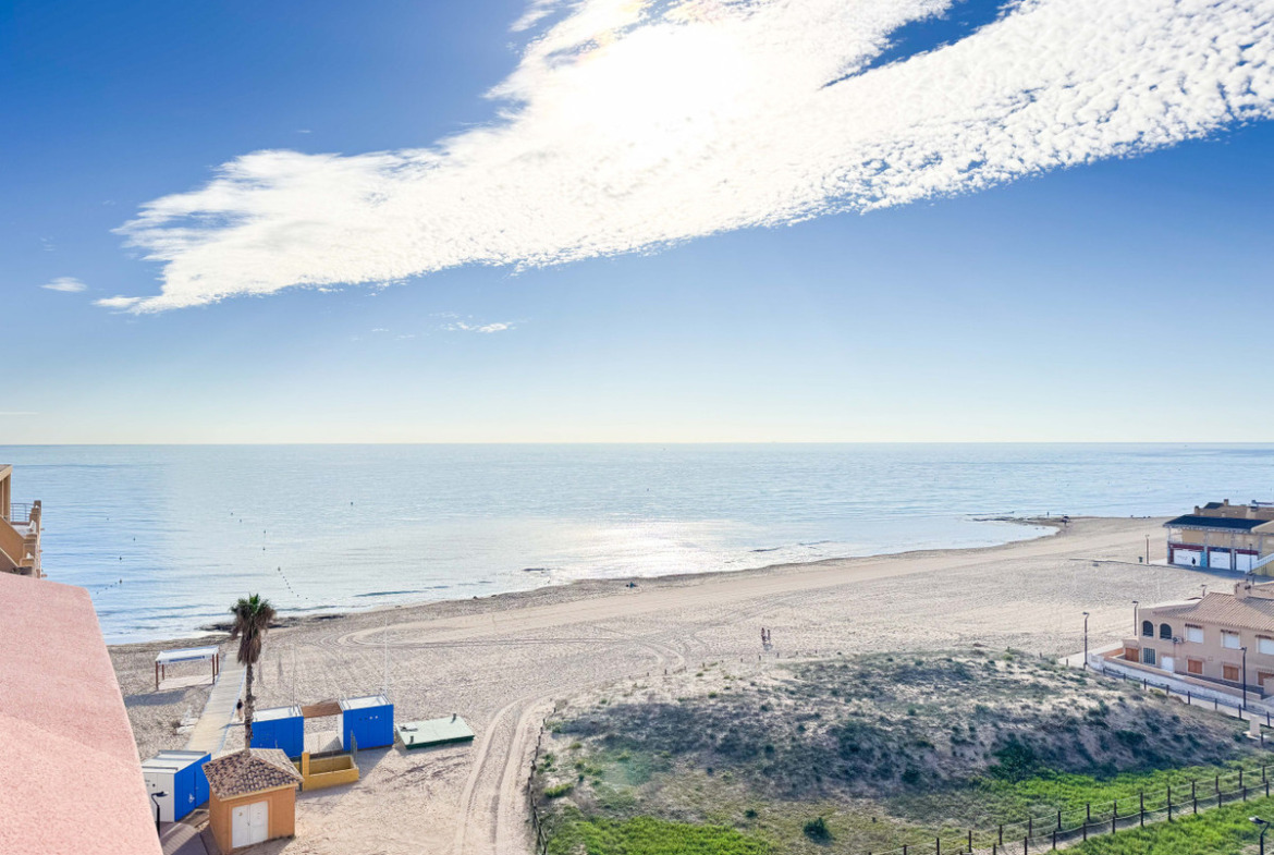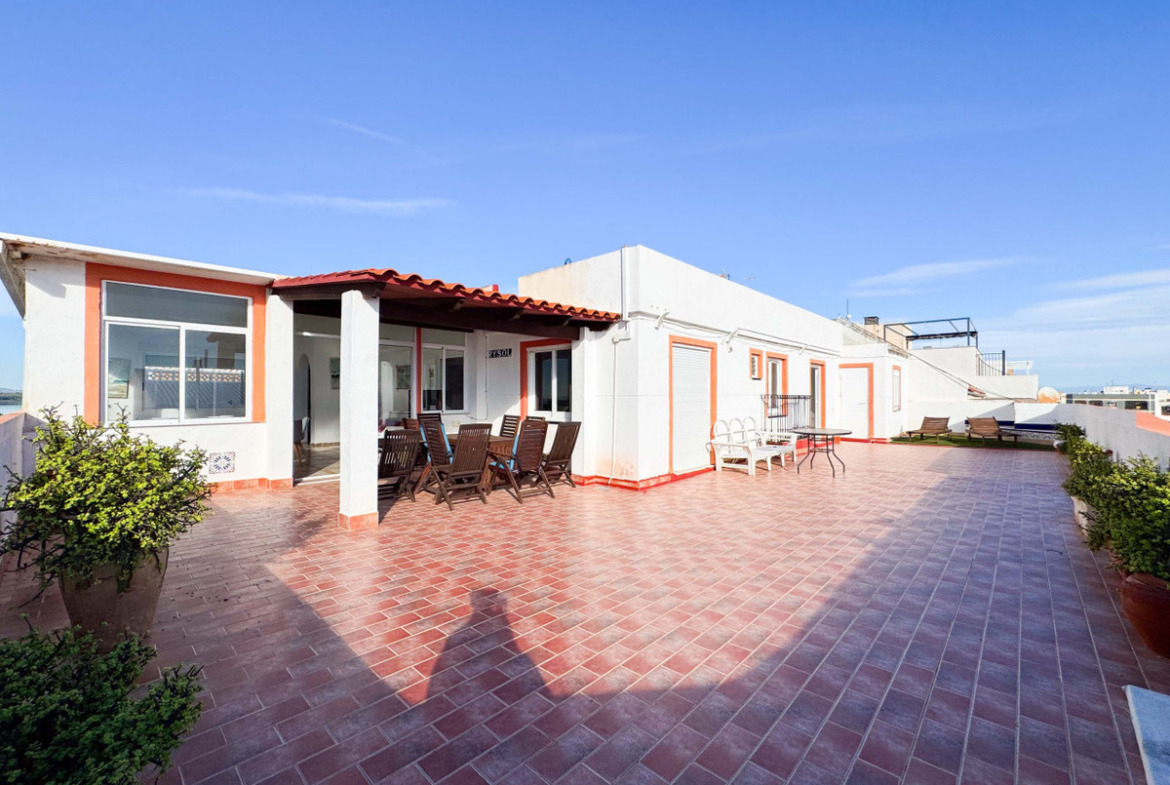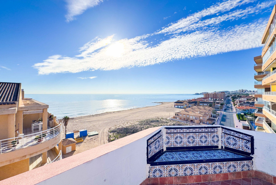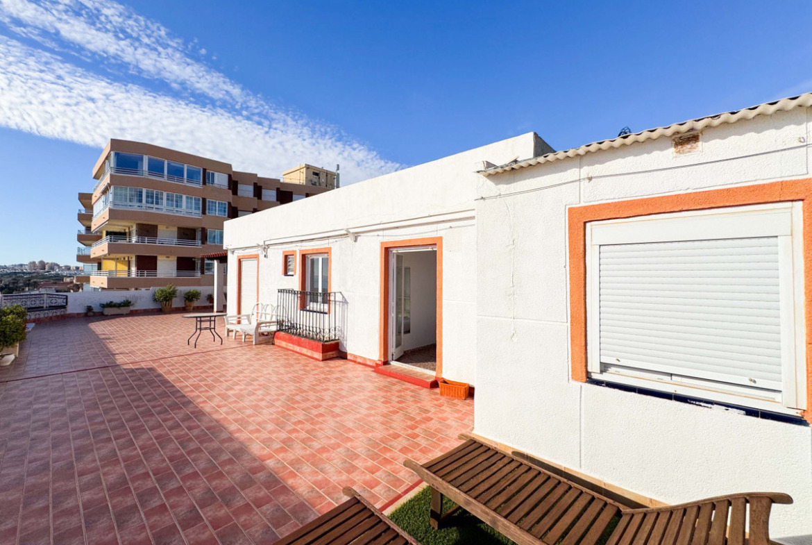 This penthouse in La Mata, Torrevieja, features a large corner terrace with panoramic sea views, offering a unique opportunity to live close to the beach. With 161 m2 built, this apartment has four spacious bedrooms, two large living rooms, and a dining area, alongside two full bathrooms, including one en suite. The layout includes an independent kitchen with laundry room and a glazed terrace used as a dining area, perfect for enjoying morning and afternoon sun with sea views from almost every room. The property allows for customization and renovation to add your personal touch. Located in the heart of La Mata, just 20 meters from restaurants, supermarkets, pharmacy, and other services, this penthouse combines comfort and a prime location. Ideal for residential investment with seasonal rental potential or as a permanent home. Don’t miss the chance to visit this exceptional property. Contact us to schedule a physical visit or request a virtual tour and detailed plans.