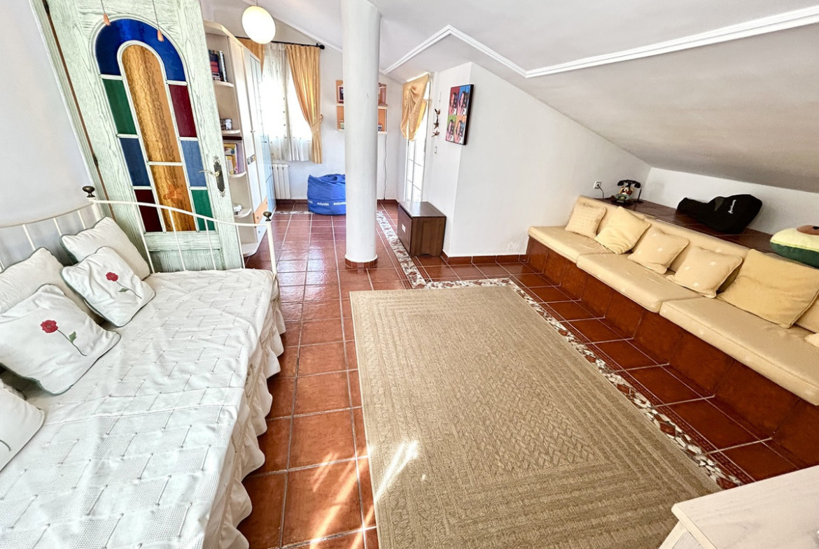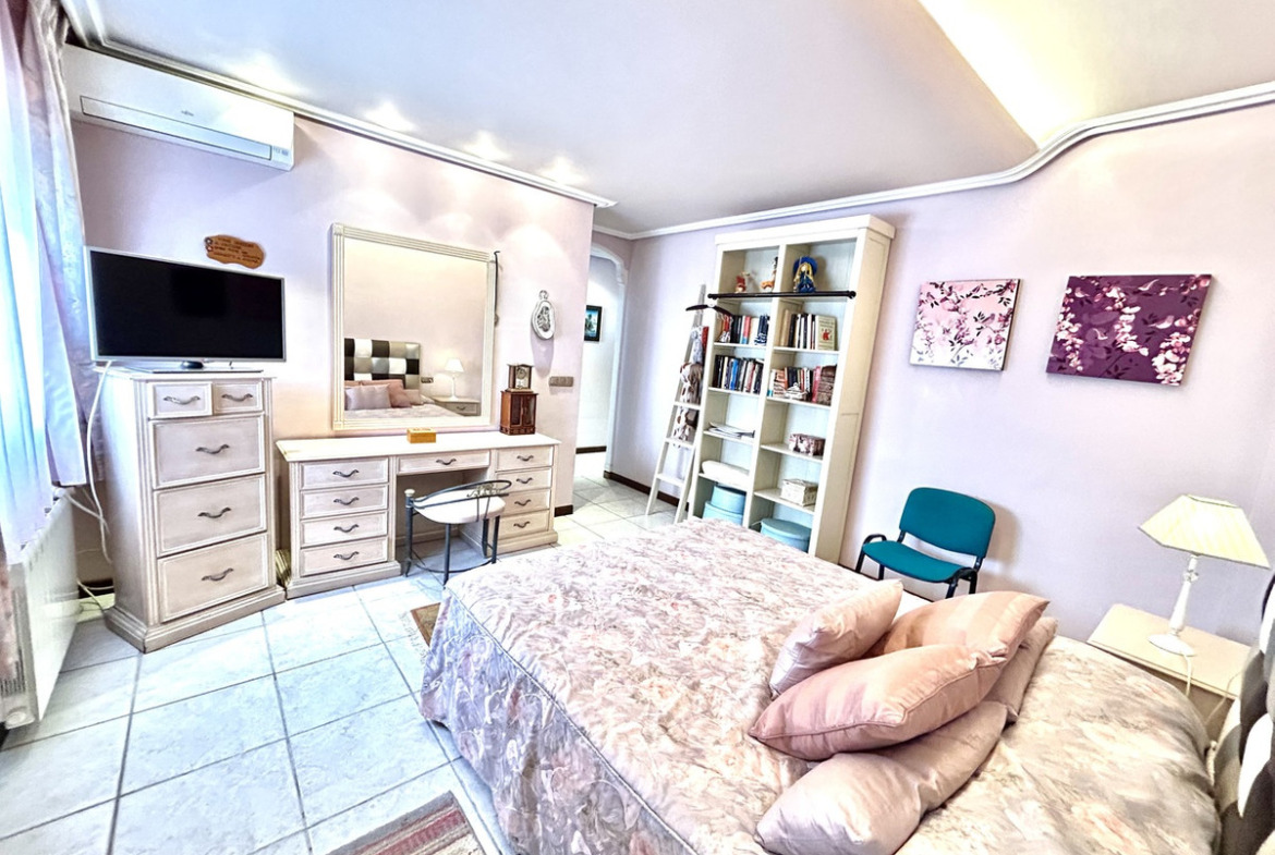 Outside, the villa offers a stunning private swimming pool surrounded by a lush, mature garden—perfect for relaxing in complete privacy. A welcoming covered porch and a pergola with built-in barbecue create the perfect setting for outdoor dining and memorable family or social events.