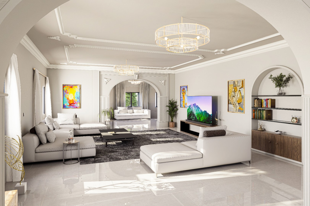The main villa is both opulent and spacious, featuring four generously sized double bedrooms, two luxurious bathrooms, and expansive lounge and dining areas. Every room has been meticulously decorated with lavish ornate crown mouldings and intricate plasterwork, all completed at great expense to ensure an atmosphere of refined elegance.