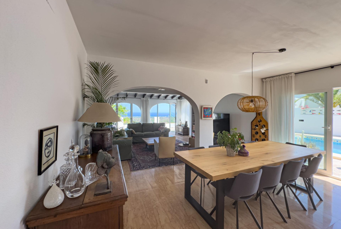On the main floor, you enter through a hallway with a guest bathroom. This leads to a spacious living area with large windows, plenty of natural light, and sea views. The open-plan space is divided into three areas: an open kitchen, dining area, and living room. Also on this fully renovated level is a large bedroom with an en-suite bathroom.