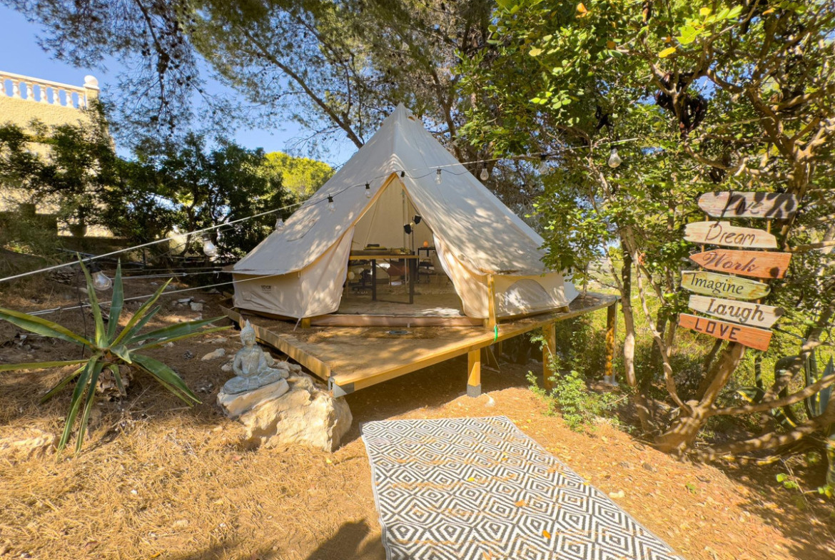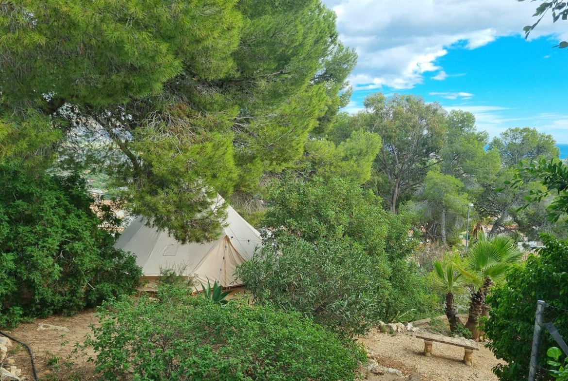 The plot is flat at the upper level, where the entrance to the main floor is located, and then slopes gently downward to a beautiful, low-maintenance garden. In one corner of the plot, there is a tipi with a diameter of 6 meters.