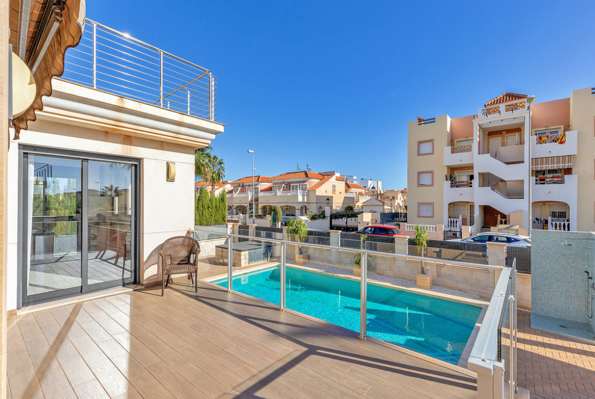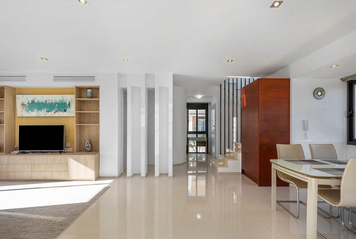 This villa is situated in an exclusive residential area and has its own private pool and a plot of 410m2. The property has 250m2 built area divided into 4 floors. On the ground floor there is a spacious living room with open plan kitchen, 1 bedroom, 1 bathroom and terrace with access to the pool. On the semi-basement floor there is a living room with open plan kitchen, 2 bedrooms and 1 bathroom. This floor also has a sauna and shower. On the first floor there are 2 bedrooms, each with en-suite bathroom and a large terrace. On the top floor there is a large solarium of 46m2.