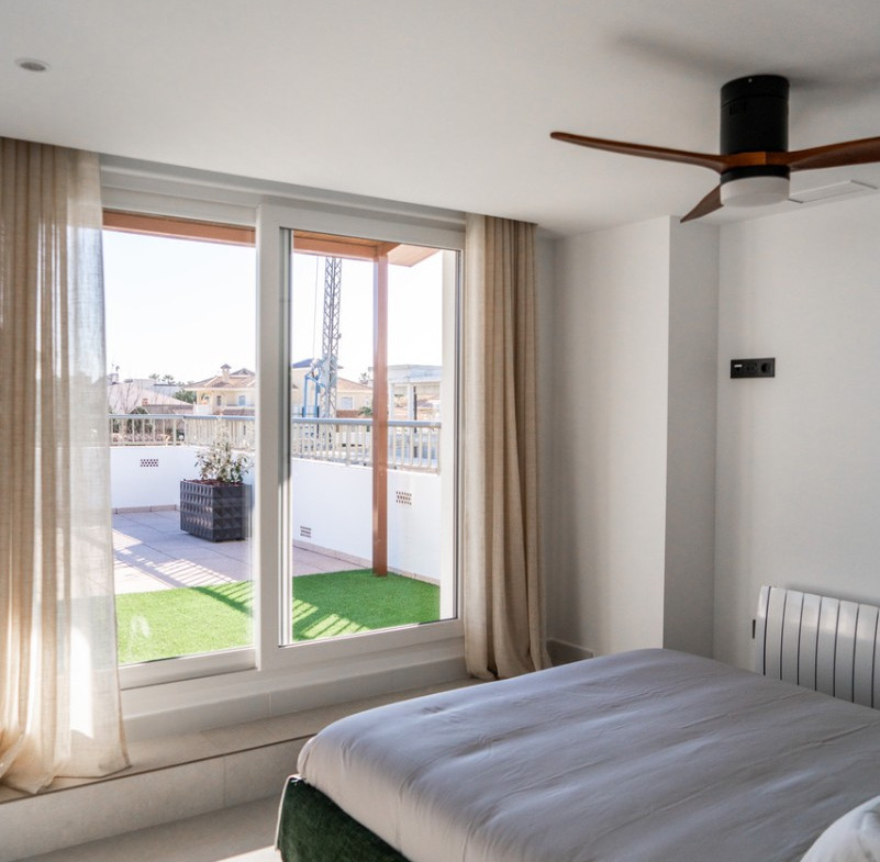 In the heart of La Zenia (Orihuela Costa) lies this luxurious 122 m² apartment that combines privacy, contemporary design, and Mediterranean comfort . Located on the first floor of a building with only two apartments and an elevator , it offers the tranquility of a penthouse with no neighbors above. Its impressive 250 m² private terrace , complete with a barbecue area, covered porch, artificial grass, and ample seating, transforms this home into a true outdoor retreat, ideal for enjoying the sun year-round.