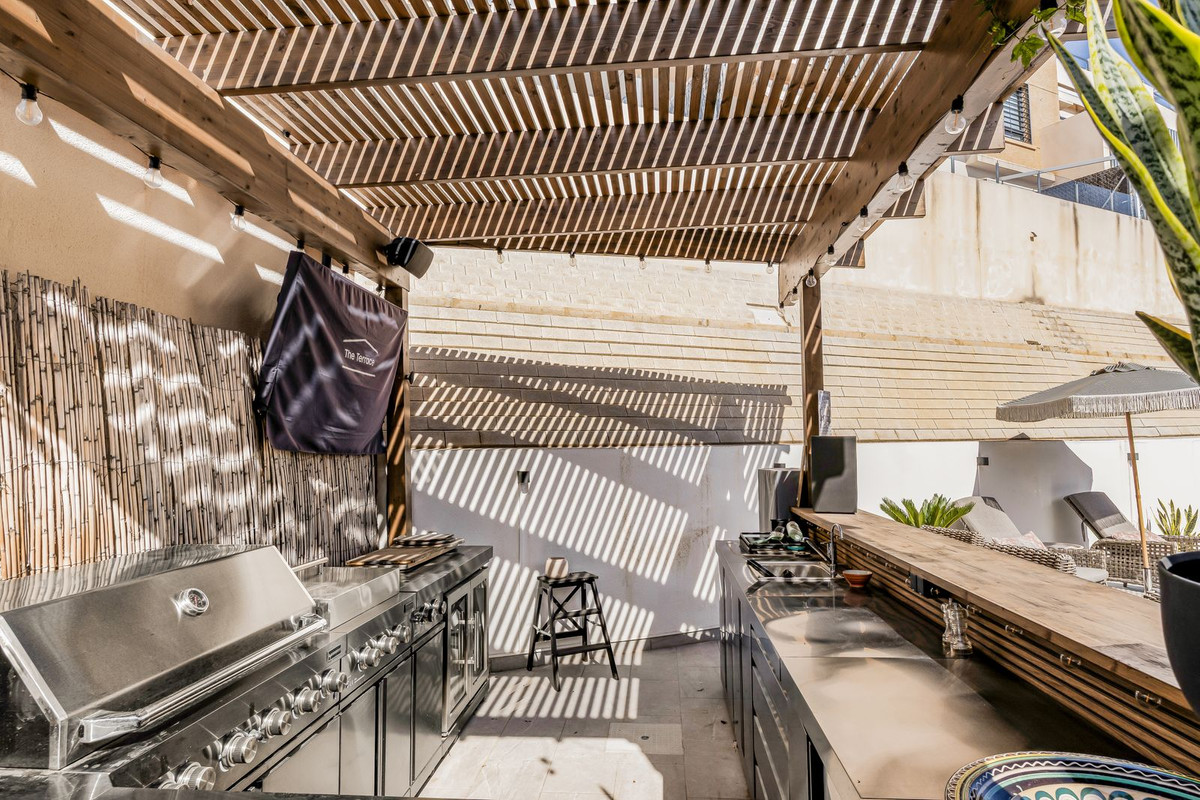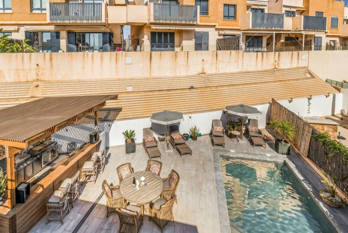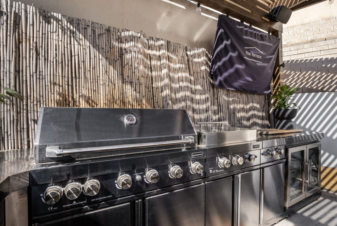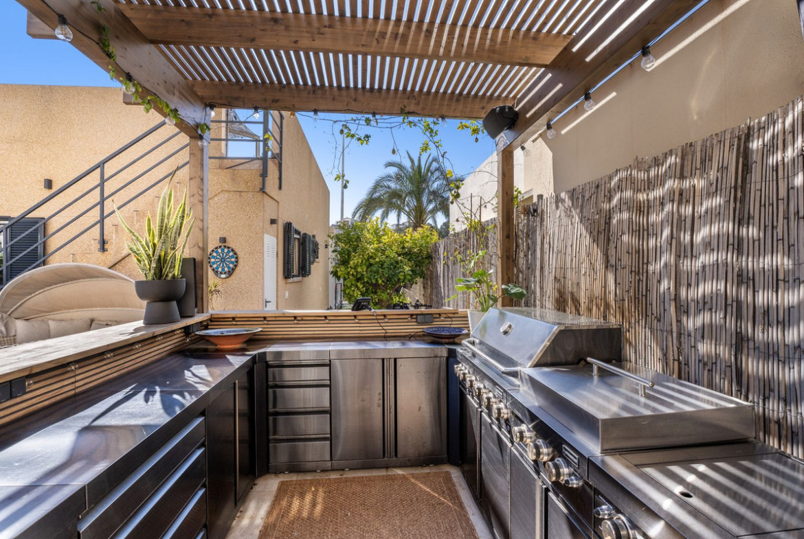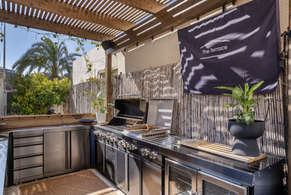 The spacious plot is a private oasis with plenty of space for both relaxation and socializing. The inviting pool becomes a natural gathering point on sunny days, and the fully equipped outdoor kitchen – with grill, Teriyaki hob and hotplates, refrigerator and drinking water – makes it easy to invite guests to long, lovely dinners outdoors. Generous sunbathing areas provide the opportunity to enjoy the pleasant climate all year round.