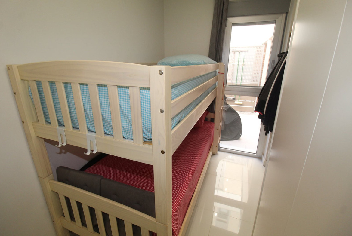<p>The interior layout of the apartment is designed to provide practical living spaces with a focus on natural light and comfort. It includes three bedrooms (two double bedrooms and one bunkbed room), two bathrooms with showers (one en-suite to the master bedroom), a modern open-plan fully equipped kitchen with a separate utility room, and a spacious living and dining area. A large terrace overlooks the communal pool and gardens, and the apartment also benefits from ample storage space in the back garden.</p