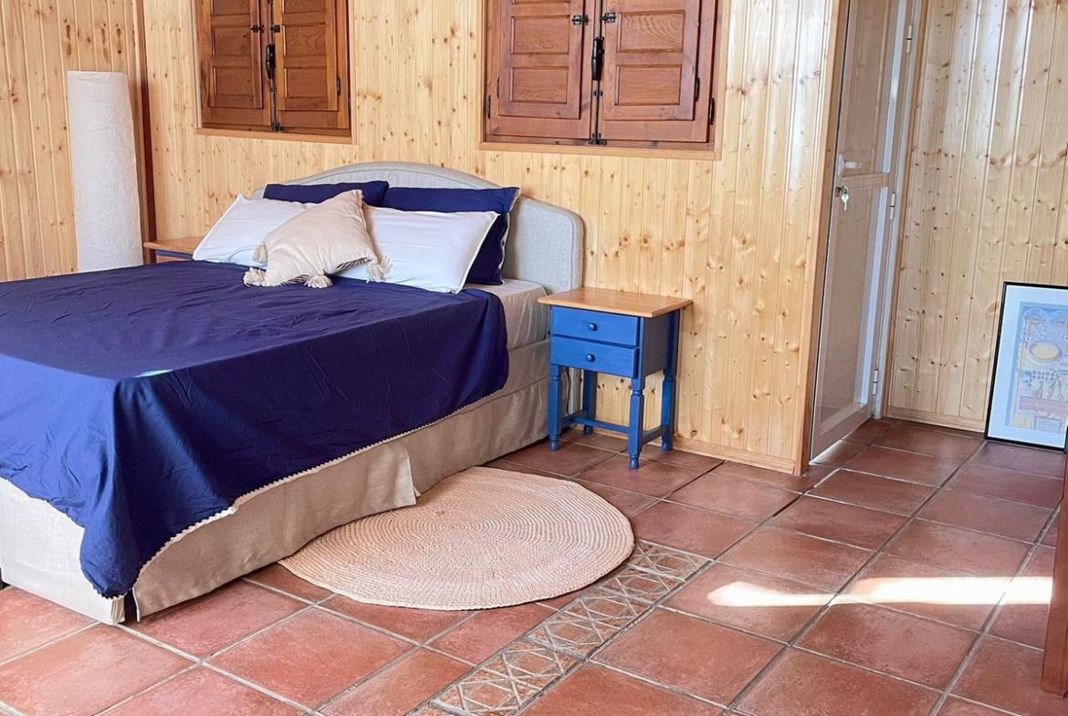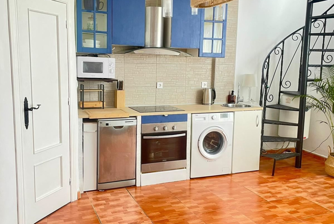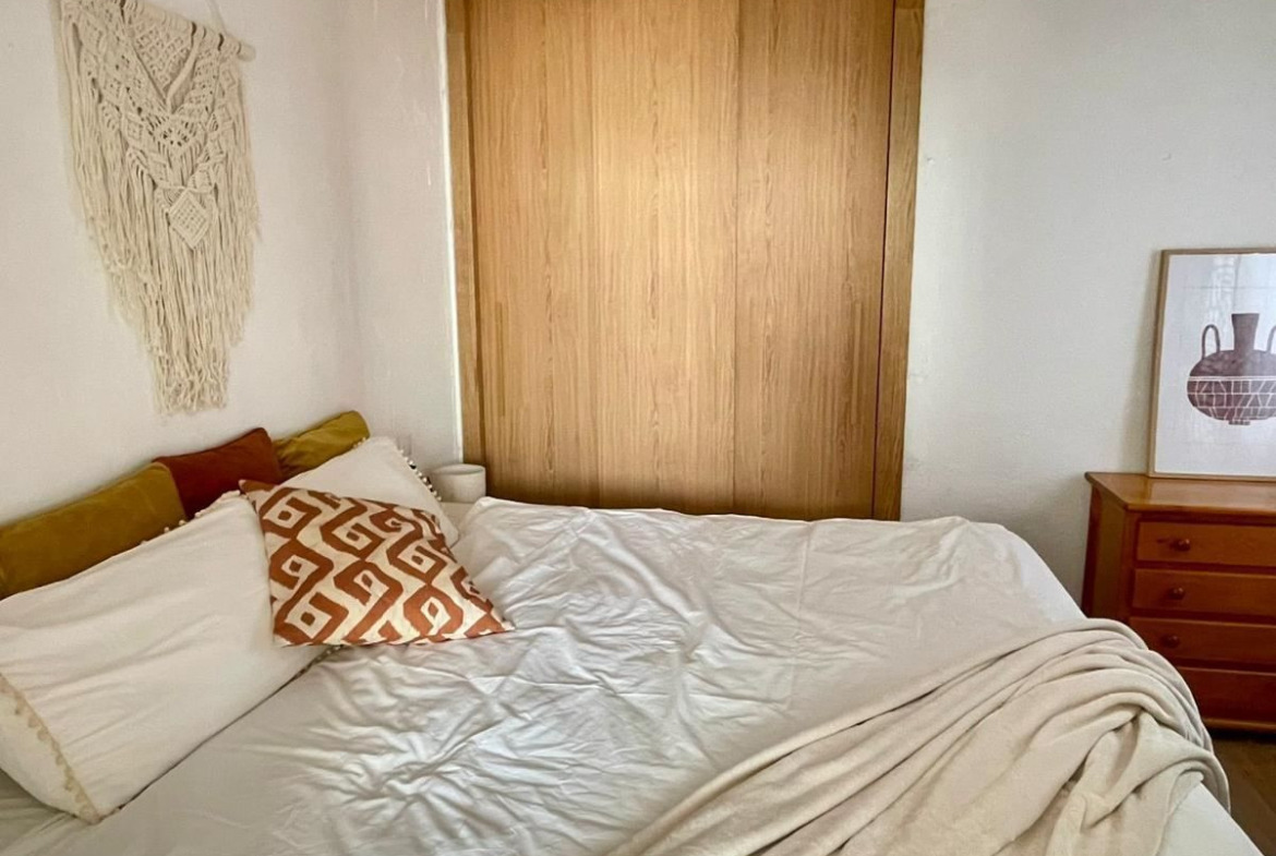 The property offers 2 bedrooms, 1 bathroom and an open plan living area with adjoining kitchen – ideal for both permanent living and holiday letting. Built-in wardrobes provide ample storage, and air conditioning ensures year-round comfort.