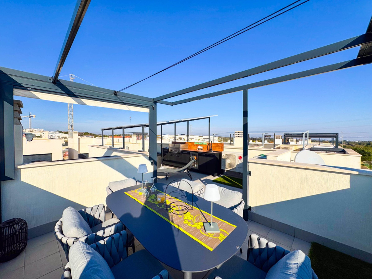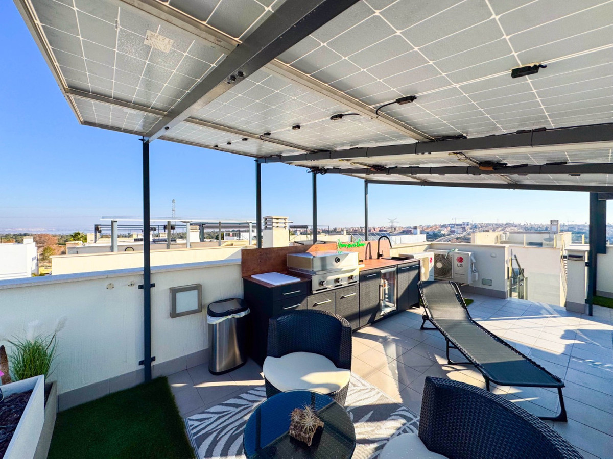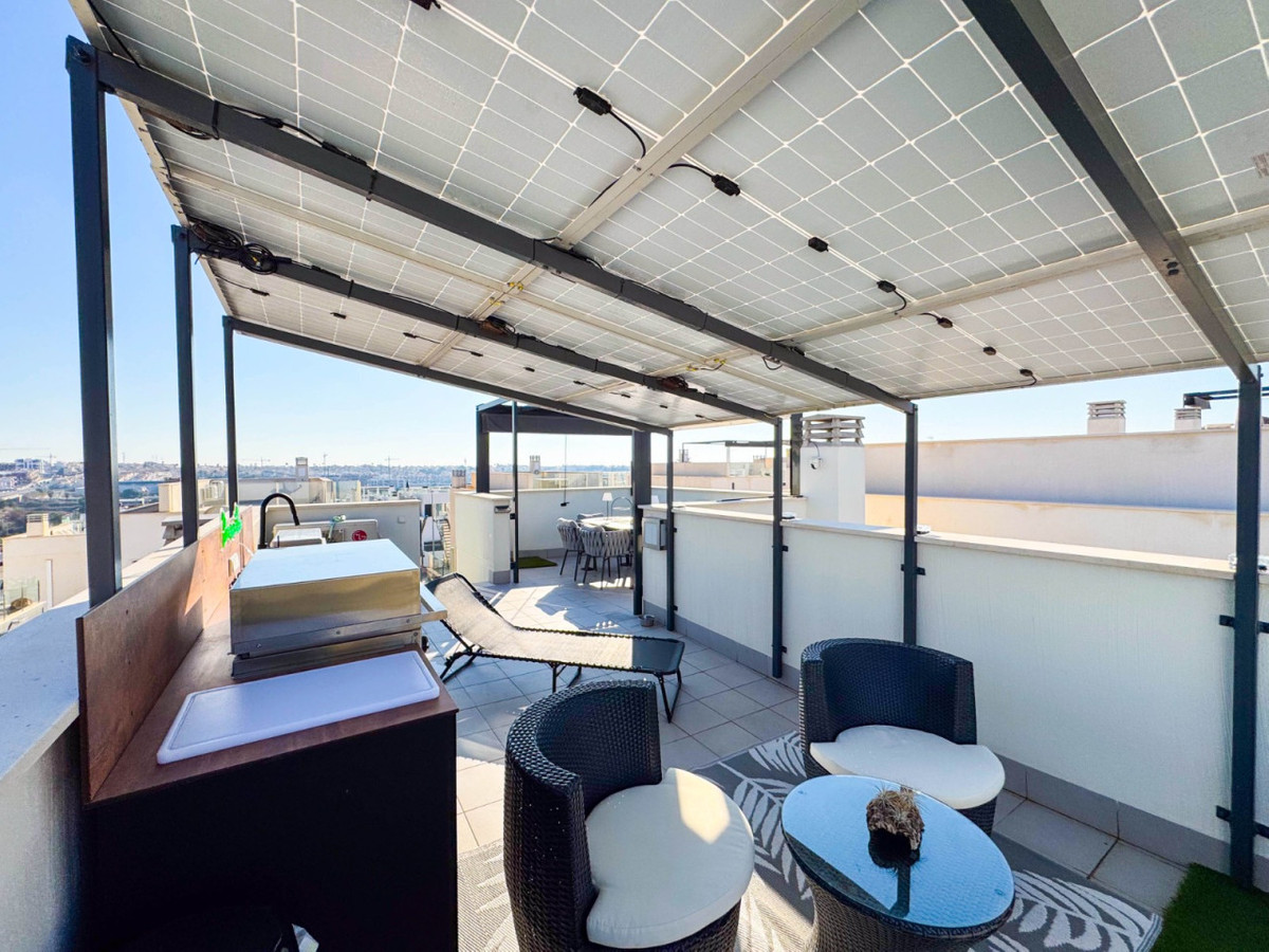 Going up to the first floor, there are 2 large bedrooms, with built-in wardrobes and pleasant views of the outdoor area. The floor is completed with another full bathroom with a modern and functional design. From this floor, you access a spectacular private solarium of 37 m², with a dining area, a pergola that will provide shade and a recently installed summer kitchen, perfect for enjoying sunny days and evenings outdoors.
