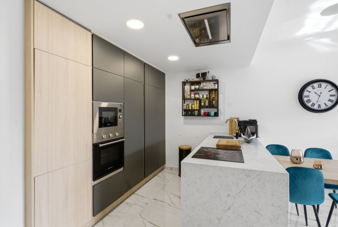 The modern designer kitchen is fully equipped with high-quality appliances and integrates seamlessly with the living room.