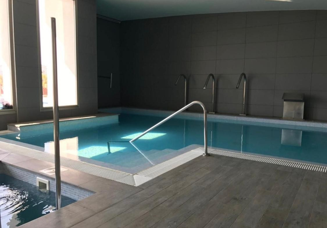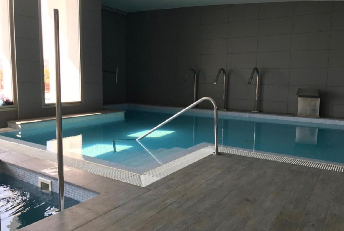 The complex, built in 2017, features an indoor and outdoor swimming pool, a spa and gym, and green areas.