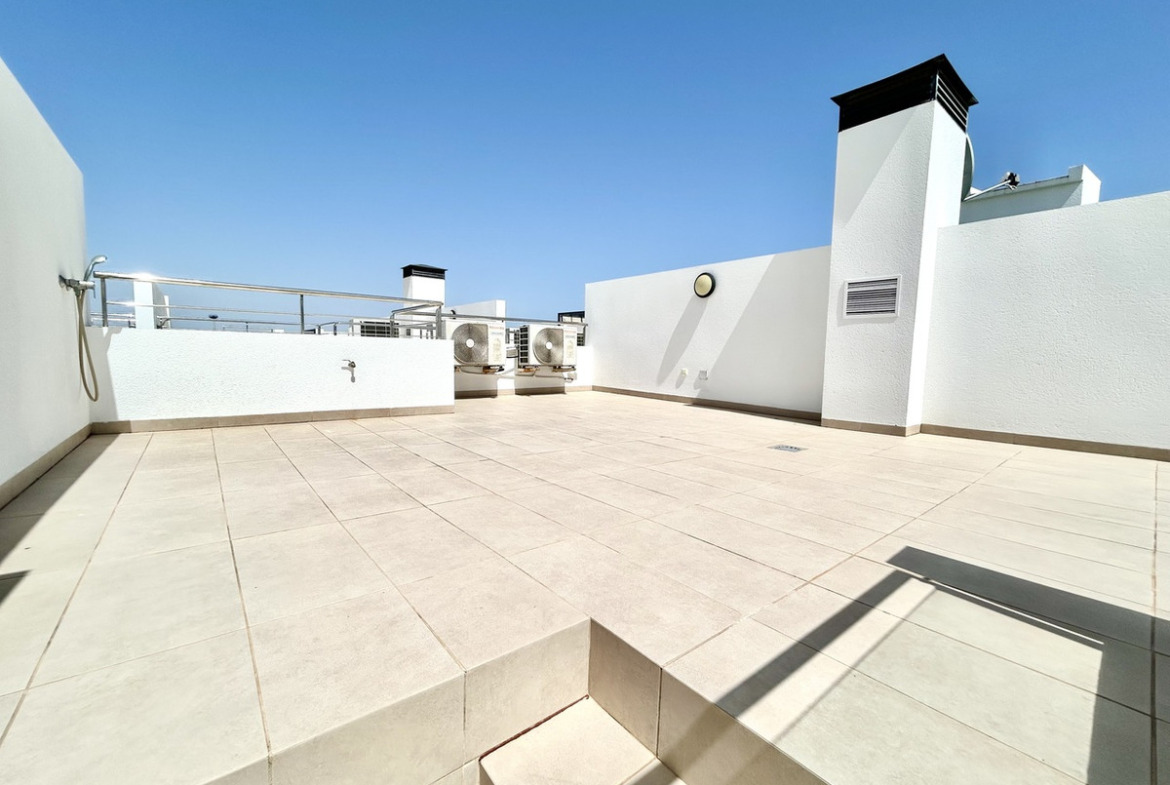 Upstairs, both bedrooms benefit from en-suite bathrooms. The master bedroom enjoys direct access to a private balcony with lovely open views, as well as access to a rooftop solarium—an ideal spot for sunbathing or relaxing while taking in the surroundings. The second bedroom also boasts its own private outdoor space, adding to the home’s appeal.
