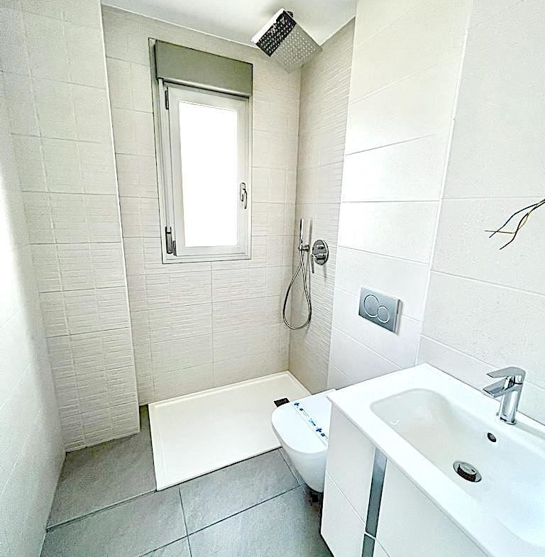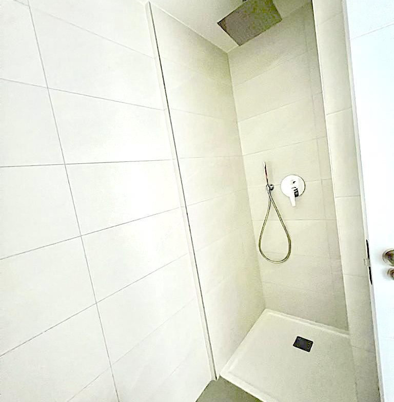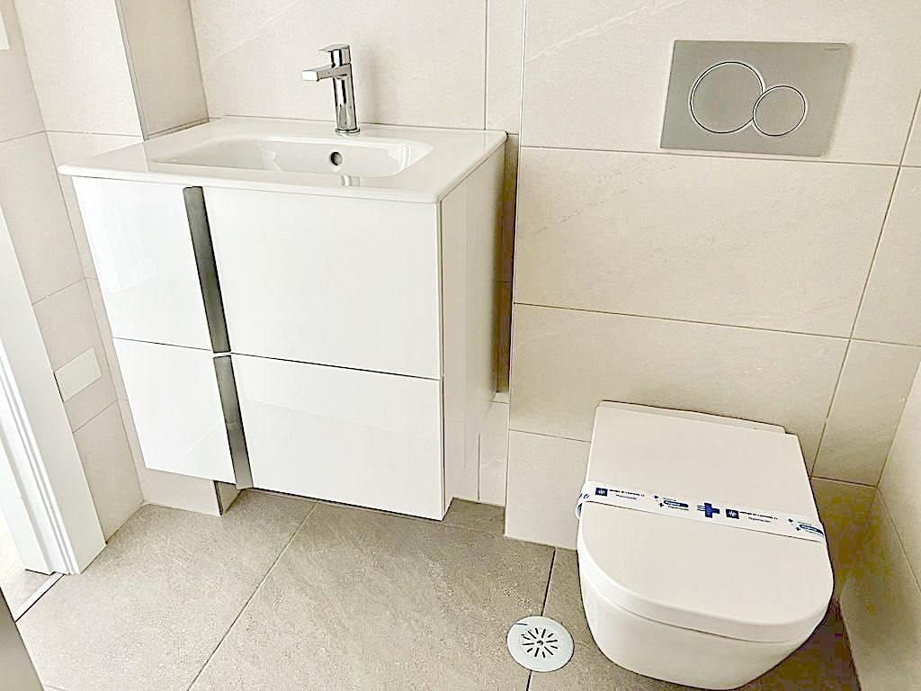 The apartment is located on the fourth floor and there is an elevator in the building. The living room has plenty of space for a sitting area and dining area, and from this room you can also reach the large balcony. The bedrooms are spacious and have space for beds and bedside tables. The two bathrooms both have a light color scheme and are equipped with a toilet, sink and shower.