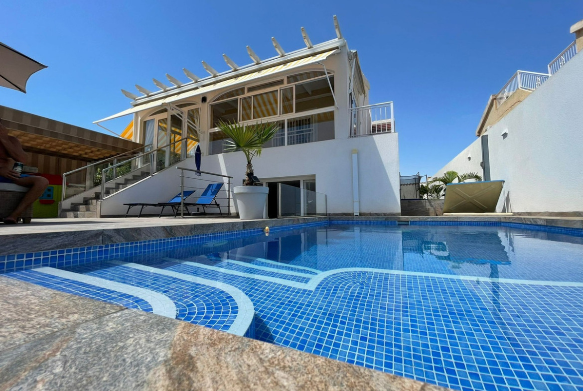 Independent house for sale in Orihuela Costa! 3 bedrooms. 3 bathrooms. Private pool. Sauna. With over 300 square meters of plot!