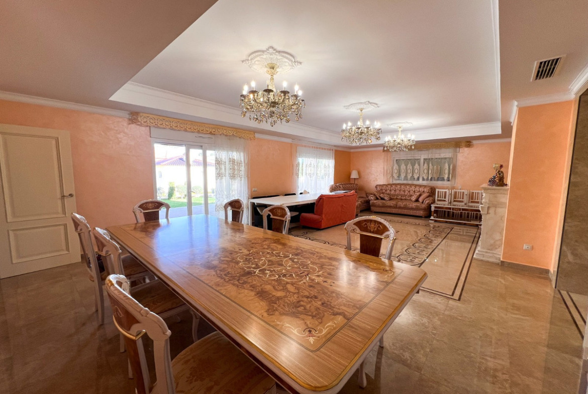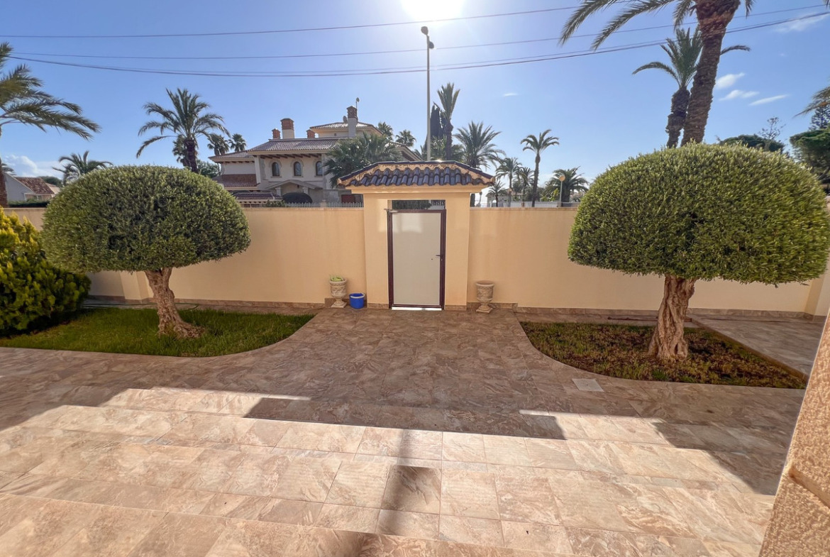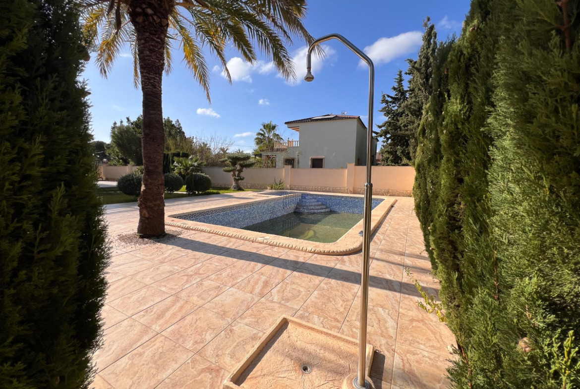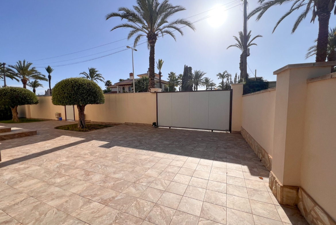 Located on one of Cabo Roig 's most prestigious avenues, this sophisticated luxury villa enjoys a privileged proximity to the sea , in an exclusive residential setting surrounded by manicured gardens and high-end villas. The property sits on a private plot of 1,313 m² and boasts 511 m² of living space . Distributed over two floors , it is complemented by a rooftop solarium with panoramic views , ideal for enjoying the Mediterranean climate year-round. In total, it features 11 bedrooms and 8 bathrooms , organized into spacious suites and separate rooms , some with en-suite bathrooms and others with shared bathrooms , designed to offer maximum comfort to both a large family and guests. Each bedroom also has its own separate dressing room , providing functionality and organization. The villa offers an elegant living-dining room with a fireplace , several versatile rooms, two kitchens , and a large porch with pleasant garden views. The exterior is complemented by a private swimming pool and a meticulously maintained natural garden. Within the garden itself is a completely independent outbuilding , equipped with bathrooms , which can be used for additional guest accommodation or for domestic or service purposes .