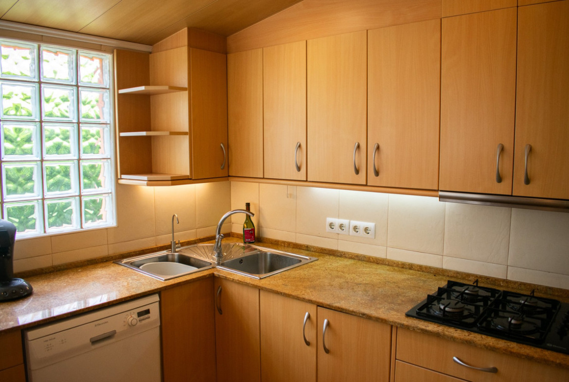 Featuring three double bedrooms and three full bathrooms , the house offers a spacious living room , ideal for family gatherings, and a modern open-plan kitchen seamlessly integrated with the dining area. The interior is further enhanced by parquet floors , a private terrace , and a glass-enclosed conservatory , perfect as a versatile space for reading or relaxing.
