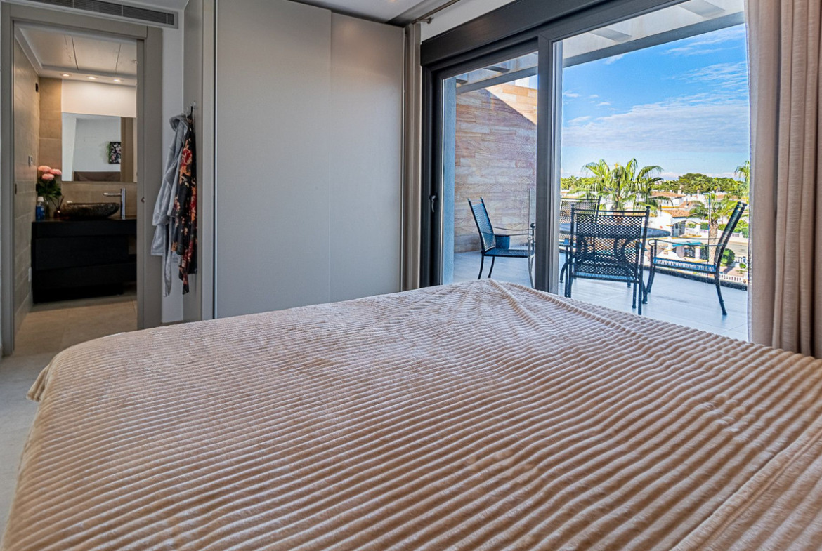 Welcome to this extraordinary duplex penthouse apartment, located in the heart of the prestigious Muna Spa & Resort in Los Dolses. Designed for an unmatched lifestyle, this home features five terraces and balconies facing both sunlit and shaded directions, making it a true retreat. With breathtaking sea views from every room and a seamless blend of modern design and premium amenities, this property is perfect for those seeking something truly special. This thoughtfully crafted home, built by one of the most renowned builders on the Costa, includes an open-plan living area that connects a bright and inviting lounge with a fully equipped modern kitchen. The kitchen features sleek finishes, clever storage solutions, and stylish wooden shutters, while an adjacent utility room provides additional functionality with space for a washing machine and water heater. The apartment boasts three generously sized bedrooms, all with built-in wardrobes. The master bedroom and one other bedroom open directly onto private terraces or balconies, perfect for unwinding in peace. Two elegant bathrooms, one en-suite, are beautifully designed with contemporary earthy tones, adding a touch of sophistication. Step out from the living room onto a spacious terrace complete with an awning, providing a cool escape on hot days. The upper level offers another terrace featuring an outdoor kitchen, barbecue, and dining area – ideal for hosting meals while soaking in the stunning views.The standout feature of this stunning penthouse is the expansive roof terrace. Here, you can relax in the jacuzzi, lounge in the seating area, or sunbathe in privacy while enjoying panoramic sea views. This space is perfect for summer evenings, alfresco dining and entertaining. Located at the stunning Muna Spa & Resort, built to an exceptionally high standard by one of the most renowned builders on the Costa with stunning communal areas including an impressive communal pool, indoor heated pool, sauna , gym and immaculate landscaped gardensSituated within walking distance of restaurants, shops, and supermarkets, the apartment offers unparalleled convenience. Walking to the local amenities of the commercial area of Los Dolses, plus the renowned La Zenia Boulevard shopping centre, with its vast array of stores and entertainment options, is just minutes away, while stunning beaches and top-tier golf courses are a short drive from your doorstep. Contact us today for your viewing