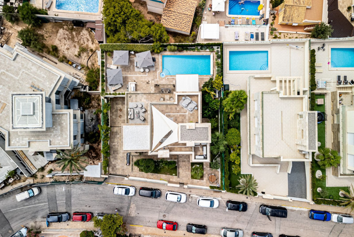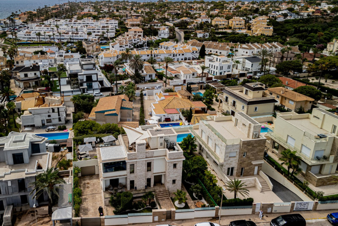 This contemporary beachside villa, built in 2022, offers luxury coastal living just steps from the sea. Set on a 665.66 m² gated plot, the home boasts 442 m² of living space across multiple levels—including a 186.60 m² underbuild featuring a spacious private gym, a large guest bedroom, and direct access to the private garage with room for up to two cars and generous storage space. The layout includes an open-plan living and dining area with expansive floor-to-ceiling windows, a statement fireplace, and a sleek modern kitchen, complemented by a fully equipped utility/laundry room. The home offers six spacious bedrooms and four designer bathrooms—each fitted with Arital design elements and premium Wolf appliances.Enjoy the Mediterranean breeze in over 426 m² of private garden and outdoor living space, surrounded by tropical landscaping, mature palm trees, and premium finishes. The 40 m² climate-controlled swimming pool includes a double-engine-powered stream—perfect for both fitness and relaxation. The 78.80 m² rooftop solarium offers panoramic sea views and features an outdoor kitchen and BBQ area—ideal for entertaining. Located just a few hundred metres from La Zenia Beach, with shops, restaurants, and La Zenia Boulevard all within walking distance. Excellent connectivity via the nearby N-332 coastal road.The property is thoughtfully designed, and the current owner has imported many extras from Sweden, including a 150,000 euro luxury kitchen with high-end appliances, solar panels (9 kW), Tripiu designer doors, Travertine natural stone tiles at the facade, and reinforced bulletproof, anti-vandal windows and doors.A sophisticated fancoil cooling system ensures silent, energy-efficient climate control throughout the home, delivering optimal comfort and air quality year-round.The villa is fully furnished with curated, high-end pieces and showcases designer lighting throughout. It also features a state-of-the-art multi-zone audio system from Mezzanine Audio, with high-end speakers integrated throughout both the interior and exterior. The garden includes an outdoor sound system by Sonance, while each terrace features built-in speakers. Inside, the living room, kitchen, master bedroom, gym, and a guest bedroom are equipped with "invisible" ceiling speakers—seamlessly blended into the architecture. All zones are centrally managed via a Sonos intelligent control system, allowing intuitive operation through app-based domotic technology.This villa must be seen to be fully appreciated—offering a rare combination of architectural elegance, intelligent living, and premium luxury finishes in one of the Costa Blanca`s most exclusive coastal settings.