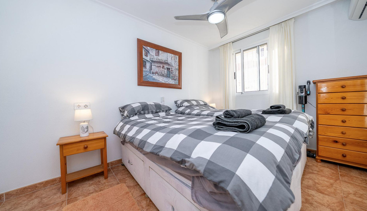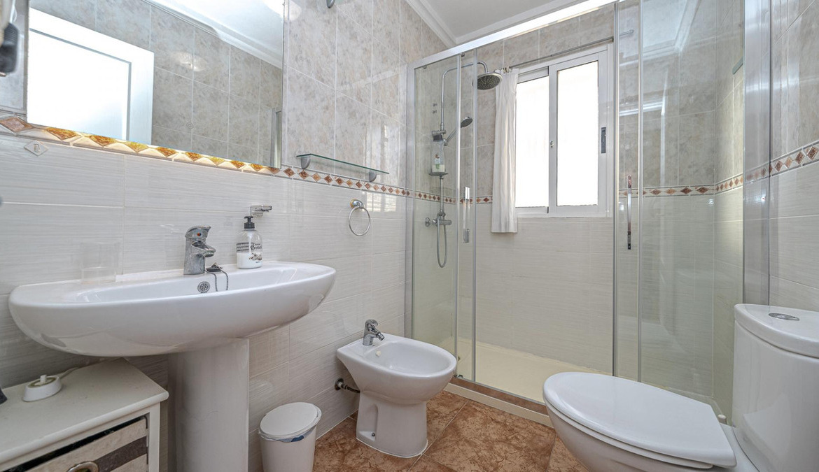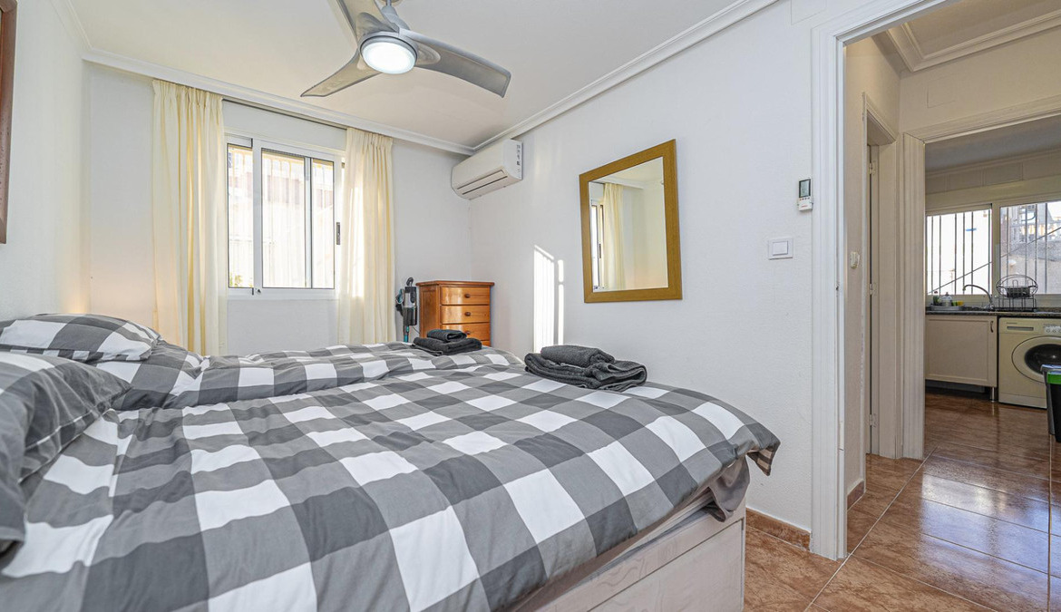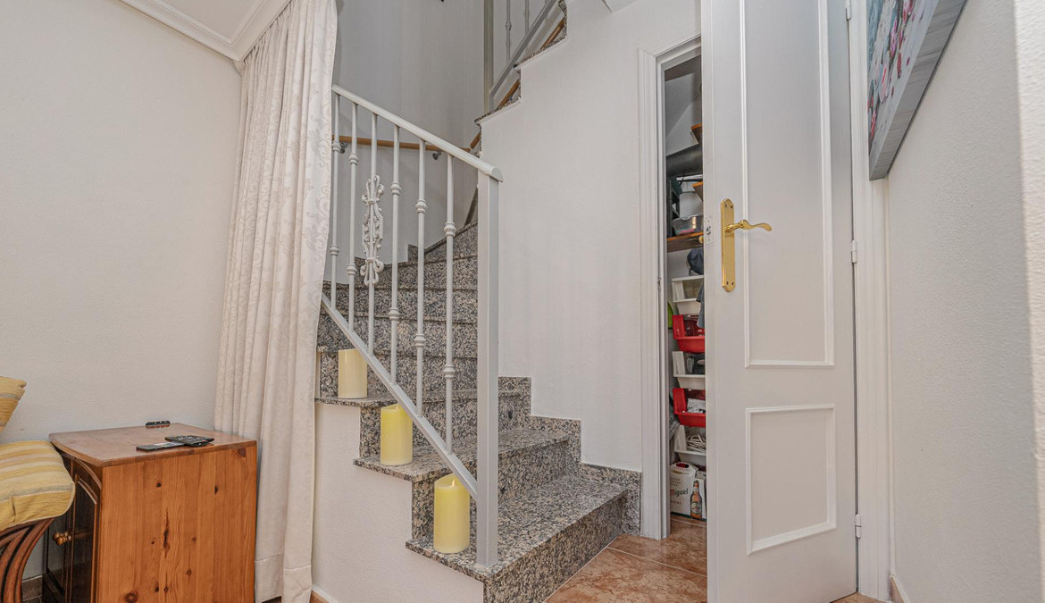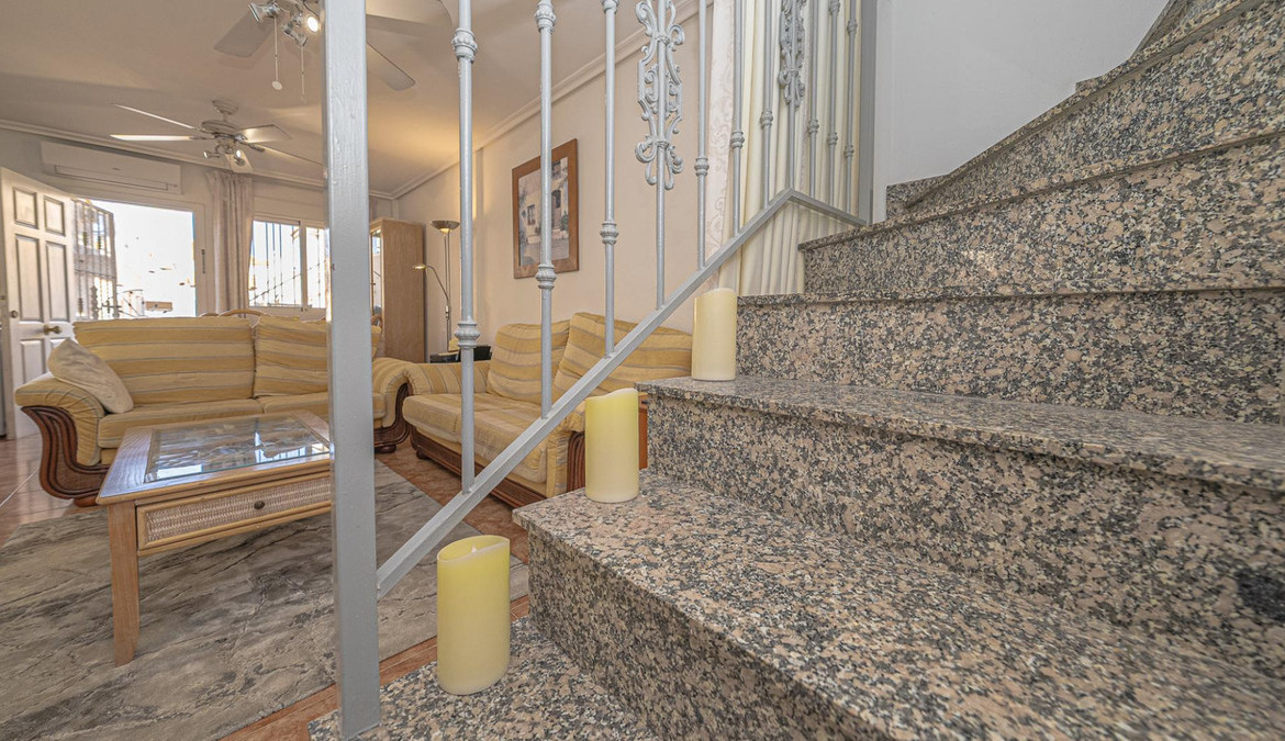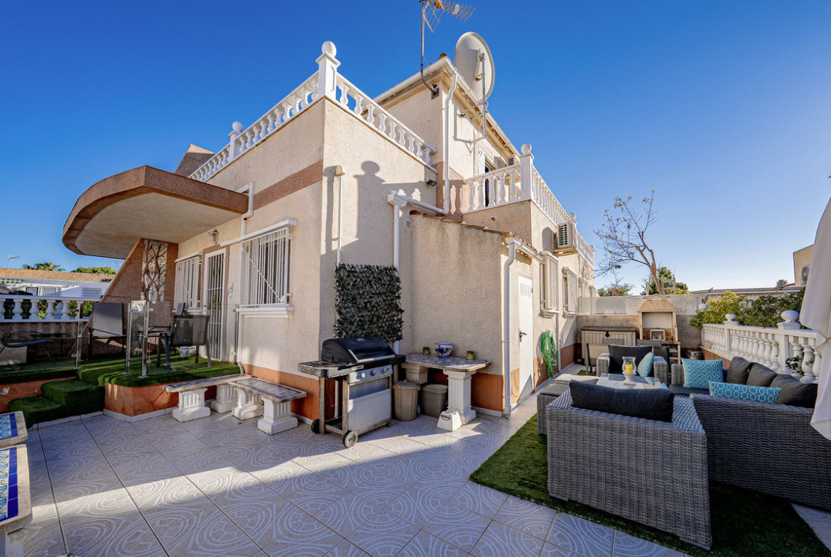Well presented 3 bedroom 2 bathroom quad villa in the La Regia area of Cabo Roig. This charming home is in excellent condition and  ideal for holidays or permanent living. The living room/dining room is open plan with ample space and renovated, built in wall display unit, semi open modern fitted kitchen with American breakfast bar, spacious under-stairs storage room, plus for added convenience a  ground floor bathroom, with walk in shower, double bedroom, The second floor offers a further 2 double bedrooms  both with access to private balcony terraces and  a fully renovated bathroom with walk in shower,  Outside space offers ample terraces, patio garden laid to artificial grass  and tiles with newly installed glass panels and on site parking. The property benefits from air conditioning, infrared panel heaters, ceiling fans, pvc guttering, white goods, part renovated and fully furnished and is totally key ready. Charming community with communal swimming pool, gardens, football pitch, and children's park, Quiet location walking distance to the renowned Cabo Roig strip (Under a 10 minute walk)  which hosts many shops, cafe- bars restaurants and supermarkets, the sandy blue flag beach of La Caleta, Cabo Roig is under a 15 minutes walk, and only a short drive to the La Zenia boulevard shopping centre and many first-class golf courses. Contact us today for a viewing.