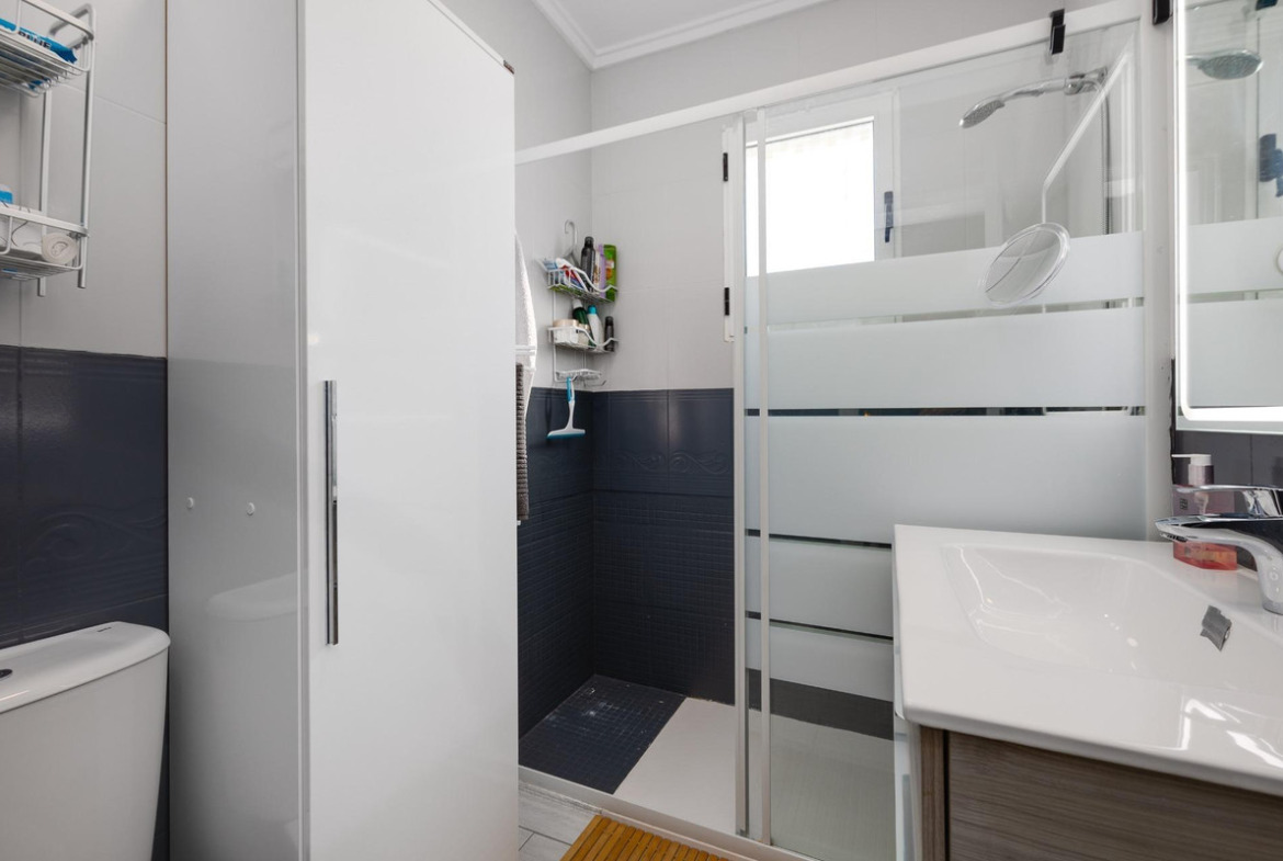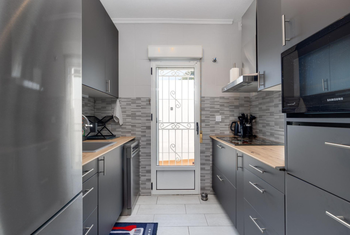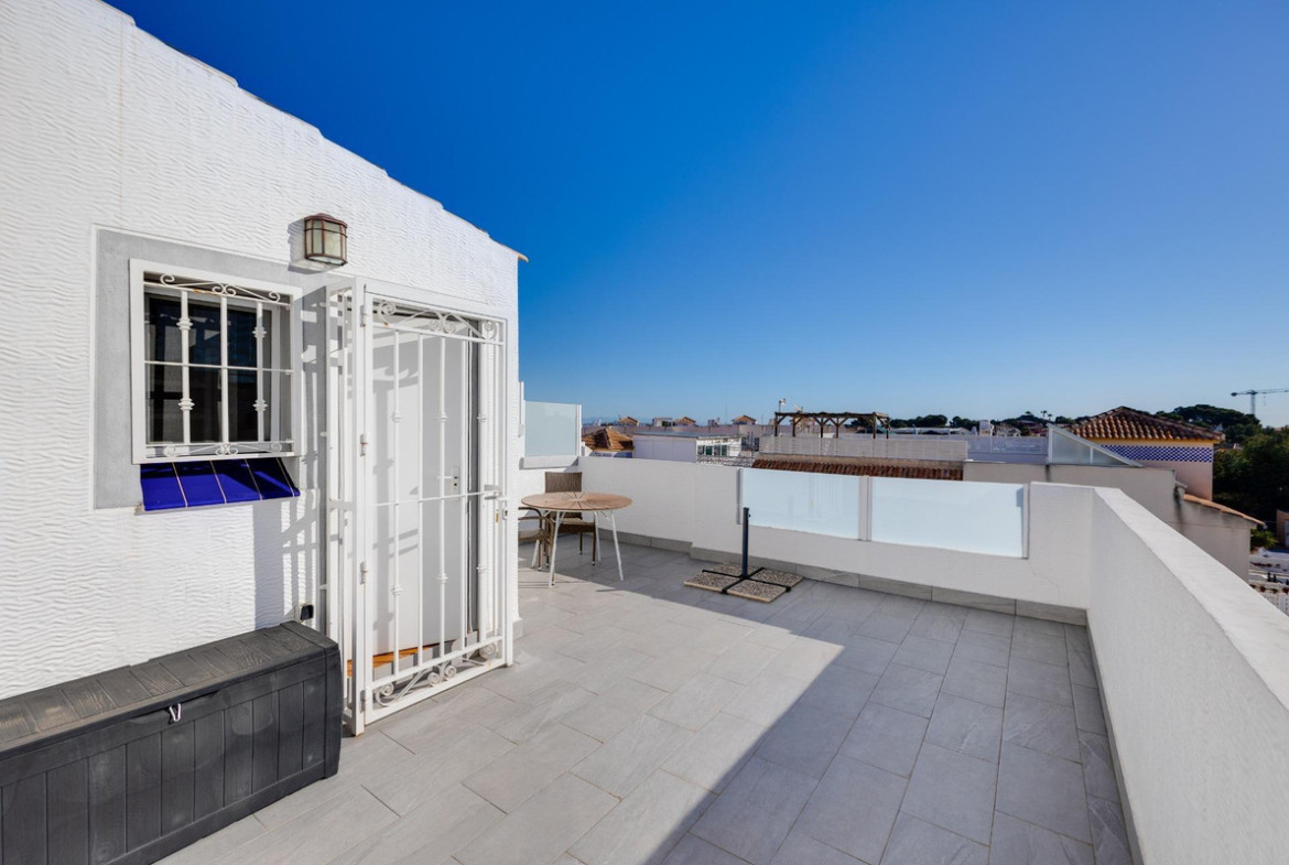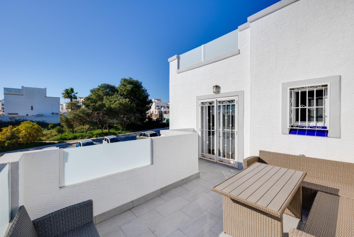 We present to you this stunning quad-style townhouse located in the desirable Dream Hills community of Los Altos. This beautifully furnished property features three spacious bedrooms ????️ and two modern bathrooms ????, making it perfect for families or those seeking a holiday retreat. Enjoy plenty of sunshine in your expansive garden ????, which includes a lovely porch area and an entrance suitable for vehicle parking ????. You will also appreciate the convenience of having private laundry facilities ???? and ample storage space with a dedicated storeroom.On the first floor, you'll find another large terrace ideal for relaxation ☕???? as well as access to your own private solarium showcasing breathtaking unobstructed views ????! The location is just 300 meters from communal swimming pools????‍♂️ surrounded by lush green areas ????and free padel courts available exclusively for residents ????.Private numbered resident parking ensures ease when returning home after exploring all that nearby Torrevieja (10 minutes away) has to offer ????. La Zenia beach is also within easy reach—just like other beautiful beaches within ten minutes' drive ⏱️????!Don’t miss out on this exceptional opportunity ; make it yours today!