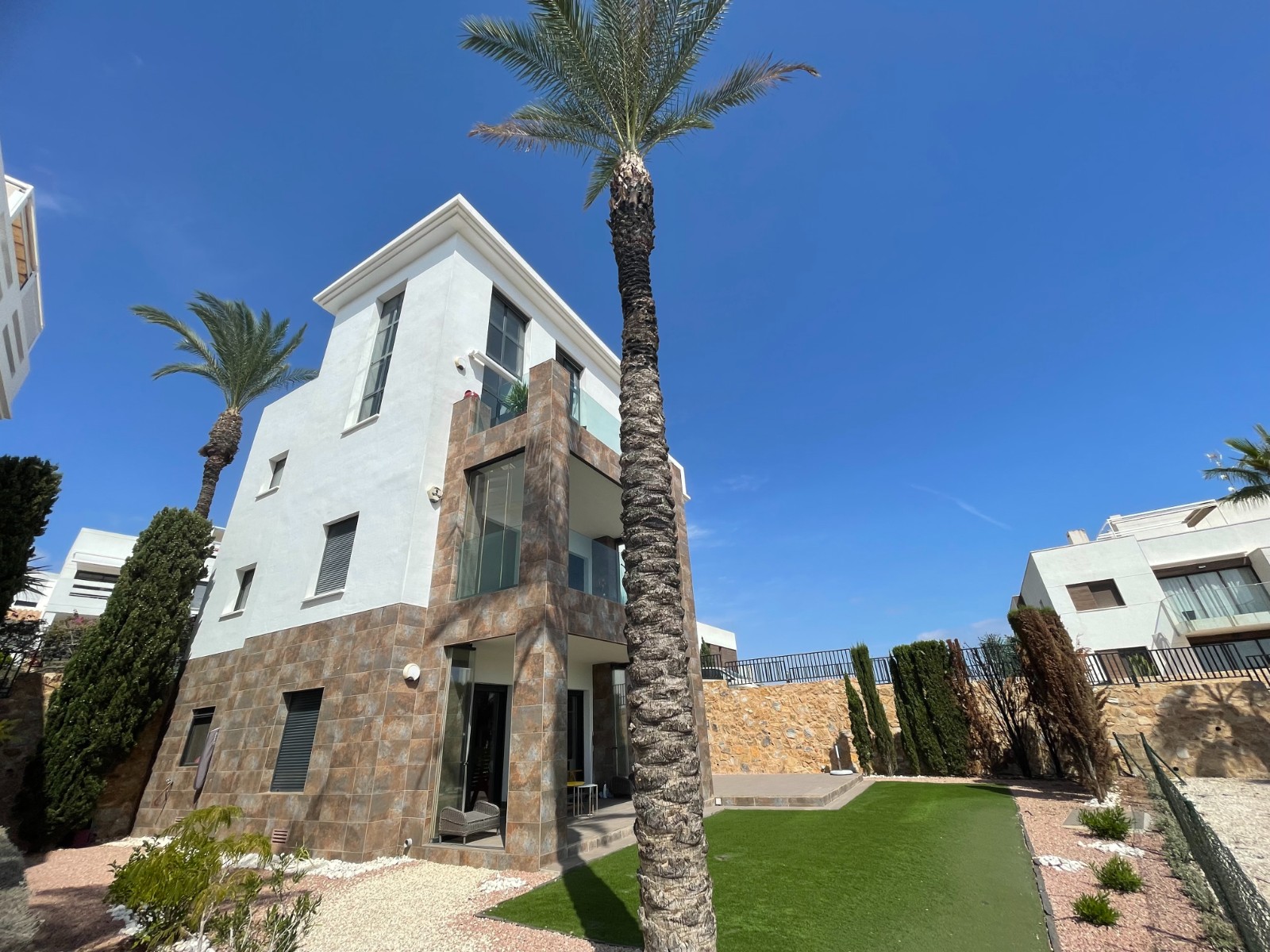 This South East Facing, Three Bedroom, Penthouse Duplex Apartment on Las Ramblas Golf is located on the edge of this prestigious golf course, also bordering Campoamor Golf. Just a short drive takes you to Villamartin, the popular La Zenia Boulevard shopping centre, and the beautiful beaches along the Orihuela Costa, reached in around 10 minutes. This stunning home of modern architectural design offers 97m² across two floors, boasting an elevated position with incredible views — yet with the main living area conveniently accessed at ground level. The bright lounge/dining room features two sets of glazed sliding doors out to the terrace, with part of the room enjoying a vaulted ceiling and an ultra-modern open stairway, allowing you to fully appreciate the spectacular open views through the floor-to-ceiling feature window. A well-fitted kitchen with breakfast bar, two double bedrooms, and a family shower room complete this floor. The first floor hosts the master bedroom with en-suite shower room and direct access to a striking L-shaped terrace, complete with retractable awning and useful storage cupboards — the perfect spot to relax and take in the views. Set within a beautifully maintained and presented community, residents benefit from a stunning infinity communal pool and gated parking facilities. Extras include air conditioning. A truly exceptional property where “stunning” is simply not enough to express the qualities and luxury this home offers on the Costa Blanca South.