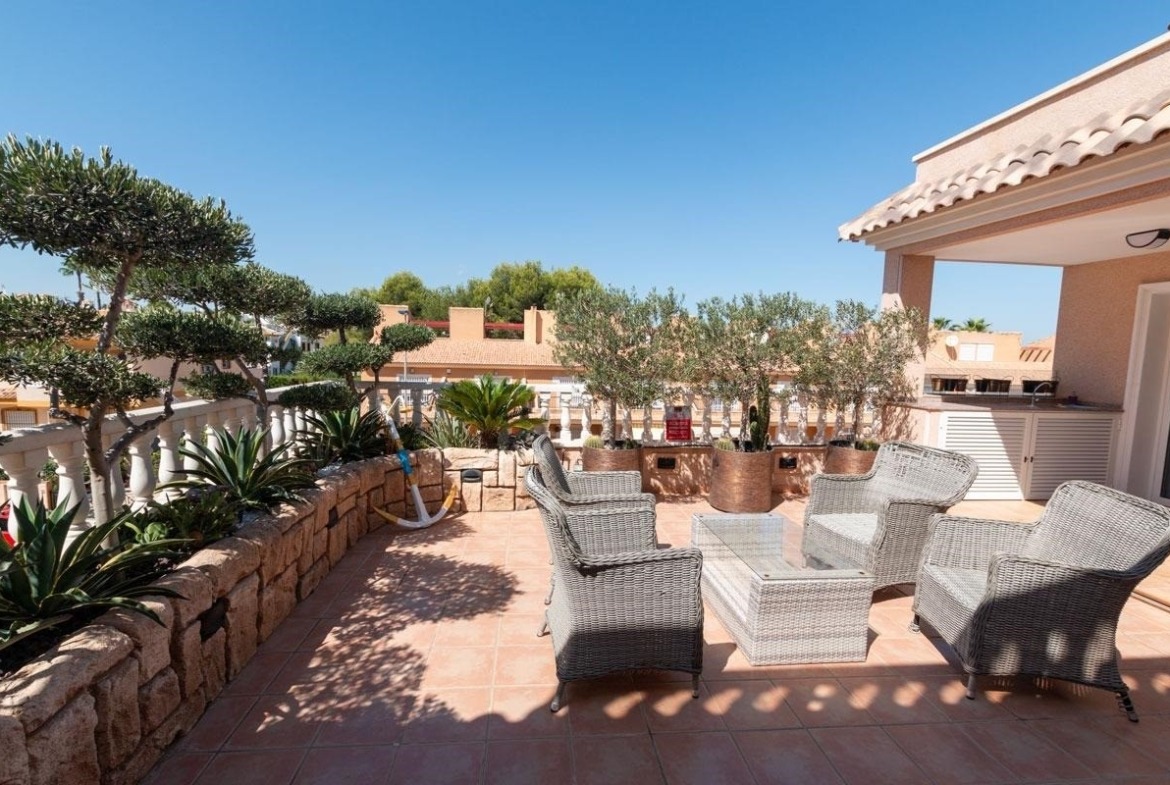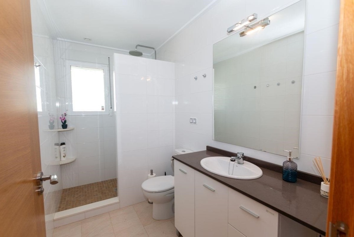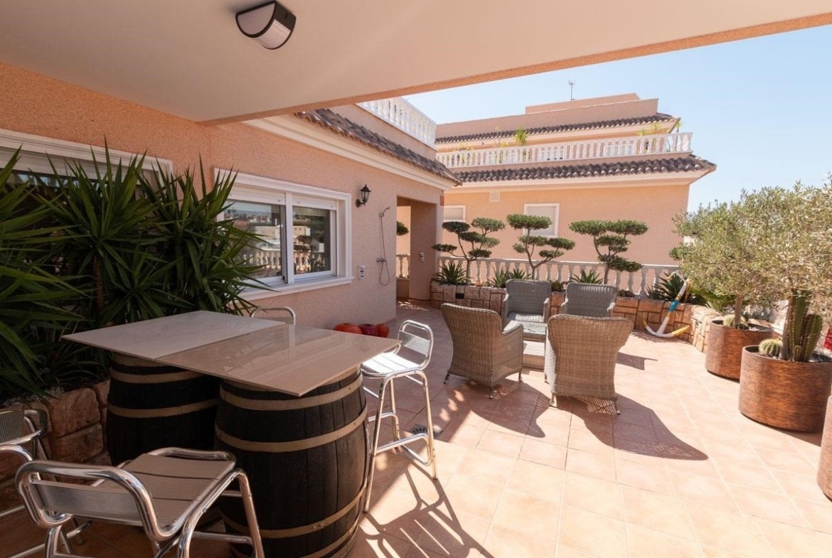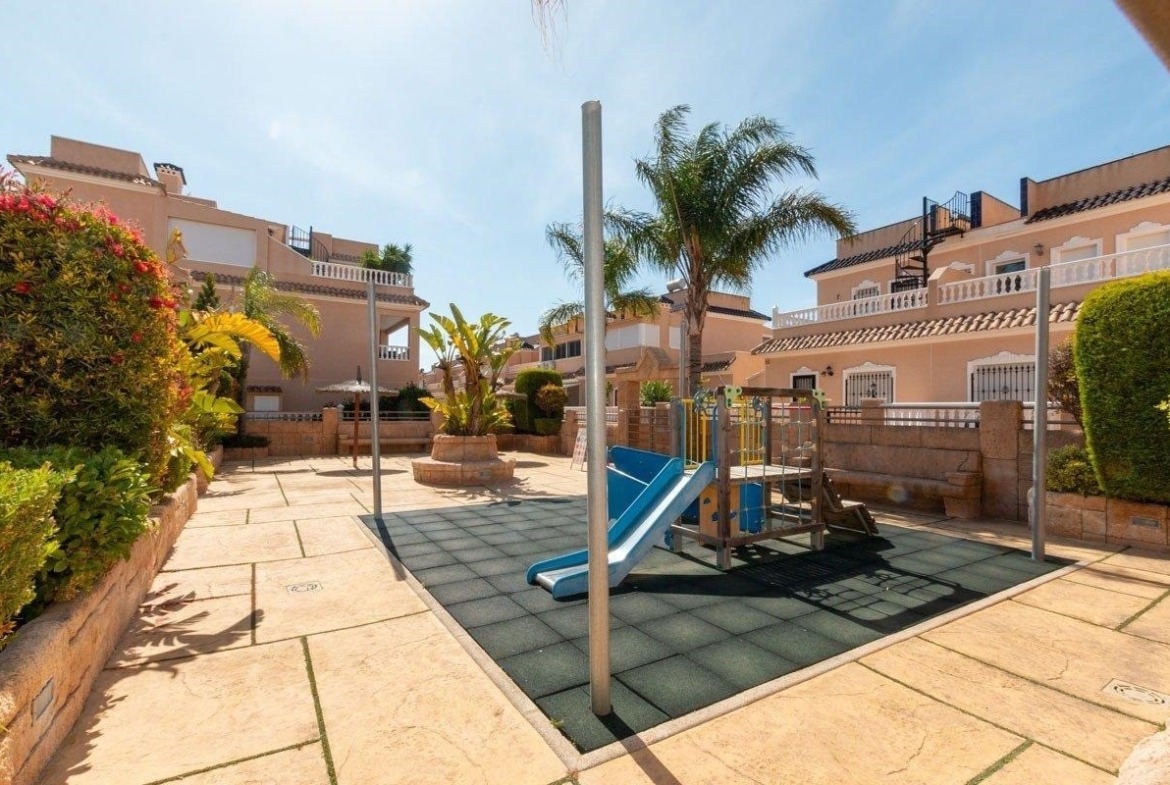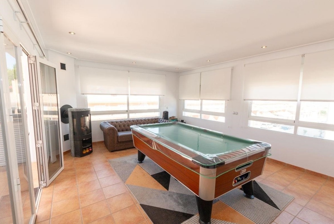 This South-East Facing, Three Bedroom, 2nd Floor Apartment in Los Dolses, Villamartin, is located in a desirable area of the Orihuela Costa, just a 4 minute drive to a great selection of supermarkets, bars, and restaurants and less than a 10 minute drive to the beautiful sandy beaches of the Costa Blanca South. This contemporary apartment features an open plan, fully fitted kitchen and a spacious lounge/dining area with air conditioning, leading out through patio doors to a huge corner terrace — ideal for relaxing or entertaining. There are three double bedrooms, all with air conditioning and fitted wardrobes, including a master bedroom with en suite shower room. A second contemporary shower room serves the rest of the property. An additional lounge area, complete with a pellet burner and pool table, offers a wonderful extra space for leisure and socialising, and also provides access to the large terrace. The terrace itself includes an outdoor sink and a handy storeroom, perfect for practical outdoor living. Residents benefit from excellent communal facilities, including two swimming pools (one heated), a sauna, gym and a children’s play park. The apartment also boasts underfloor heating throughout, a basement car parking space and access to beautifully maintained communal areas. A truly impressive property offering modern comfort, style, and convenience in a highly sought-after location on the Costa Blanca South.