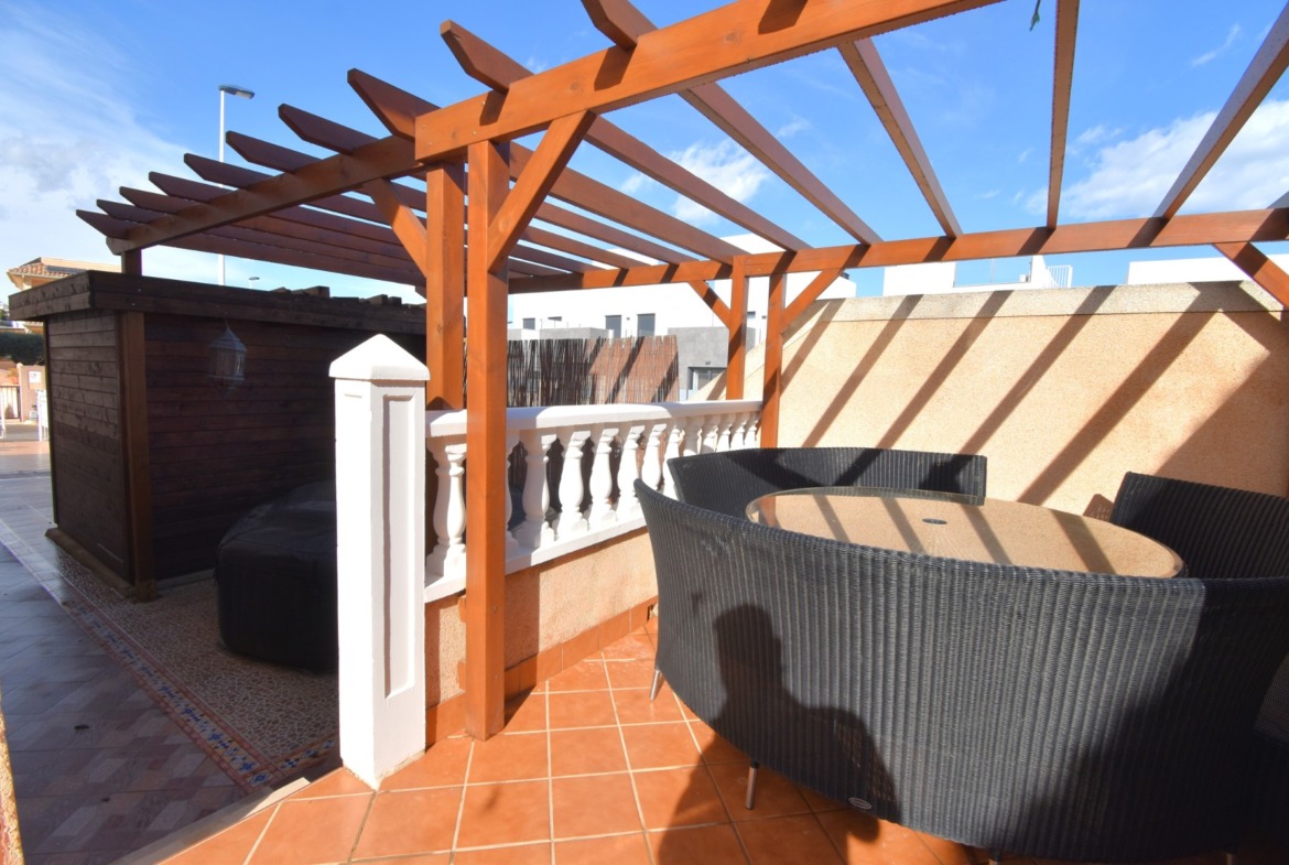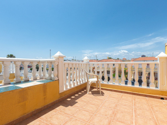 This West Facing, Three Bedroom, End Townhouse in Los Balcones is located close to the Filton commercial centre, with a variety of café bars and eating places also within a 10–15 minute walk. A main chain supermarket and Torrevieja Hospital are just a couple of minutes’ drive away, while the amenities of the Orihuela Costa, including La Zenia Boulevard shopping centre, beautiful beaches, and several golf courses, can all be reached within 10 minutes. This makes it a superbly positioned home on the Costa Blanca South. Occupying an impressive corner plot of 153m², this well-presented townhouse offers a 91m² build. A covered entrance terrace leads into the living room, which benefits from air conditioning and stairs leading up to the first floor. The ground floor also comprises a separate fitted kitchen with a door leading out to the rear of the property, a convenient cloakroom, a double bedroom, and a shower room. On the first floor, there are two further double bedrooms, with the master bedroom enjoying access to a private terrace. A family bathroom completes this level, featuring a corner jacuzzi bath for added comfort. Built-in wardrobes are included, providing excellent storage throughout the home. The exterior space is a real highlight, with a fully tiled garden offering off-road parking, a pebbled area with planted shrubs and trees, and additional tiled space to the rear. Further benefits include a store room and a wooden shed. Residents also have access to a lovely communal swimming pool with tiled and grassed surround, along with community parking. This spacious end townhouse is ideal as a family home, holiday property, or investment, offering generous outdoor space and a prime location on the Costa Blanca South.