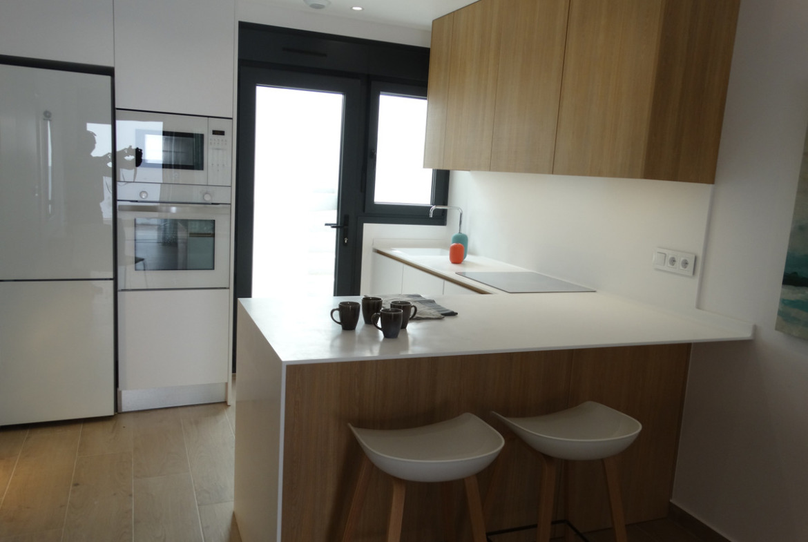 The development in Pilar de la Horadada, is in one of the most charming areas of the Costa Blanca. With white sand beaches and all the amenities 5 minutes walk. You could reach one of the most outstanding beaches in the area through a nice walk in "the Rambla" which will take you directly to "playa de las Higuericas". Residencial – 35 properties, Most of them facing South and with swimming pool and park views.
