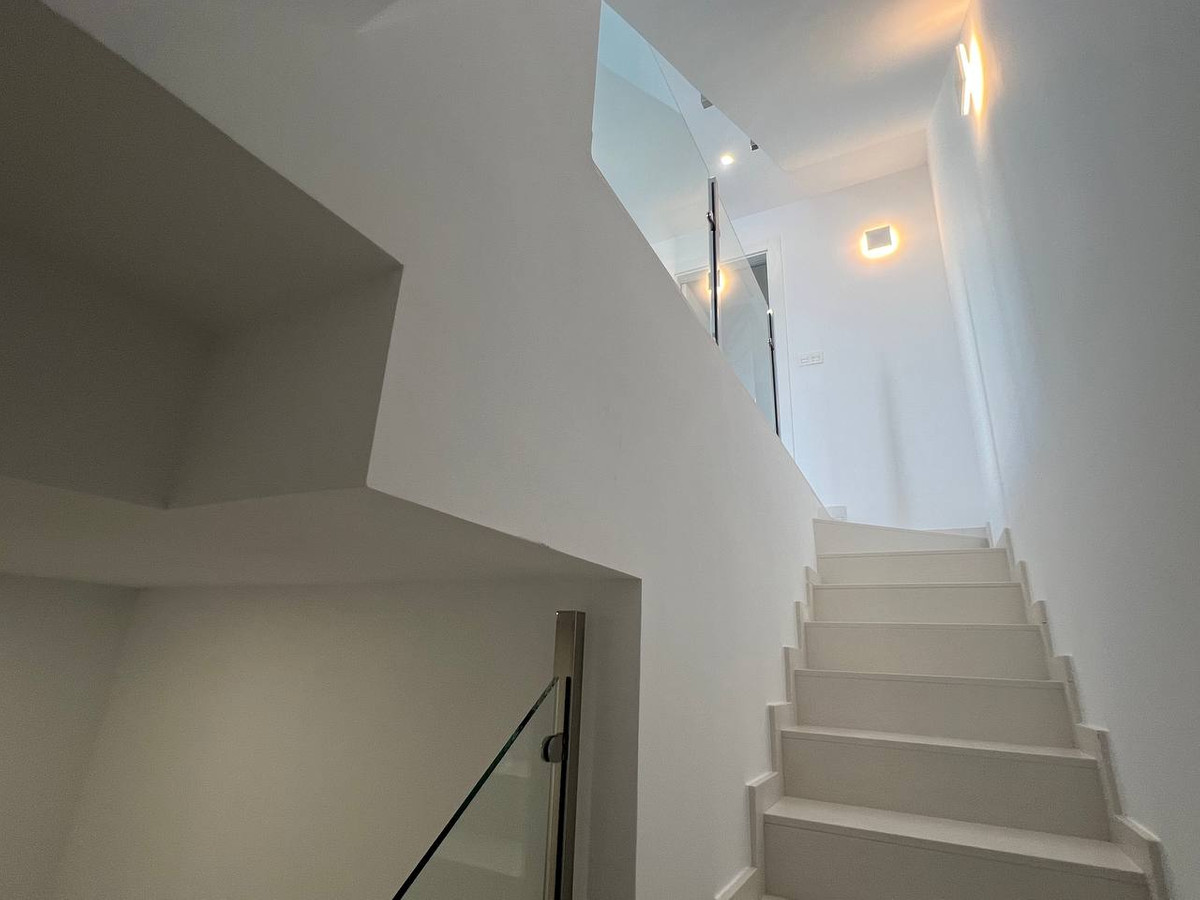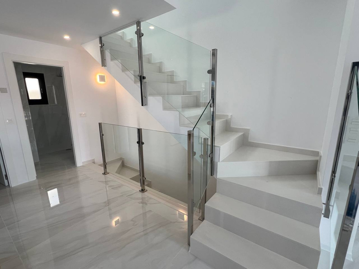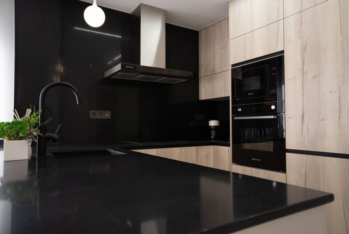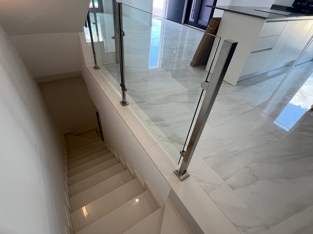 The kitchen is fully equipped with upper and lower cabinets, a synthetic quartz countertop, sink, and stainless steel hood extraction. It also includes pre-installed spaces for a dishwasher, washing machine, and water heater, with pre-installed air conditioning ducts for year-round comfort. For relaxation, the solarium is pre-equipped with a Jacuzzi and kitchen, and the walkable roof is insulated for energy efficiency. The energy-saving system incorporates aerotermia to optimize hot water usage, enhancing sustainability.