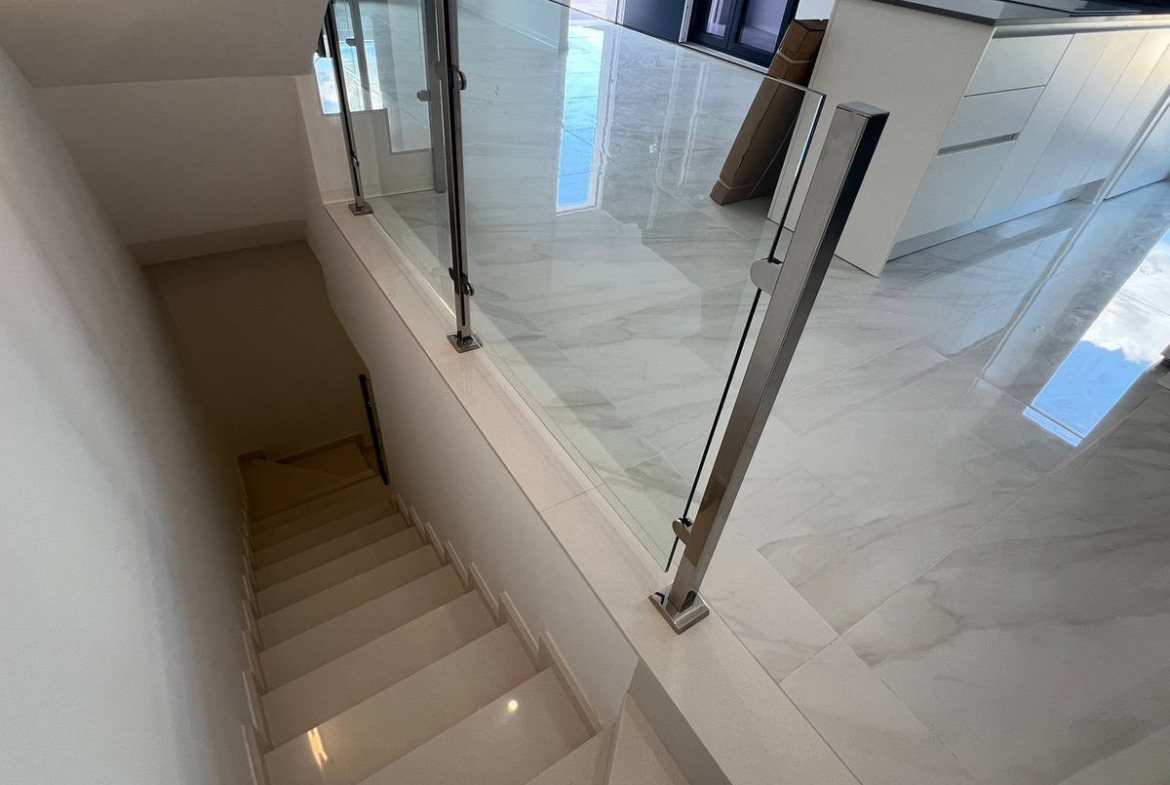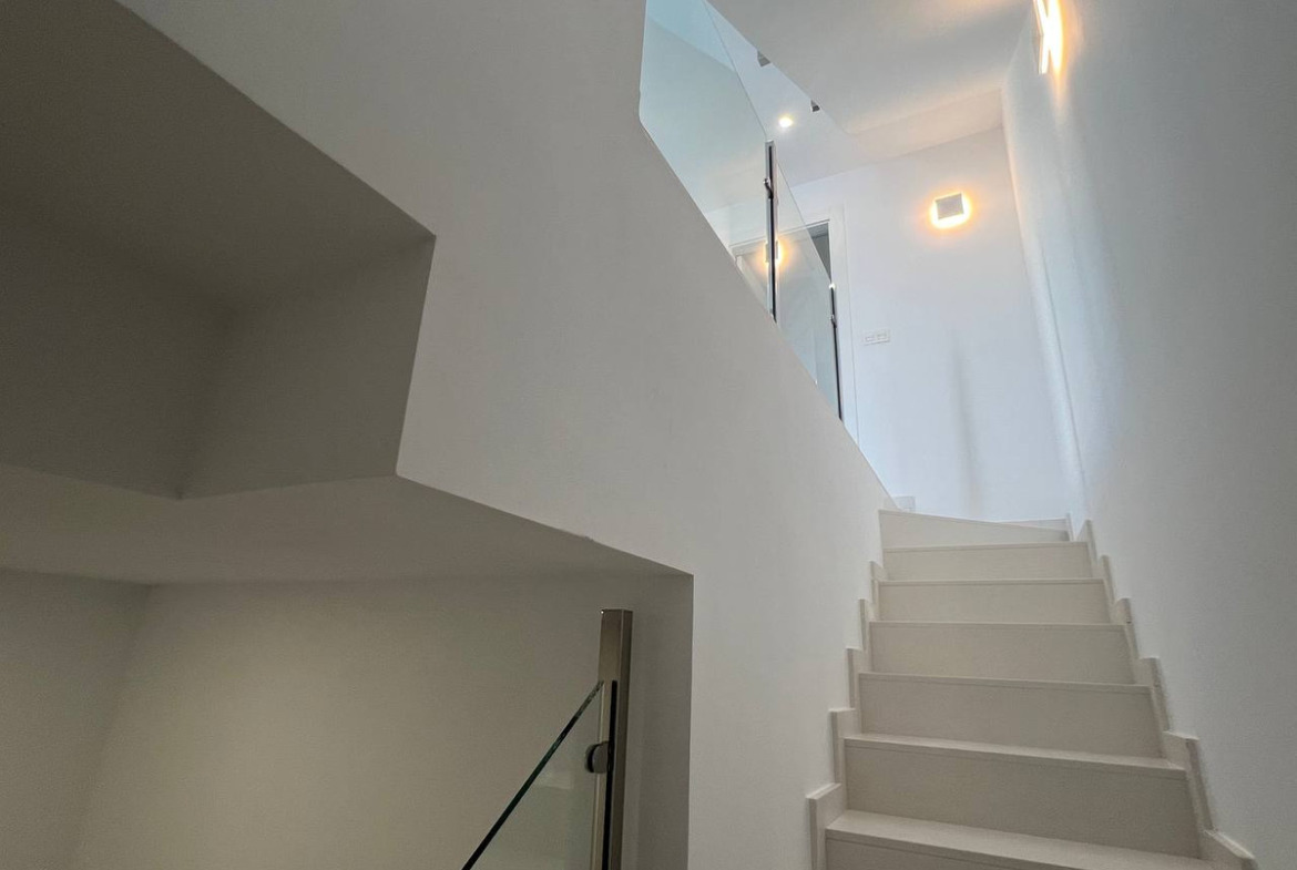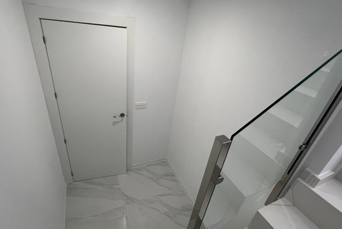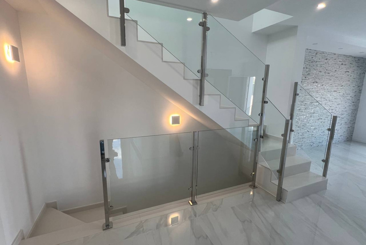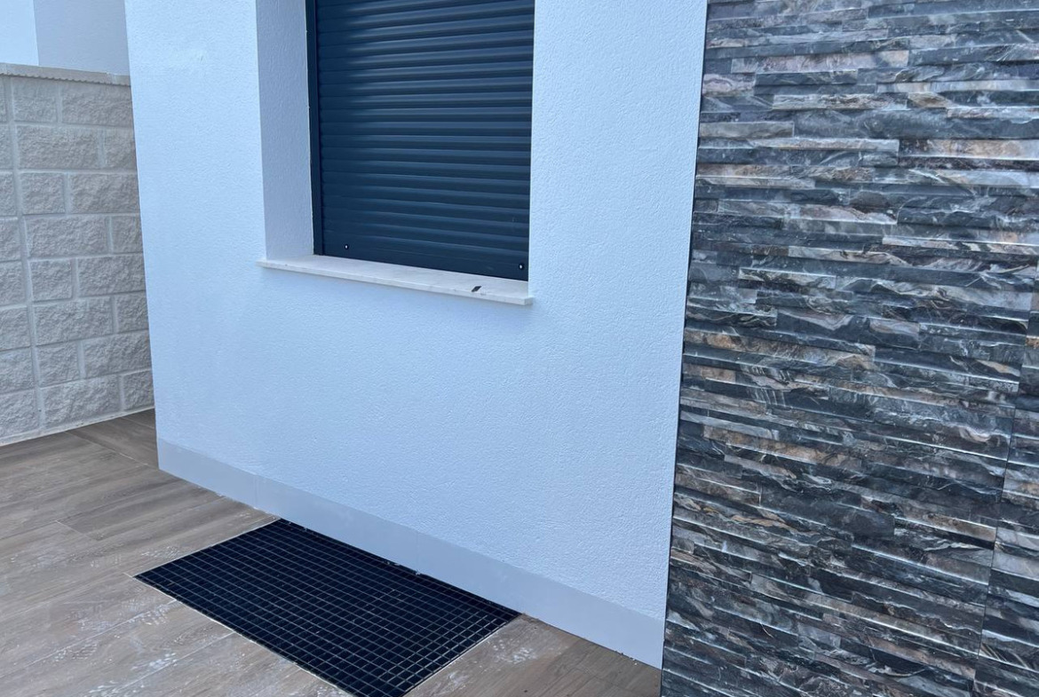 This modern property features a robust reinforced concrete structure and external walls constructed with ceramic double walls, incorporating an air chamber, thermal, and acoustic insulation through expanded polystyrene panels. The exterior boasts a monolayer white finish, complemented by stainless steel railings and safety glass for enhanced aesthetics and security. Inside, the spaces are finished with ceramic bricks, gypsum plaster, and smooth grey plastic paint, creating a clean, contemporary look. The exterior carpentry includes double glazing and aluminium shutters, while the interior doors are made of lacquered MDF in white. Fitted wardrobes with melamine boards provide ample storage space, with a coated interior for durability.