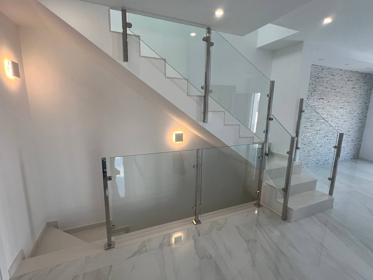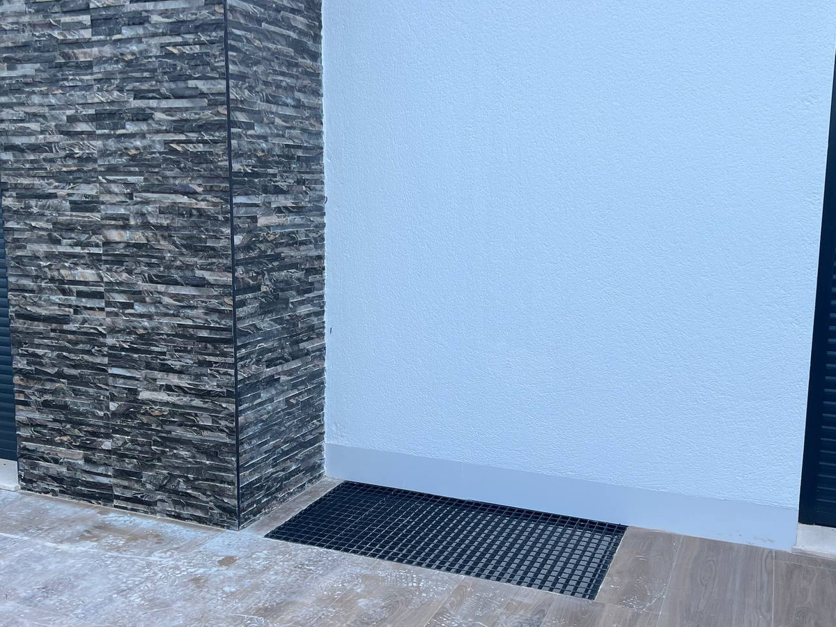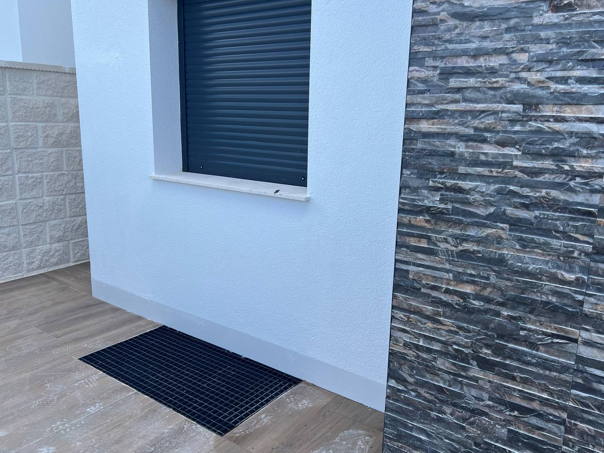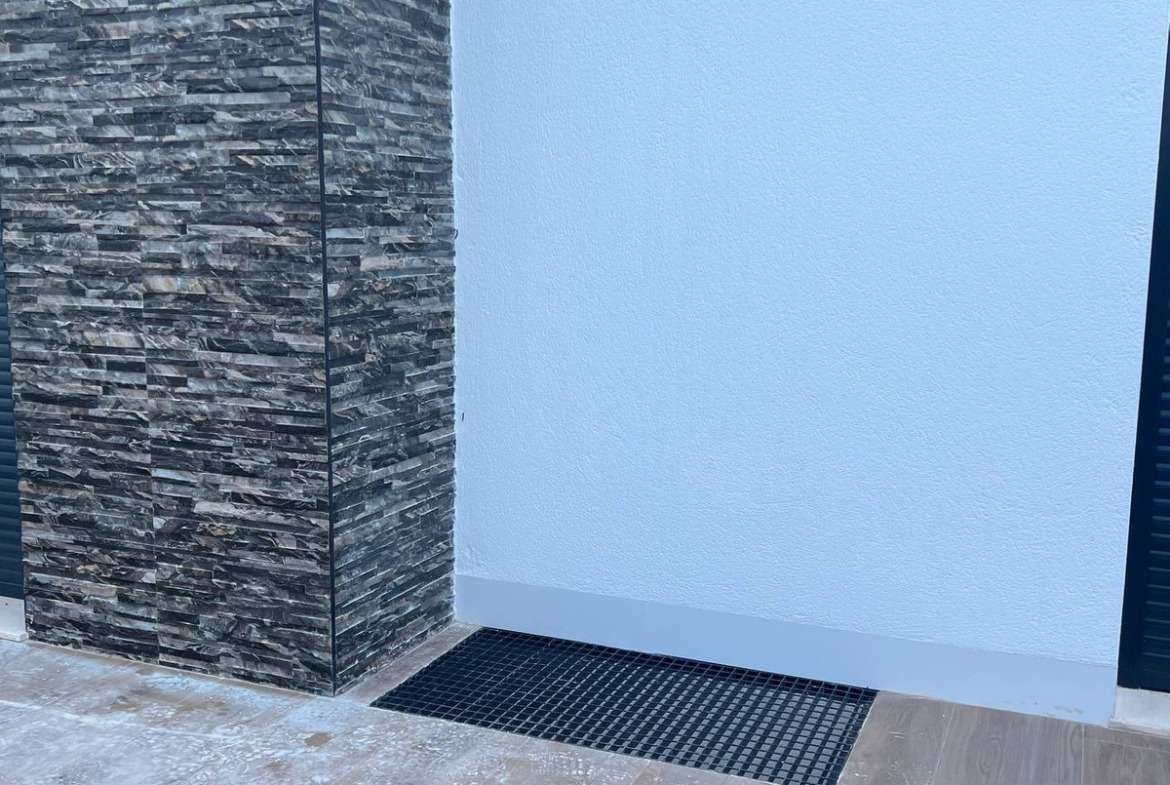 This modern property features a robust reinforced concrete structure and external walls constructed with ceramic double walls, incorporating an air chamber, thermal, and acoustic insulation through expanded polystyrene panels. The exterior boasts a monolayer white finish, complemented by stainless steel railings and safety glass for enhanced aesthetics and security. Inside, the spaces are finished with ceramic bricks, gypsum plaster, and smooth grey plastic paint, creating a clean, contemporary look. The exterior carpentry includes double glazing and aluminium shutters, while the interior doors are made of lacquered MDF in white. Fitted wardrobes with melamine boards provide ample storage space, with a coated interior for durability.