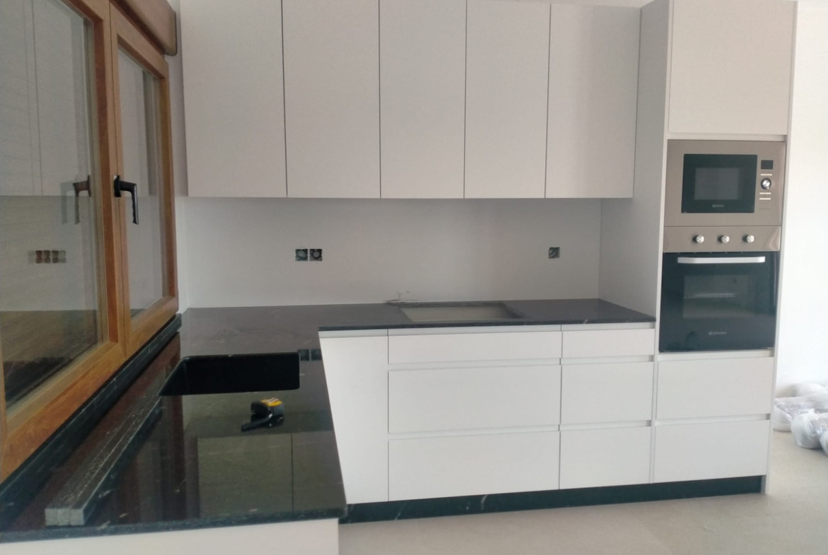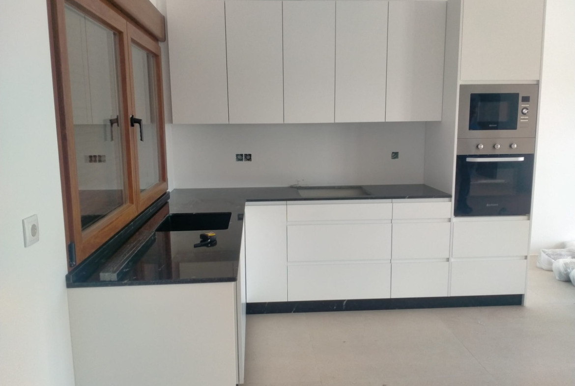 The interior is defined by sophisticated details, including white lacquered carpentry, while large double-glazed windows provide excellent natural light.