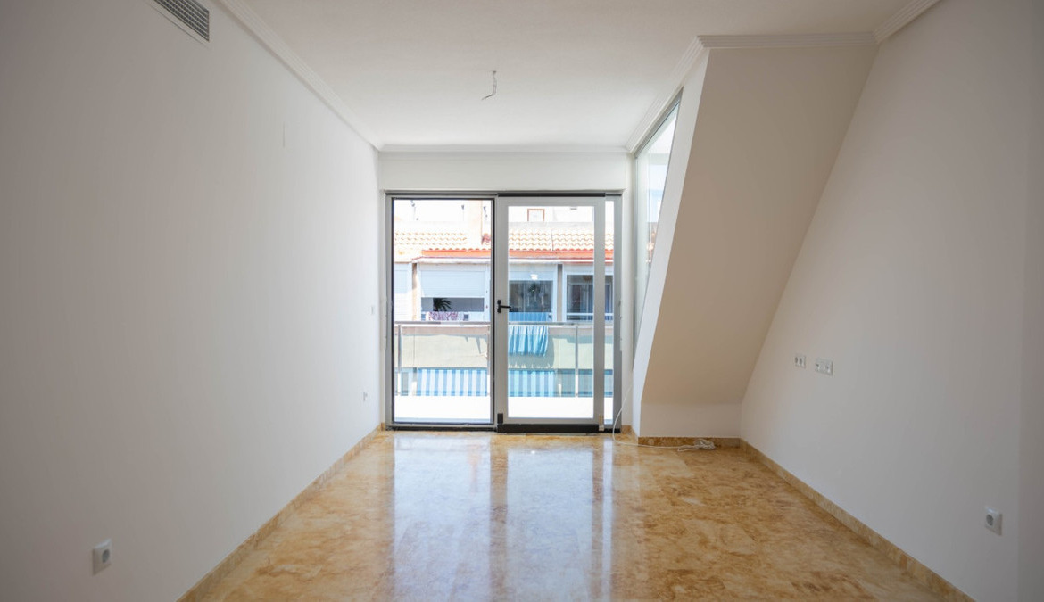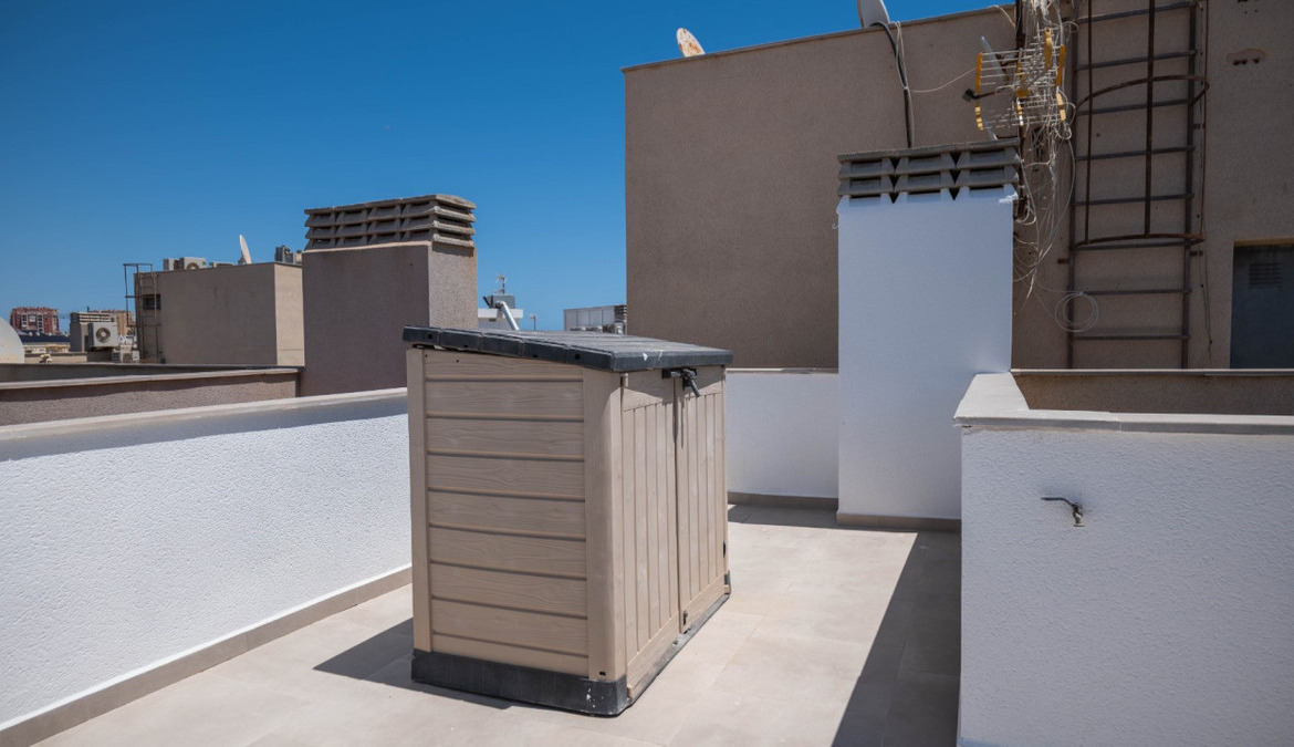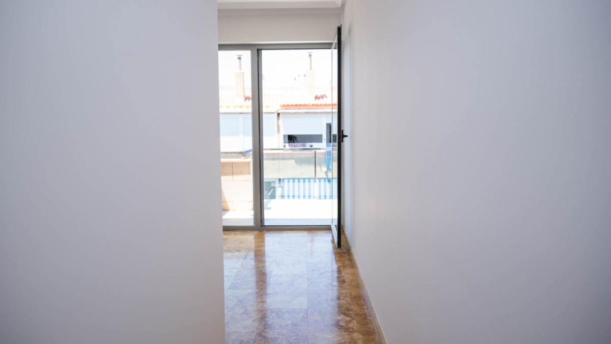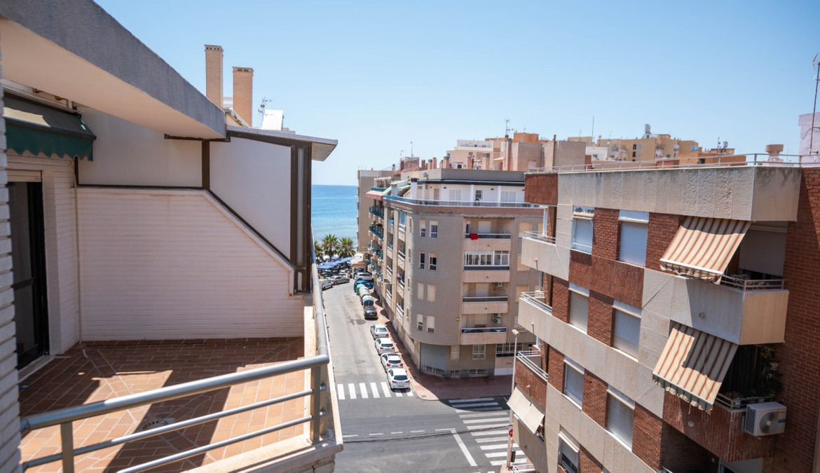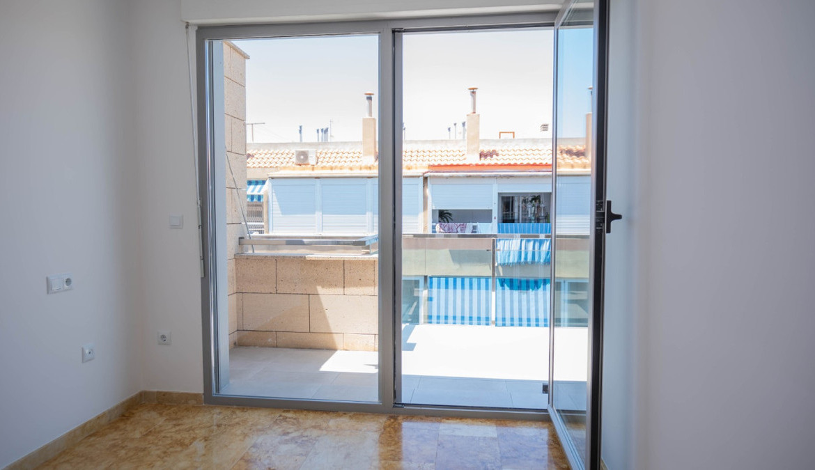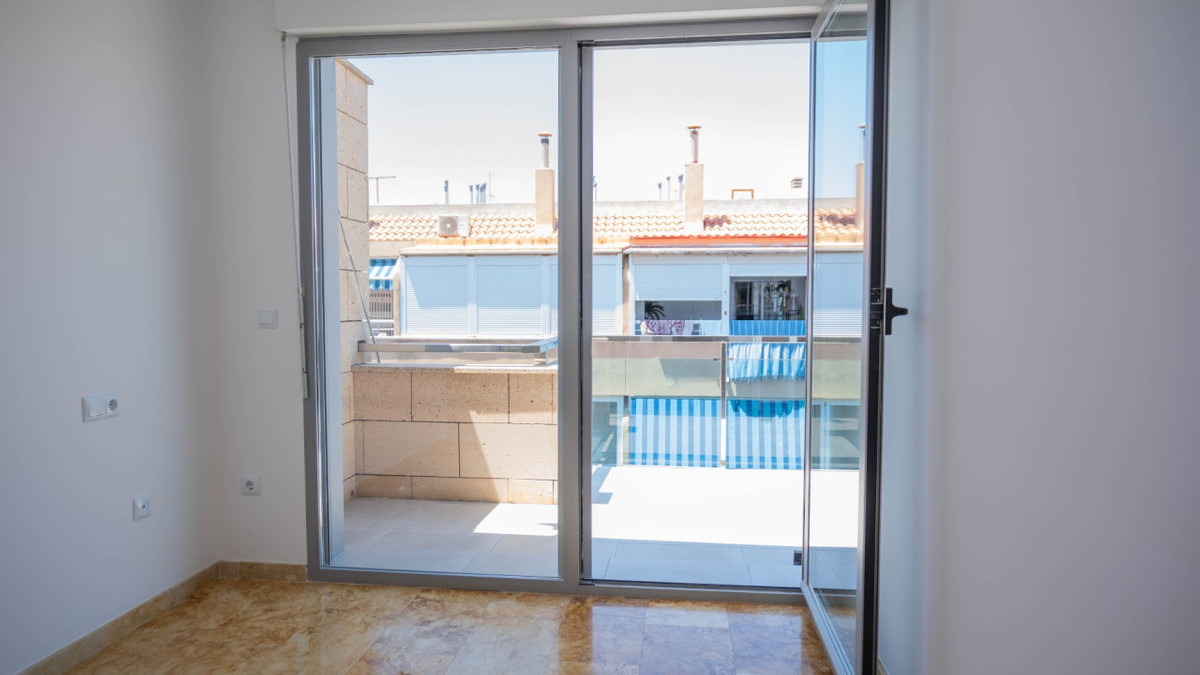 Penthouse with private solarium and communal pool on Los Locos beach in Torrevieja. With an area of approximately 94 m2 and just a few steps (50 meters) from the beach, this property is presented as an excellent opportunity to enjoy the coastal style to the fullest. The property has a bright double bedroom with a built-in wardrobe and direct access to the terrace; it also includes another single bedroom also equipped with a built-in wardrobe. The main bathroom is complete and includes a bathtub while the toilet offers a modern shower. Completely renovated with top quality materials, it features a fully equipped kitchen and modern white lacquered interior carpentry. Its north orientation ensures freshness during the warmest days, perfectly complemented by its porcelain floors that add elegance to the environment. Additional amenities include central air conditioning to ensure your comfort all year round. This building not only enjoys special attention to every detail but also offers magnificent side sea views from its private terrace or solarium, ideal for relaxing or entertaining under the Mediterranean sun. The extras are numerous: an accessible elevator to your front door, a bright terrace where you can enjoy plenty of natural light—and common spaces such as a community pool perfect for both kids and adults to enjoy the best of summer together. Located surrounded by all necessary services including nearby supermarkets, and prominent medical centers along with schools, shops, easy transportation available thanks to the adjacent bus stops. Designed with quality of family life in mind, here is your perfect ultimate vacation home.