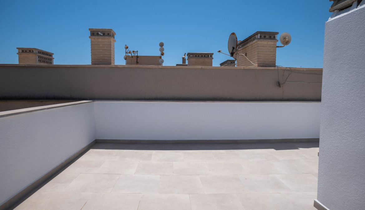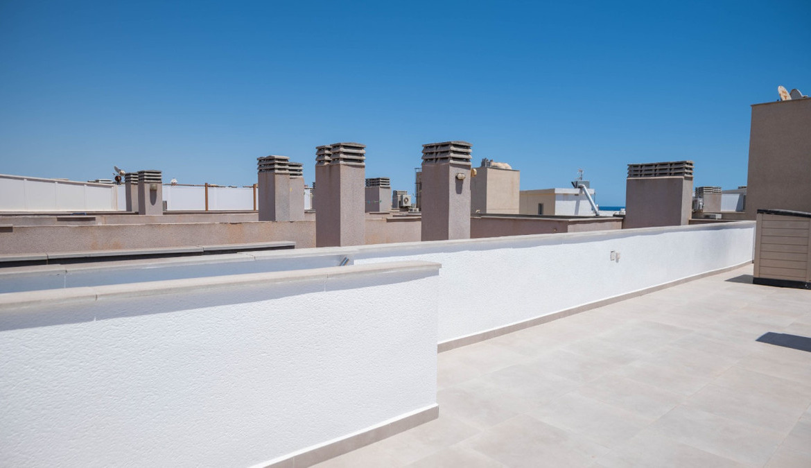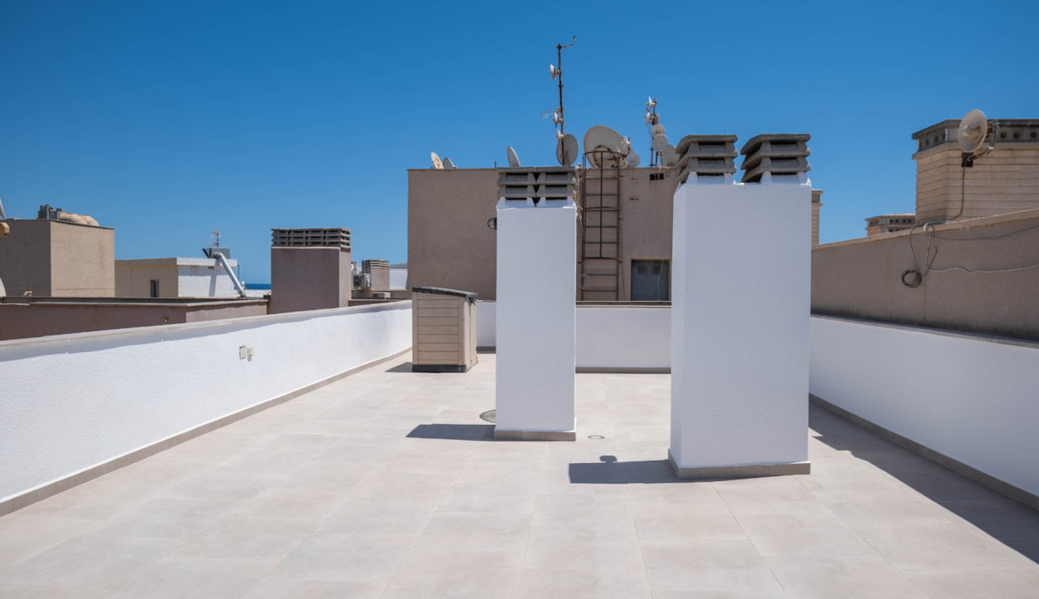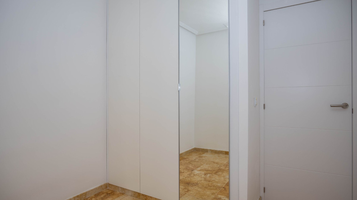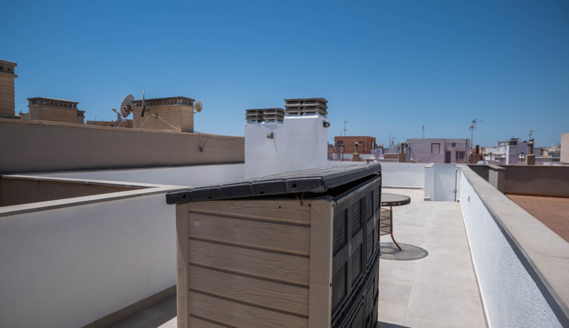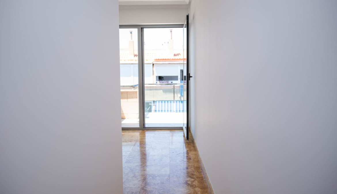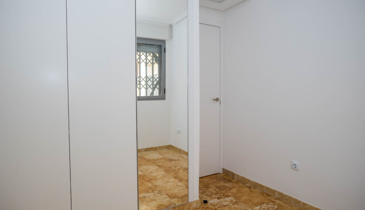 Penthouse with private solarium and communal pool on Los Locos beach in Torrevieja. With an area of approximately 94 m2 and just a few steps (50 meters) from the beach, this property is presented as an excellent opportunity to enjoy the coastal style to the fullest. The property has a bright double bedroom with a built-in wardrobe and direct access to the terrace; it also includes another single bedroom also equipped with a built-in wardrobe. The main bathroom is complete and includes a bathtub while the toilet offers a modern shower. Completely renovated with top quality materials, it features a fully equipped kitchen and modern white lacquered interior carpentry. Its north orientation ensures freshness during the warmest days, perfectly complemented by its porcelain floors that add elegance to the environment. Additional amenities include central air conditioning to ensure your comfort all year round. This building not only enjoys special attention to every detail but also offers magnificent side sea views from its private terrace or solarium, ideal for relaxing or entertaining under the Mediterranean sun. The extras are numerous: an accessible elevator to your front door, a bright terrace where you can enjoy plenty of natural light—and common spaces such as a community pool perfect for both kids and adults to enjoy the best of summer together. Located surrounded by all necessary services including nearby supermarkets, and prominent medical centers along with schools, shops, easy transportation available thanks to the adjacent bus stops. Designed with quality of family life in mind, here is your perfect ultimate vacation home.