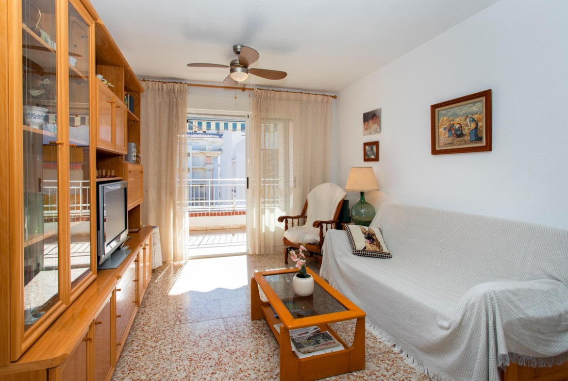Built area of 88 m² with three bedrooms, one full bathroom and one guest toilet. The layout includes an entrance hall, a separate kitchen with an adjoining utility/pantry room, and a living–dining area with direct access to a large south-facing terrace. The terrace includes a private storage room suitable for outdoor items and beach equipment. The apartment is located on the 4th floor of a building with lift access.